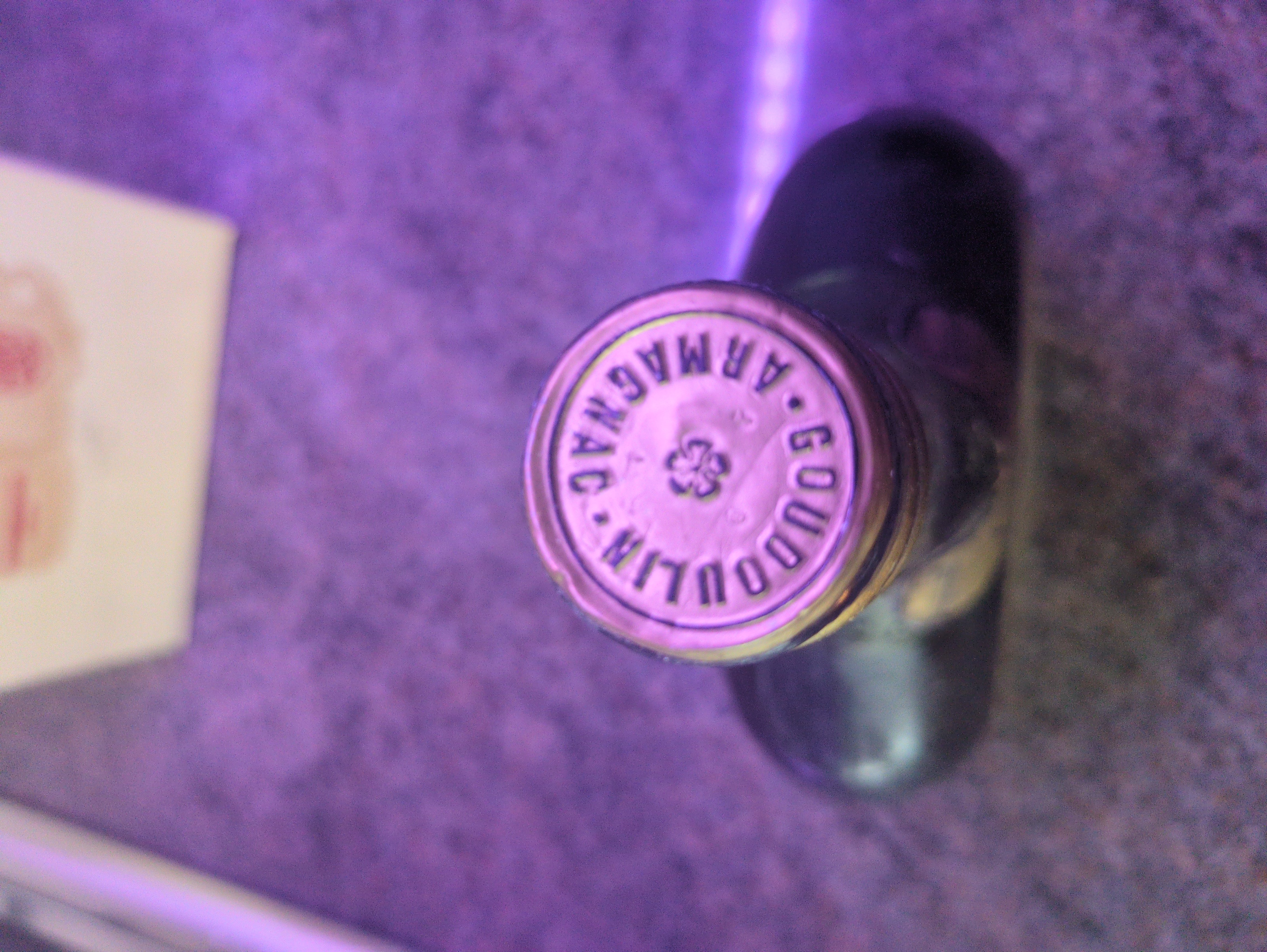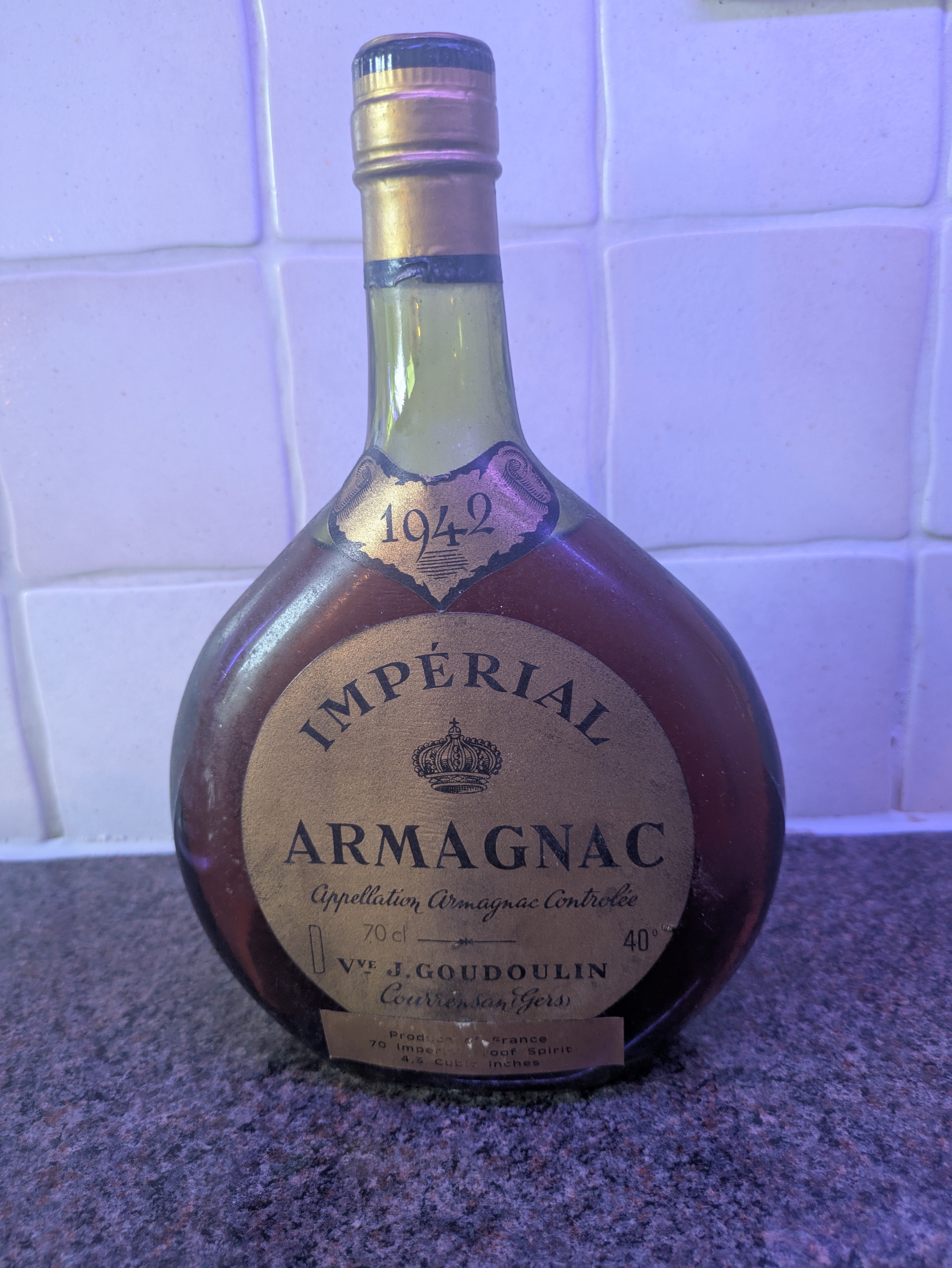 - 1) Text on label: Upper label (heart-shaped): 1942 Mid label (main part): IMPÉRIAL ARMAGNAC Appellation Armagnac Controlée 70 cl 40° VVE J. GOUDOULIN Courrensan (Gers) Lower label (strip label): Produce of France 70 Imperial Proof Spirit 4.5 Cubic Inches 2) Visual elements: Neck/Capsule: A gold foil capsule covers the cork and neck, with black bands at the very top and near the base of the capsule. Upper label: A heart-shaped gold label is on the upper part of the bottle neck, featuring the year "1942" in a decorative serif font and ornate swirling patterns on its upper edges. Mid label: The main, large, roughly semi-circular gold label on the body of the bottle. It features a detailed crown emblem centrally. The words "IMPÉRIAL" and "ARMAGNAC" are in a bold, classic serif font. "Appellation Armagnac Controlée" and "VVE J. GOUDOULIN" use a smaller, elegant serif font, while "Courrensan (Gers)" is in a graceful cursive/script font. Lower label: A small, rectangular strip label below the main label, with light text on a dark background, using a simple sans-serif font. 3) Fill level estimate: well above shoulder into neck: great