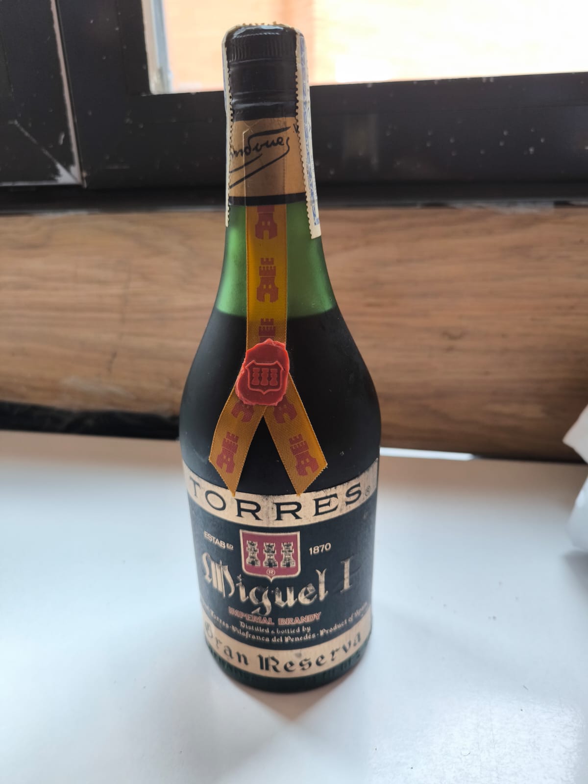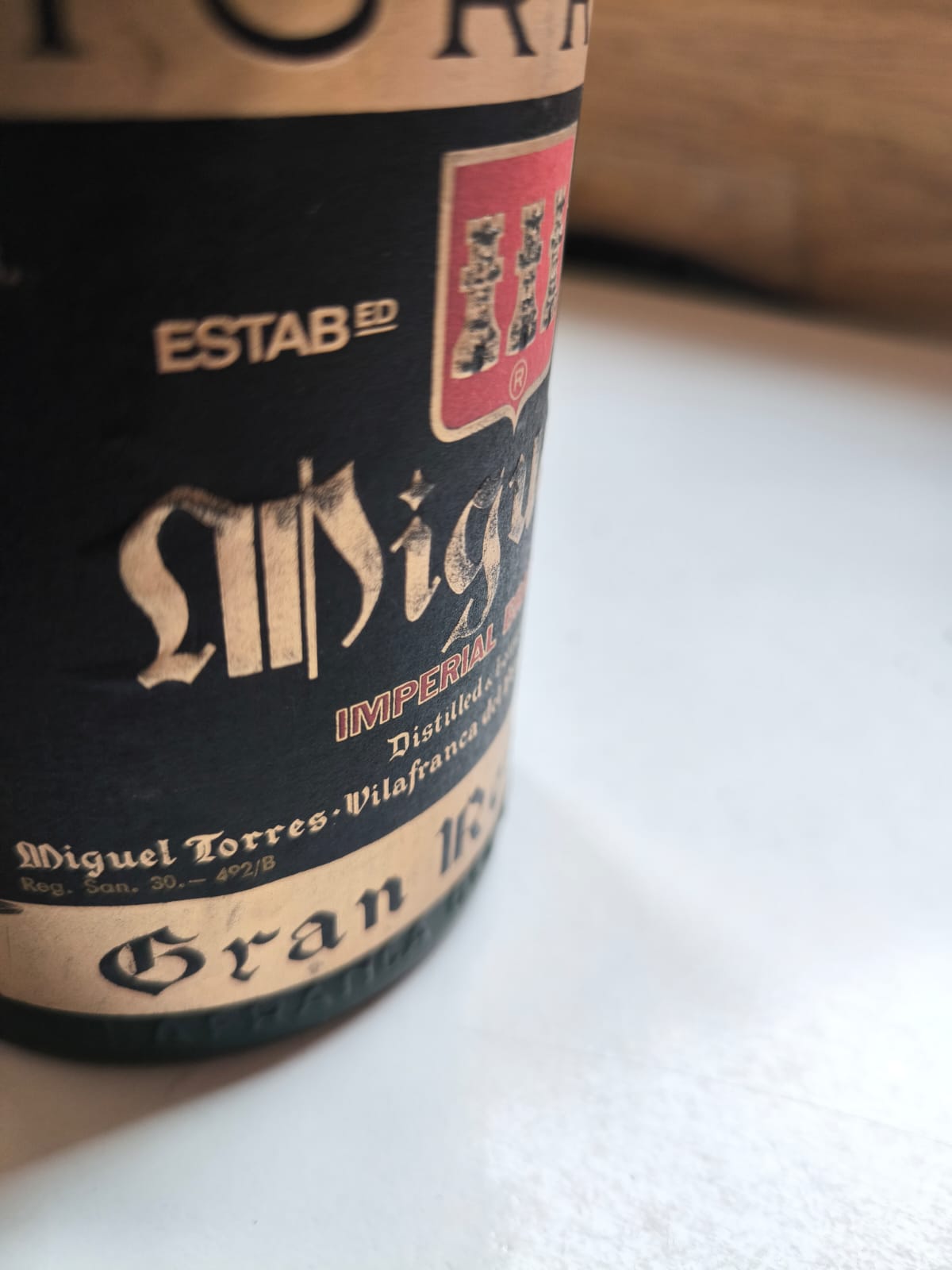 - 1) Text on label: TORRES ESTAB 1870 Miguel I® IMPERIAL BRANDY Distilled & bottled by Torres-Vilafranca del Penedés - Product of Spain Gran Reserva Note: The cursive signature on the neck's gold strip label is not fully discernible. 2) Visual elements: Neck/Capsule: A gold-colored vertically oriented strip label with a faded cursive signature (partially visible) and a faint white/light blue strip label (possibly a tax band) on the side. Ribbon: A yellow/gold fabric ribbon, printed with repeating red three-tower emblems, is draped around the bottle's neck and upper shoulder. Wax Seal: A red wax-like seal, also featuring the three-tower emblem, is affixed to the ribbon at the front of the bottle. Mid Label: A prominent shield emblem displaying three red towers is centered on the main label. Font Styles: "TORRES": Block, sans-serif, uppercase. "ESTAB", "1870", "IMPERIAL BRANDY", "Distilled & bottled by", "Torres-Vilafranca del Penedés - Product of Spain": Small sans-serif/block. "Miguel I": Decorative script with flourishes. "Gran Reserva": Cursive/script. 3) Fill level estimate: above shoulder: good