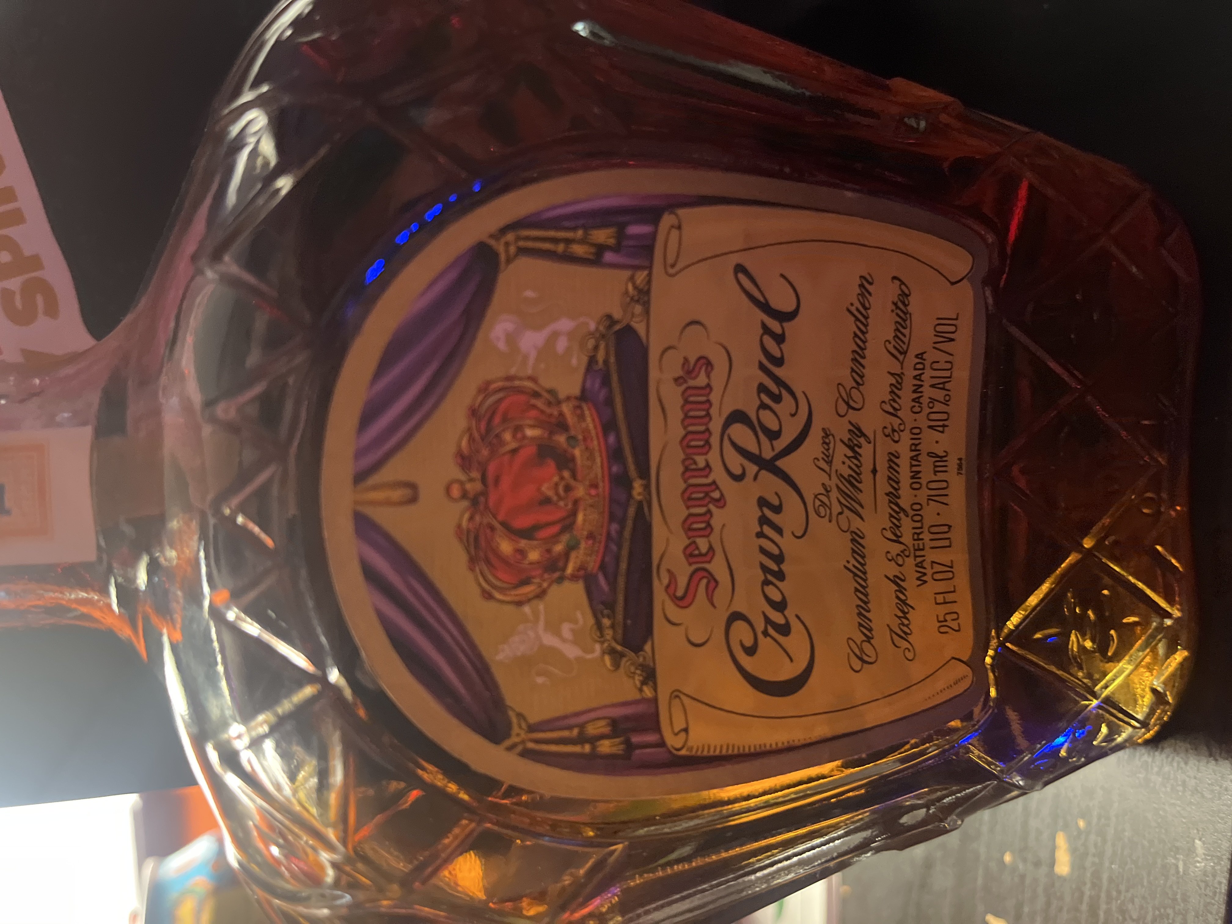 - 1) Text on label: Neck strip (partial, from left to right and top to bottom): BY AUTHORITY OF THE MINISTER OF NATIONAL REVENUE EXCISE 1968 PRODUCT OF CANADA DEPUTY MINISTER Main label: Seagram's Crown Royal De Luxe Canadian Whisky Canadien Joseph E. Seagram & Sons Limited WATERLOO ONTARIO CANADA 25 FL. OZ. LIQ. • 710 mL • 40% ALC/VOL 7564 2) Visual elements: Bottle: Clear glass bottle with faceted, diamond-cut patterns across its body and shoulders. Neck/Cap: A gold-colored, ornate foil wrap covers the top of the cork and neck, featuring embossed patterns. Neck strip: A rectangular paper tax band, predominantly white/off-white with orange borders and blue text "1968" in the center, wraps around the neck and cork. Mid label: This is the main label, with an irregular scroll-like shape and gold trim. It features purple draped curtains with gold tassels at the top. Below the curtains, an ornate red and gold crown rests on a purple cushion with gold accents. Two stylized white rampant creatures (possibly lions or unicorns) are visible on either side of the crown, set against a yellow background. Font styles: The main brand names ("Seagram's", "Crown Royal") are in an elaborate script/cursive style. "De Luxe" and "Canadian Whisky Canadien" use an elegant serif/script. The producer details, location, and volume/alcohol content are primarily in sans-serif, block-like fonts. 3) Fill level estimate: well above shoulder into neck: great