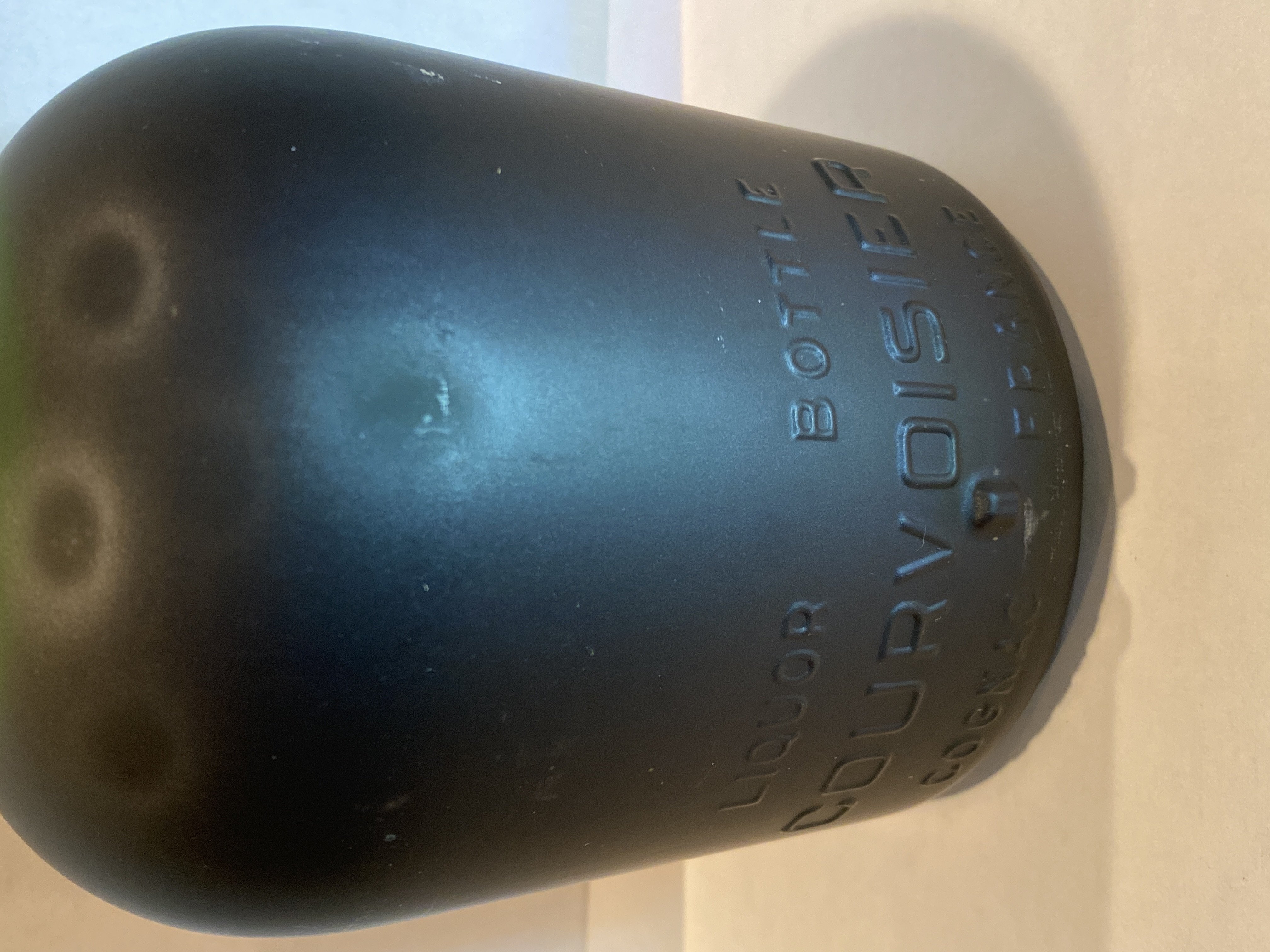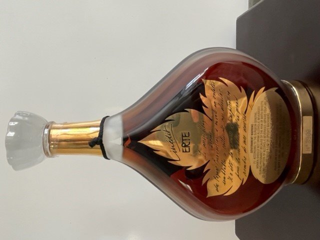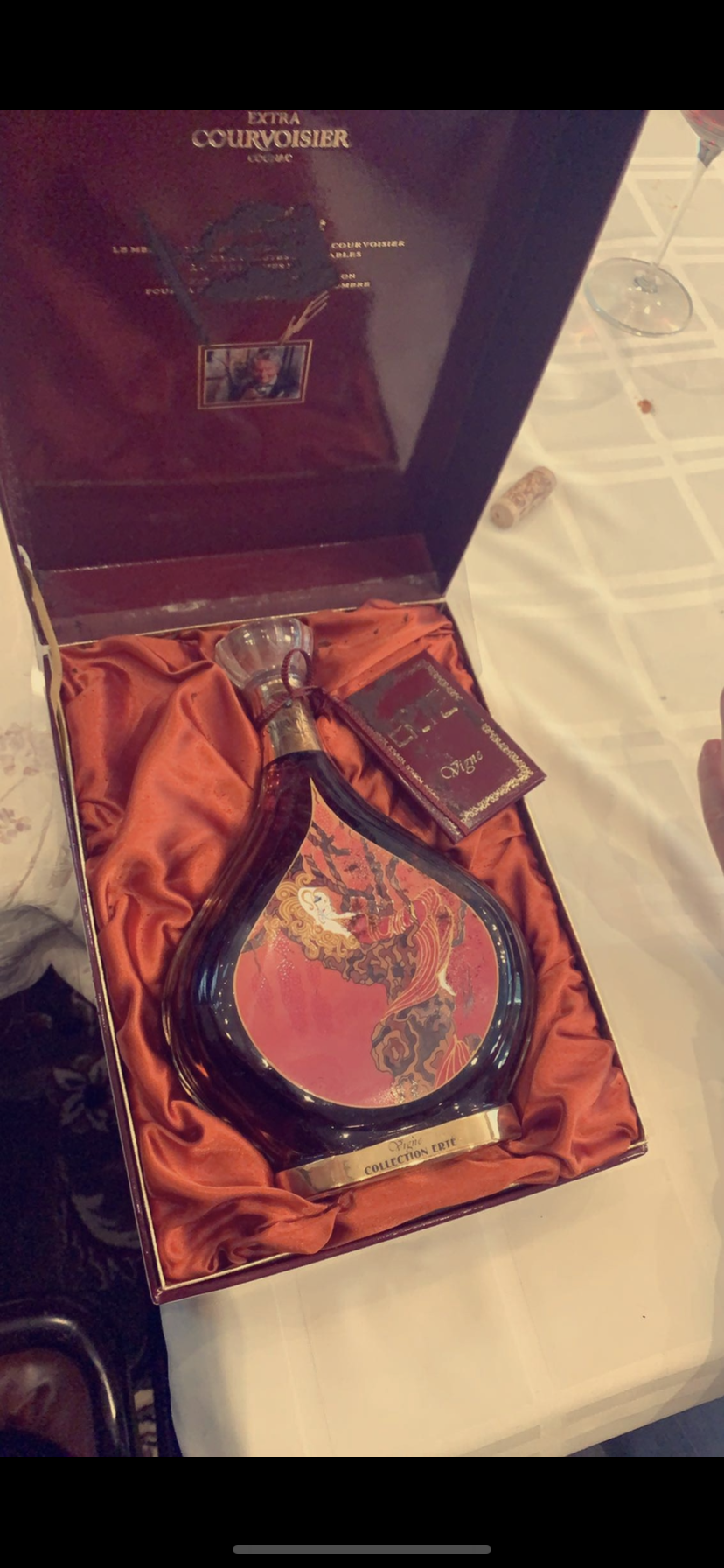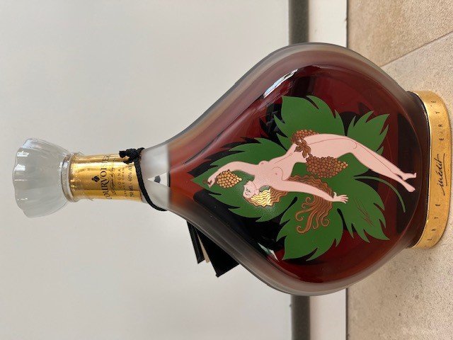 - Bottle neck reads "Courvoisier" cognac 750 ml - 40%; Btl. front - Beautiful pic of Lady embracing the grapes, bottom or base - Erte / inedit / Erte