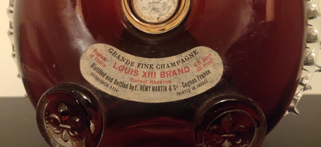 - GRANDE FINE CHAMPAGNE LOUIS XIII BRAND Rarest Reserve Produce of France 4/5 Quart 80 Proof Distilled and Bottled by E. REMY MARTIN & Co - Cognac France ESTABLISHED 1724 PRINTED IN FRANCE