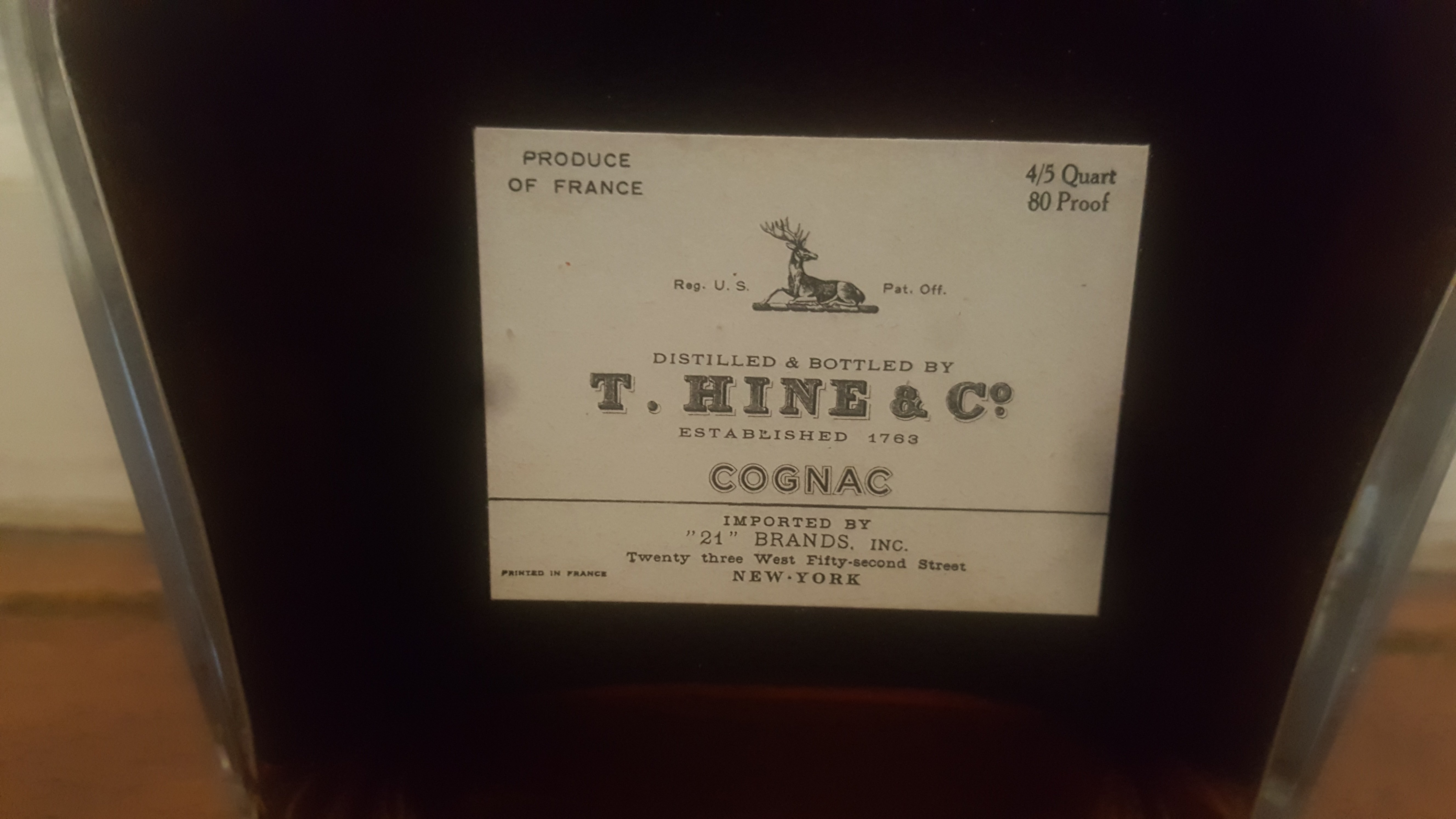 - Selection, Produce of France, 4/5 Quart 80 proof: Reg US Pat Off Distilled & Bottled By T. HINE & Co Established 1763 COGNAC imported By "21" BRANDS, INC Twenty-three West Fifty-second Street NEW YORK PRODUCT OF FRANCE