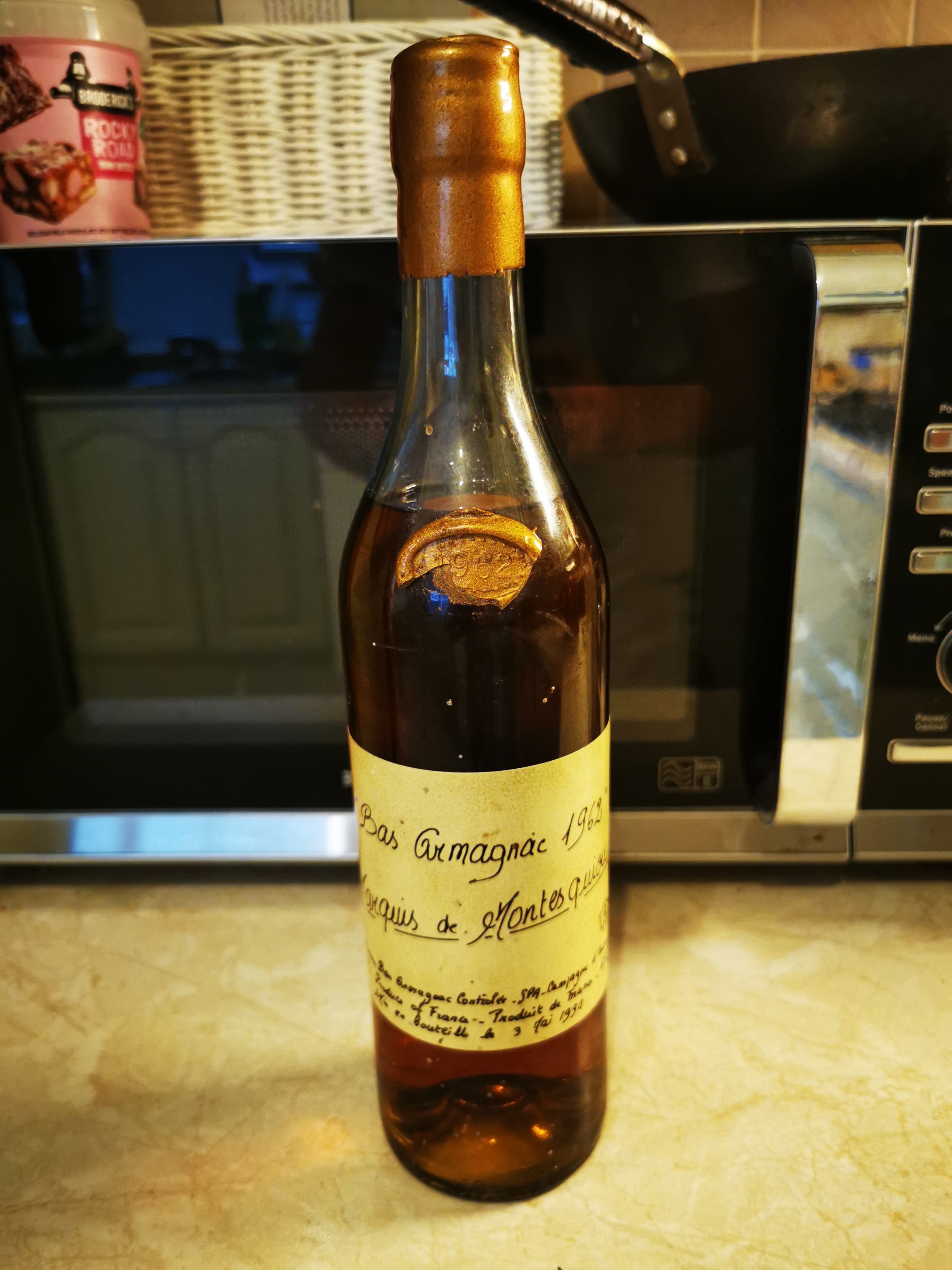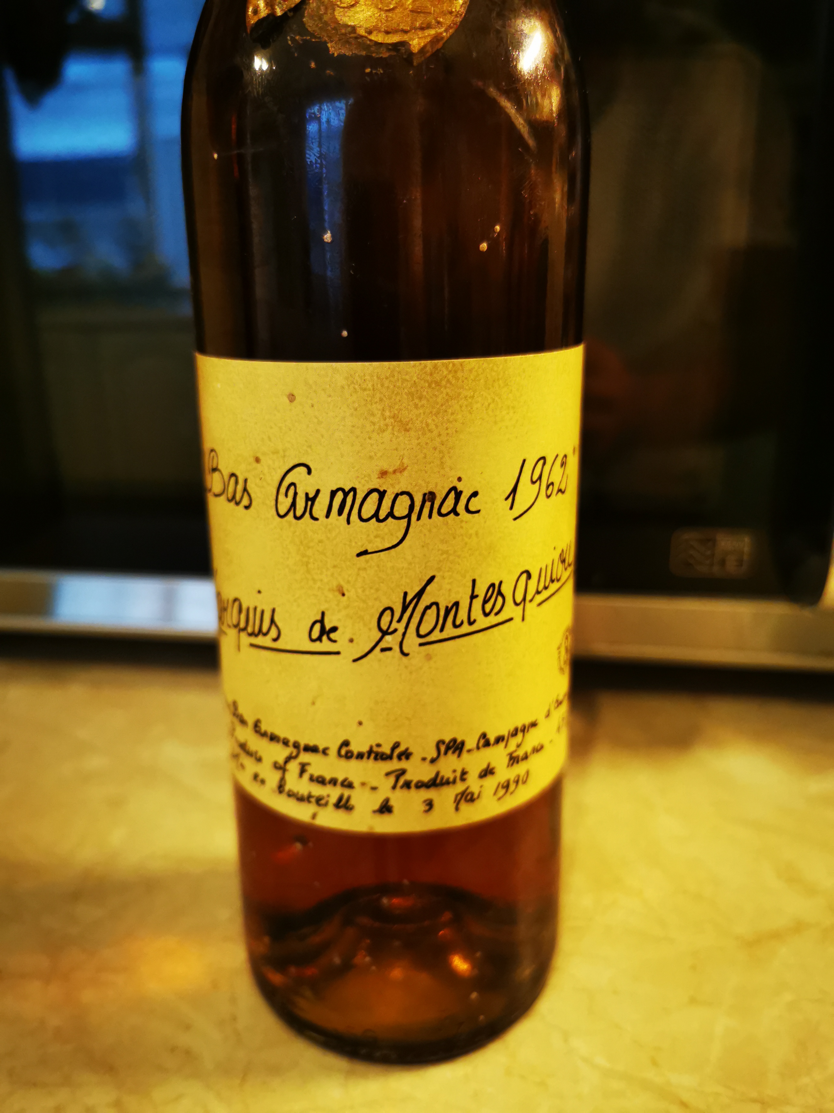 - 1) Text on label: Bas Armagnac 1962 Marquis de Montesquiou Ce Bas Armagnac distillé sur la propriété du Marquis de Montesquiou à St. Amour dans le Gers en France - Traduit de barrique en bouteille le 3 Mai 1990 2) Visual elements: Cork/Capsule: A textured, metallic gold capsule covers the cork and extends about a third of the way down the neck. Top of Capsule: An embossed medallion or seal featuring a crest-like emblem, possibly crowned, is visible on the very top. Mid-Bottle (glass embossing): A circular, raised glass seal is present on the front of the bottle, just below the shoulder, depicting a coat of arms or detailed emblem. Main Label: A plain, rectangular, yellowed paper label. Font style(s): The text on the main label is in a cursive/script handwriting style. The embossed elements are decorative/emblematic. 3) Fill level estimate: well above shoulder into neck: great