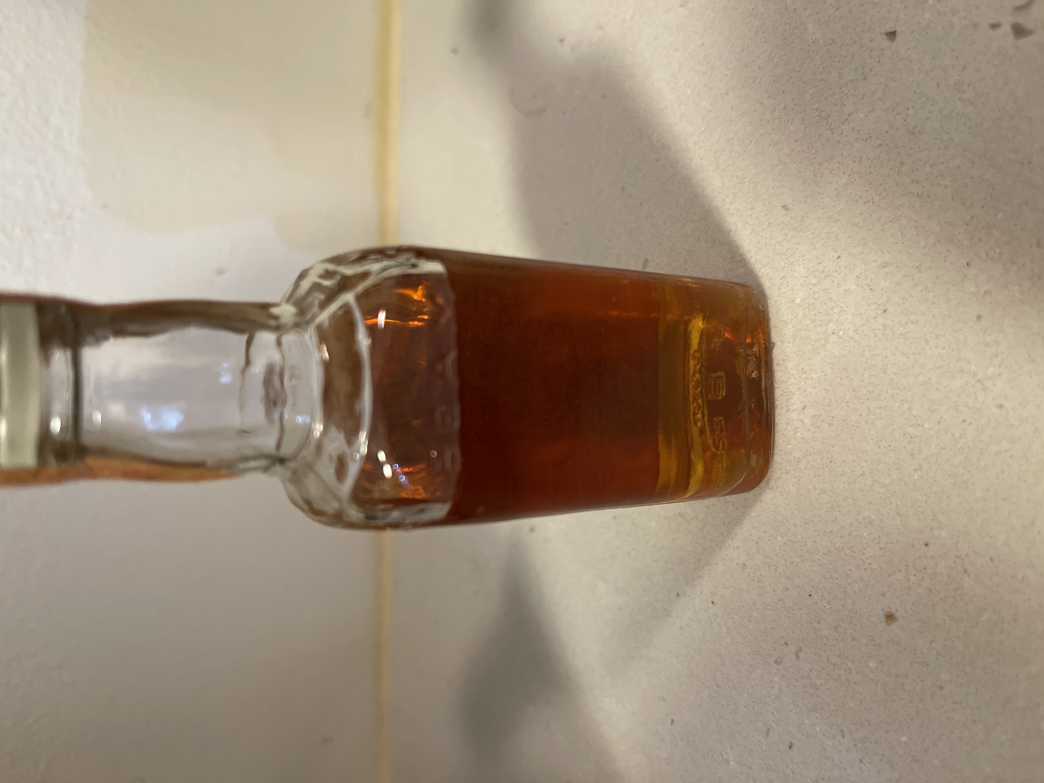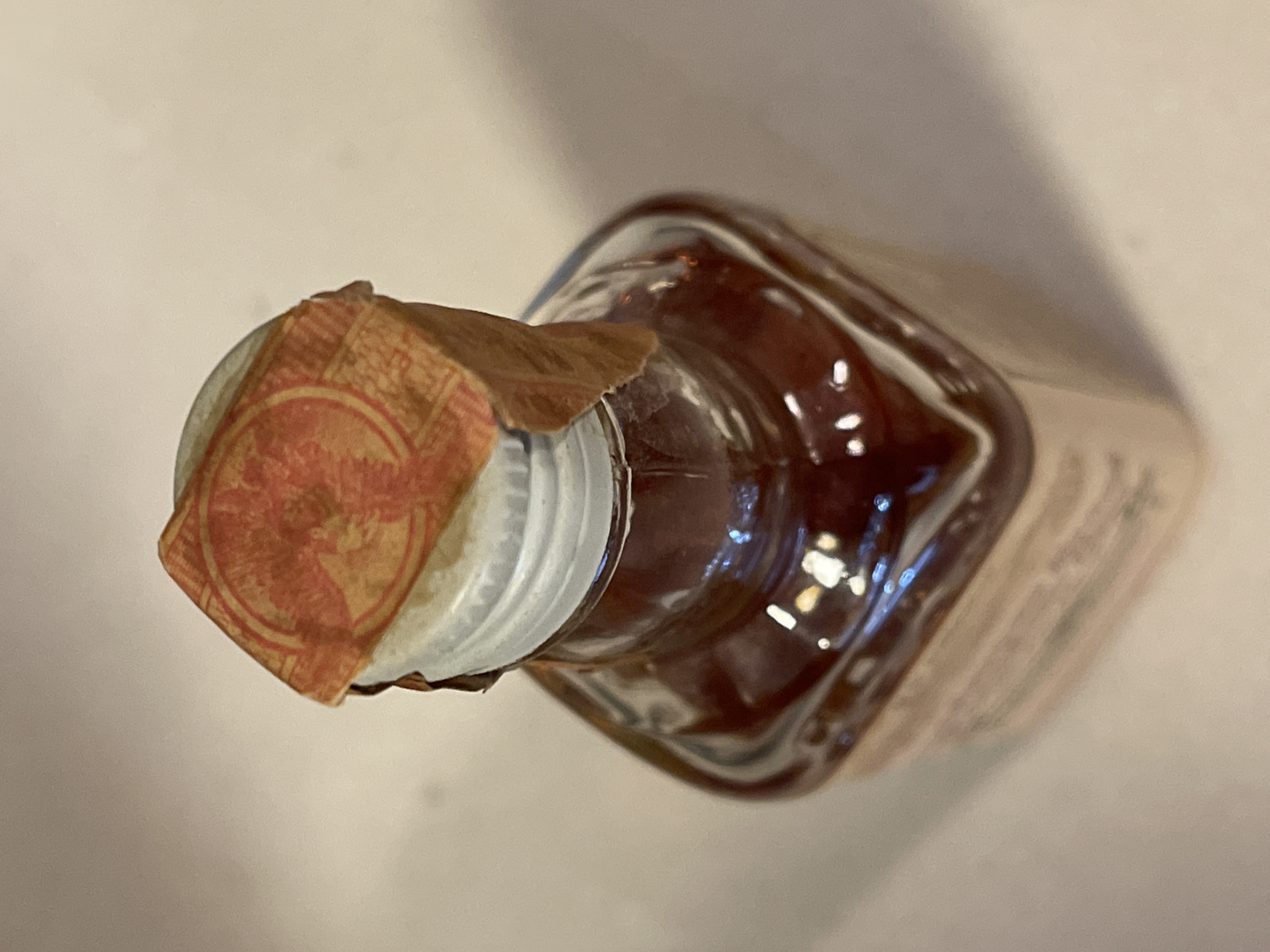 - 1) Text on label: Bottle - Neck Label (Diamond-shaped) 13 SUMMERS OLD SUPERIOR QUALITY FOR MEDICAL USE Bottle - Front Main Label J. P. Dougherty's Sons Philadelphia Pennsylvania Bottled in Bond Distillery No 2 1st Dist of Penna Produced by A Overholt & Co Distillery No 3 23rd Dist of Pa Bottle - Front Emblem (Circular, on main label) J. P. DOUGHERTY'S SONS PURE RYE WHISKEY PHILADELPHIA Bottle - Back Label U. S. GOVERNMENT BOTTLED IN BOND 100 PROOF CAUTION! NOTICE! This tax paid bottle has been filled with 100 proof pure whiskey, and then sealed at the distillery under Government supervision, and is not to be refilled. It is a penal offense to reuse this bottle for the sale of any alcoholic beverage. The price to the consumer of the contents of this bottle is fixed by a Government price schedule. DOUGHERTY DISTILLERY WAREHOUSE COMPANY, INC. WHISKEY - ONE PINT - 93005-100 Bottle - Federal Tax Strip (Neck, partially visible) SERIES 111 1930 FALL 1916 100 PROOF U.S. BOTTLED IN BOND Box - Front Panel J. P. DOUGHERTY'S SONS PURE RYE WHISKEY (Reproduced bottle's Front Main Label text): J. P. Dougherty's Sons Philadelphia Pennsylvania Bottled in Bond Distillery No 2 1st Dist of Penna Produced by A Overholt & Co Distillery No 3 23rd Dist of Pa (Reproduced bottle's Front Emblem text): J. P. DOUGHERTY'S SONS PURE RYE WHISKEY PHILADELPHIA DOUGHERTY DISTILLERY WAREHOUSE COMPANY, INC. 2) Visual elements: Capsule/Neck: Silver screw cap. Gold foil/paper seal, heavily deteriorated, covers the cap and top of the neck. A deteriorated paper federal tax strip (green/gold with red print) is wrapped around the cap and neck. Upper Neck Label: A diamond-shaped label displays "13 SUMMERS OLD" with block/sans-serif fonts, and smaller serif font for "SUPERIOR QUALITY FOR MEDICAL USE". Front Main Label: A rectangular, aged parchment-colored label. The company name, location, and distillery details are presented in a cursive/script font. Front Emblem: A circular emblem is located on the lower left of the front main label. It features text in a curved block/sans-serif style, surrounding a small, indistinct central crest. Back Label: A dark rectangular label features bold block/sans-serif fonts for headings and a small, dense serif font for the detailed legal text. Box: The box is predominantly red and black, with prominent branding text in large, bold block/sans-serif fonts. It also features a reproduced version of the bottle's front main label and emblem. 3) Fill level: not so great, pretty low