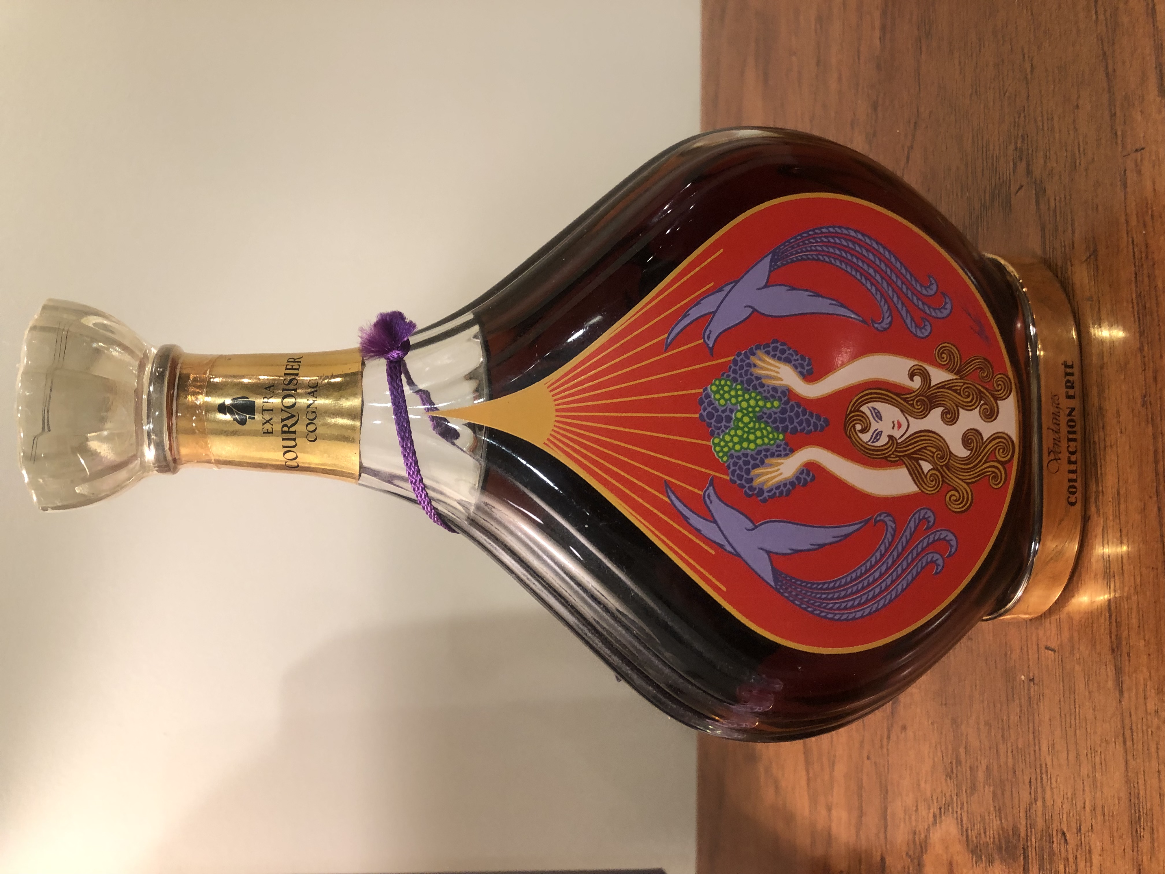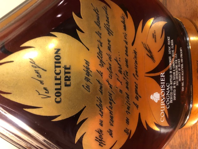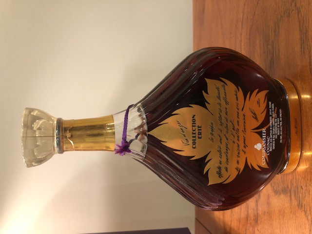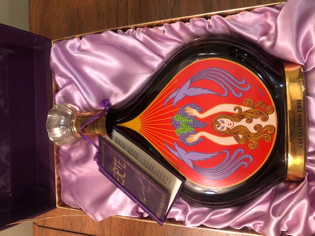 - 1) Text on label: On the Bottle: Neck Label: EXTRA COURVOISIER COGNAC Front Label (within main illustration): Vendanges COLLECTION ERTÉ Back Label (gold leaf shape): Vendanges COLLECTION ERTÉ Les 9 grappes offrent au soleil dont le reflet et le destin des vendanges, et celui de mon offrande à l'art... De ces raisins naîtra une eau de vie ambrée: le cognac Courvoisier. COURVOISIER COGNAC PRODUCED AND BOTTLED BY COURVOISIER - JARNAC, FRANCE IMPORTED BY W.A. TAYLOR & CO., MIAMI, FLORIDA SOLE DISTRIBUTORS FOR U.S.A. PRODUCT OF FRANCE 750 ML 40% ALC./VOL. (80 PROOF) DESIGN 1988 N° 000188 Lower Label (gold band on base): Vendanges COLLECTION ERTÉ Hangtag: ERTÉ On the Box: Outer Front: EXTRA COURVOISIER COGNAC Vendanges COLLECTION ERTÉ Inner Lid: EXTRA COURVOISIER COGNAC Vendanges COLLECTION ERTÉ LE MERVEILLEUX DU GRAND COGNAC COURVOISIER EST LIÉ À CELUI DE NOS VIGNES, À LA PASSION D'UNE PRÉPARATION PERPÉTUÉE DE PÈRE EN FILS, À LA CRÉATION DE MES ŒUVRES DE NÉE & SUIVIE. 2) Visual elements: Bottle: Distinctive, flat, ovaloid body with fluted sides, a slender neck, and a gold-colored base band. Cork/Capsule: Gold foil capsule under a clear, fluted glass stopper. Neck Label: Gold background featuring a black Napoleon silhouette emblem on horseback. Text in black serif font. Mid label (Front): Predominantly red background with an art-deco style illustration by Erte: a woman with flowing golden hair holding green and purple grapes, flanked by two purple birds, with golden sun rays. "Vendanges" in a decorative script font, "COLLECTION ERTÉ" in a serif font, and Erte's signature in script. Mid label (Back): Gold, shaped like a vine leaf. Features a poem in cursive/script font. Product details and numerical information in a sans-serif font. Erte's signature in script. Lower label (Base): Gold band repeating "Vendanges COLLECTION ERTÉ" in decorative/serif fonts, with Erte's signature in script. Hangtag: Purple card with "ERTÉ" in a prominent serif font. Box: Deep purple presentation box with a satin lining. Features the Napoleon emblem, a framed version of Erte's illustration (similar to the bottle's front label), and text in serif and decorative script fonts. The interior includes additional text (a poem) and a small photo of Erte. 3) Fill level estimate: well above shoulder into neck: great