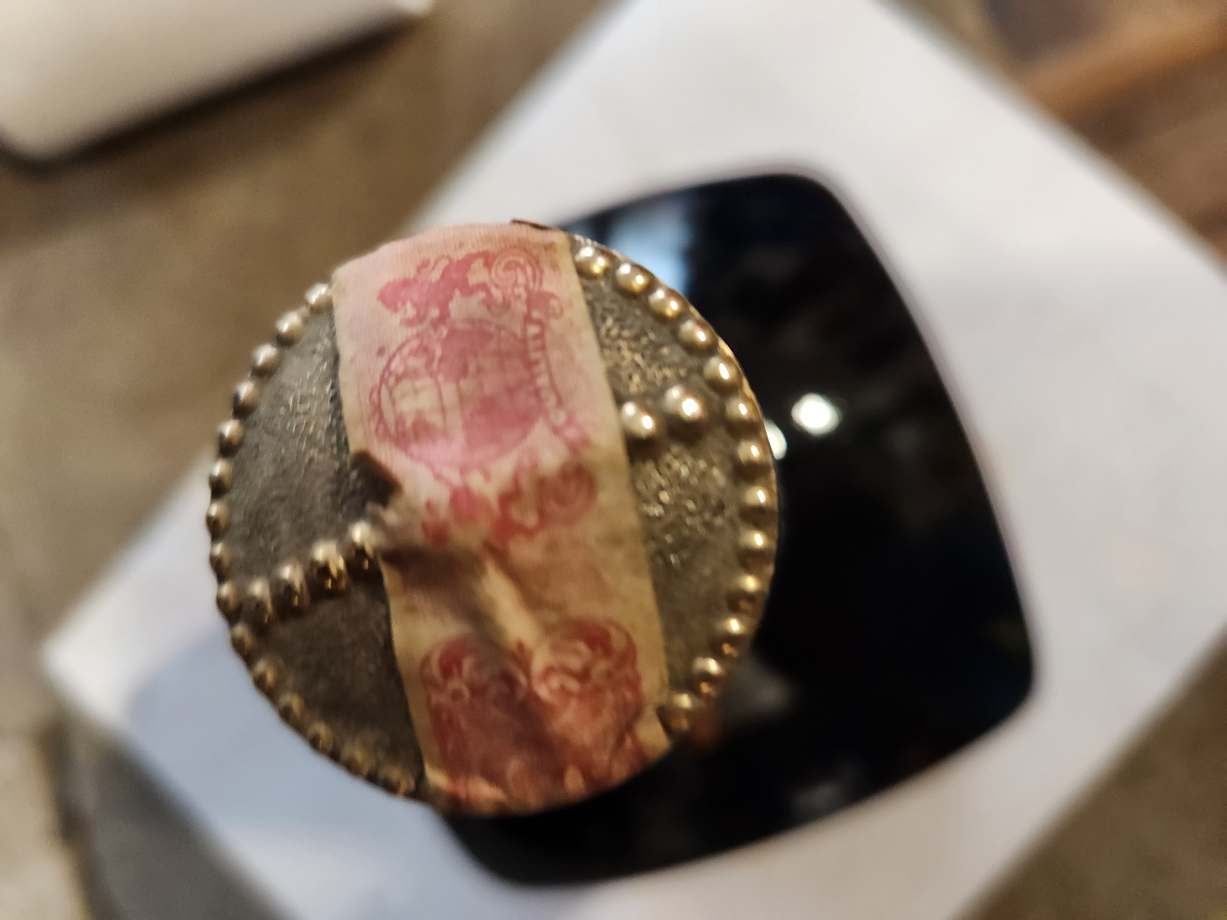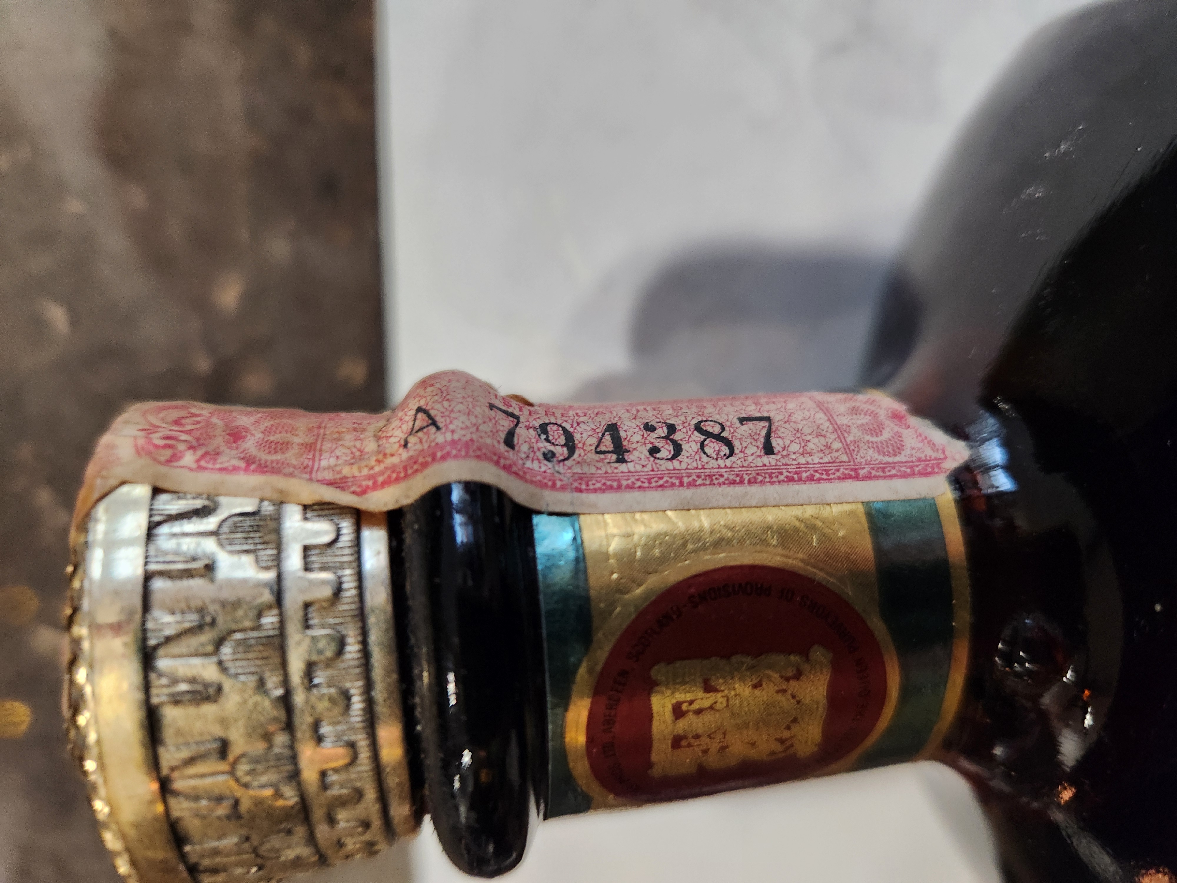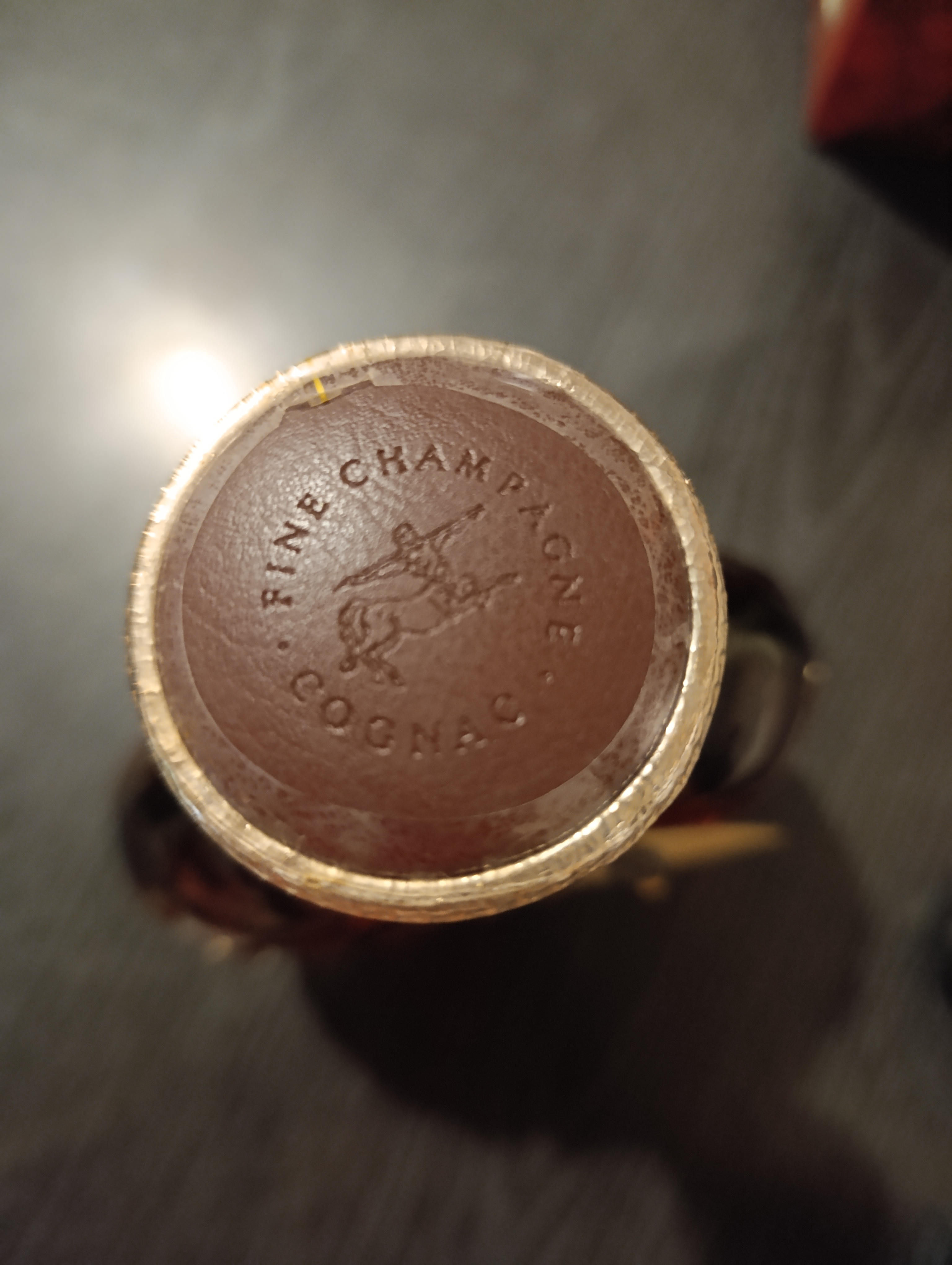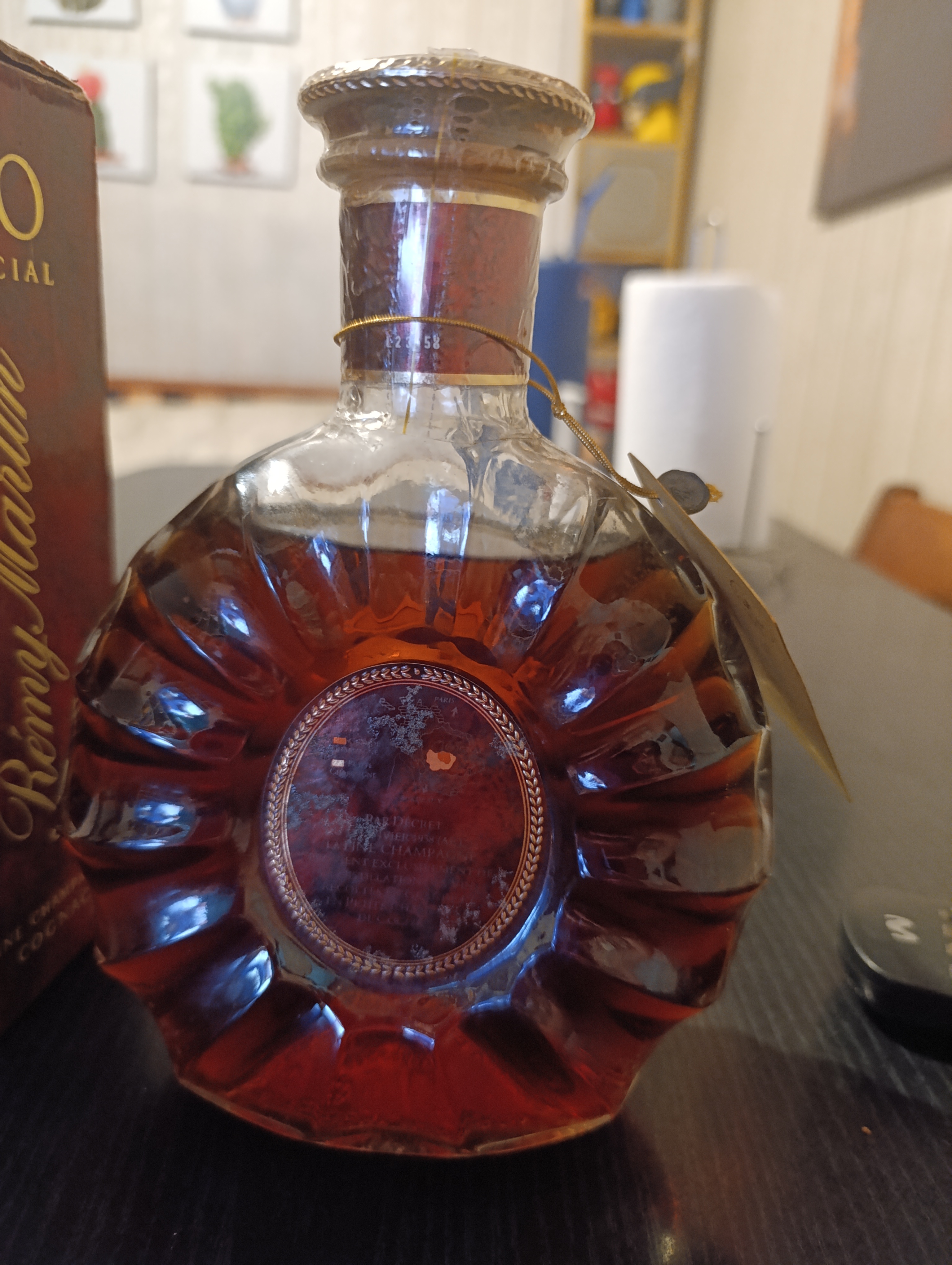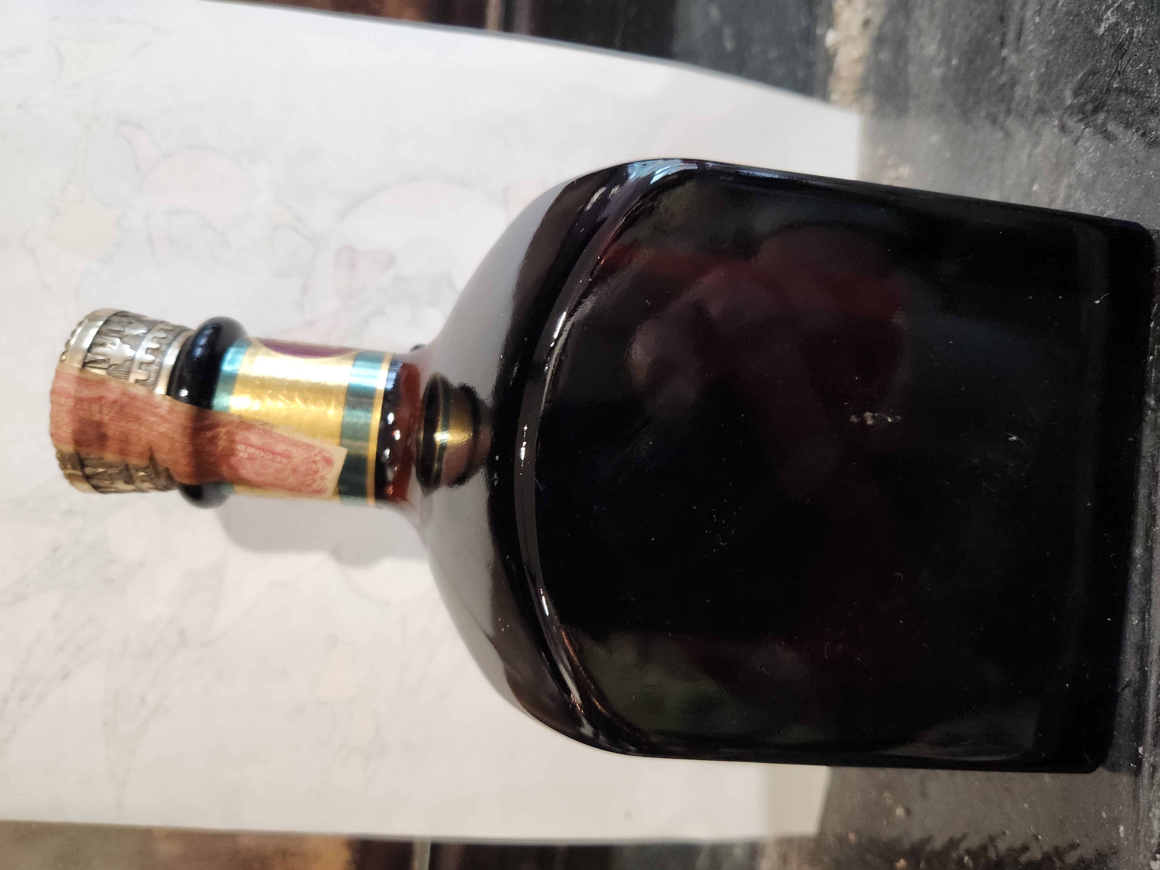 - 1) Text on label: Mid label (front of decanter): GRANDE CHAMPAGNE LOUIS XIII BRAND 4/5 Quart Rarest Reserve 80 Proof E. Rémy Martin & C° Cognac PRINTED IN FRANCE Neck label (vertical strip): Rémy Martin Cognac Rémy Martin Cognac Top of cork/capsule: E. REMY MARTIN & CO COGNAC Back label (back of decanter): DISTILLED and BOTTLED by E. REMY MARTIN & C° - Cognac IMPORTED BY RENFIELD IMPORTERS LTD., UNION, N. J. Produce of France 4/5 Quart 80 Pr. PRINTED IN FRANCE Hang tag: This Exquisite Hand-Blown Crystal Decanter Is An Exact Replica of a flask disco- vered on the site of the battle of Jarnac fought in 1569 during the religious wars be- tween the Catholics under the Duc d' ANJOU, brother of King CHARLES IX and HENRI III. The Protestants were led by a member of the royal family, the Prince de CONDÉ. Both Generals held the "Fleur-de-lys" as their Cognizance emblem. As it appears at the bottom of the decanter this emblem on the decanter does not show as to which last. Century Monsieur REMY MARTIN while riding over the ancient battlefield, met a peasant who while working his land had just unearthed this flask. The peasant had the flask capped as a container for the rare Cognac which for its excellence found high favour in the Courts of Central Europe (Austria, Hungary, Bavaria, Baden, etc. 2) Visual elements: Bottle: Flat, round, disc-shaped decanter with a scalloped, ribbed edge. Features three clear glass fleur-de-lys elements serving as feet on the lower label side, and one central clear glass fleur-de-lys in a gold ring on the mid-label area. Another embossed fleur-de-lys is visible near the neck on the back side. Neck/Capsule: Cream-colored foil/paper capsule covering the cork and upper neck, partially damaged. A red tax strip/band wraps over the top of the cork and down the neck capsule. Mid label (front): Oval, cream-colored label with text primarily in red. Back label: Oval, cream-colored label with text in red. Neck label: Vertical, cream-colored strip with repeating "Rémy Martin Cognac" text. A crown emblem is partially visible at the top of the neck label. Top of cork/capsule: A circular red seal with "E. REMY MARTIN & CO" and "COGNAC" in a circular arrangement around a central fleur-de-lys emblem. Ribbon: A brown ribbon attaches a paper hang tag to the neck of the bottle. Font styles: Mid label: "GRANDE CHAMPAGNE" and "LOUIS XIII BRAND" use a bold, uppercase serif font. "Rarest Reserve" is in a decorative script/cursive font. Other text is in smaller serif. Back label: Predominantly serif font, some bolded. Neck label: Serif font. Hang tag: Serif font. 3) Fill level estimate: well above shoulder into neck: great