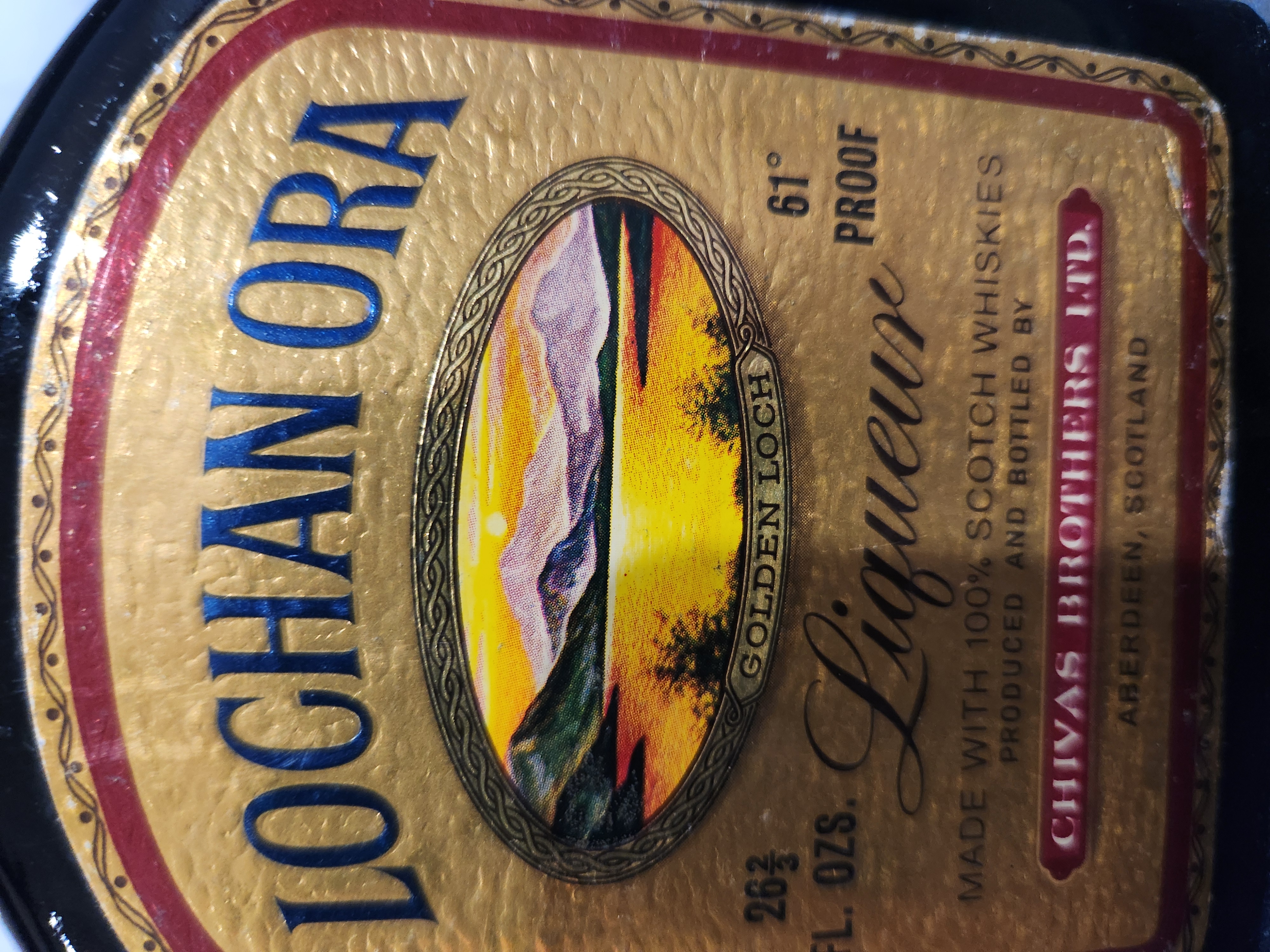 - 1) Text on label: LOCHAN ORA 61° PROOF GOLDEN LOCH Liqueur 26⅔ FL. OZS. MADE WITH 100% SCOTCH WHISKIES PRODUCED AND BOTTLED BY CHIVAS BROTHERS LTD. ABERDEEN, SCOTLAND A.794387 (Embossed on bottle side/back): CHIVAS BROTHERS LTD ABERDEEN, SCOTLAND SC 148 16 LIQUOR BOTTLE 2) Visual elements: Main Label: A rectangular label with an arched top, framed by a red border. The background is a golden, textured pattern. A central oval medallion depicts a landscape with mountains and a lake under a sunset/sunrise sky. "LOCHAN ORA" is in large, blue serif font, arched above the medallion. "Liqueur" is in a large, black cursive/script font below it, with "GOLDEN LOCH" in a small oval above it. A prominent red rectangular box with a gold outline on the right contains "CHIVAS BROTHERS LTD." in a sans-serif, block font. Other text is in sans-serif, block-like fonts. Neck/Capsule: A gold-colored, textured foil capsule covers the cork and extends down the neck. A horizontal band with green, gold, and red stripes wraps around the neck, featuring a round red seal with a gold crest/emblem on the front. A pink/red strip label (possibly a tax band) with a repetitive pattern and a black serial number ("A.794387") crosses over the neck and capsule. The cap itself appears to have "CHIVAS" embossed around its edge. Embossing on bottle: The words "CHIVAS BROTHERS LTD", "ABERDEEN, SCOTLAND", and "LIQUOR BOTTLE" along with numbers "SC 148" and "16" are embossed on the side/back of the dark glass bottle in a sans-serif, block font. 3) Fill level estimate: well above shoulder into neck: great