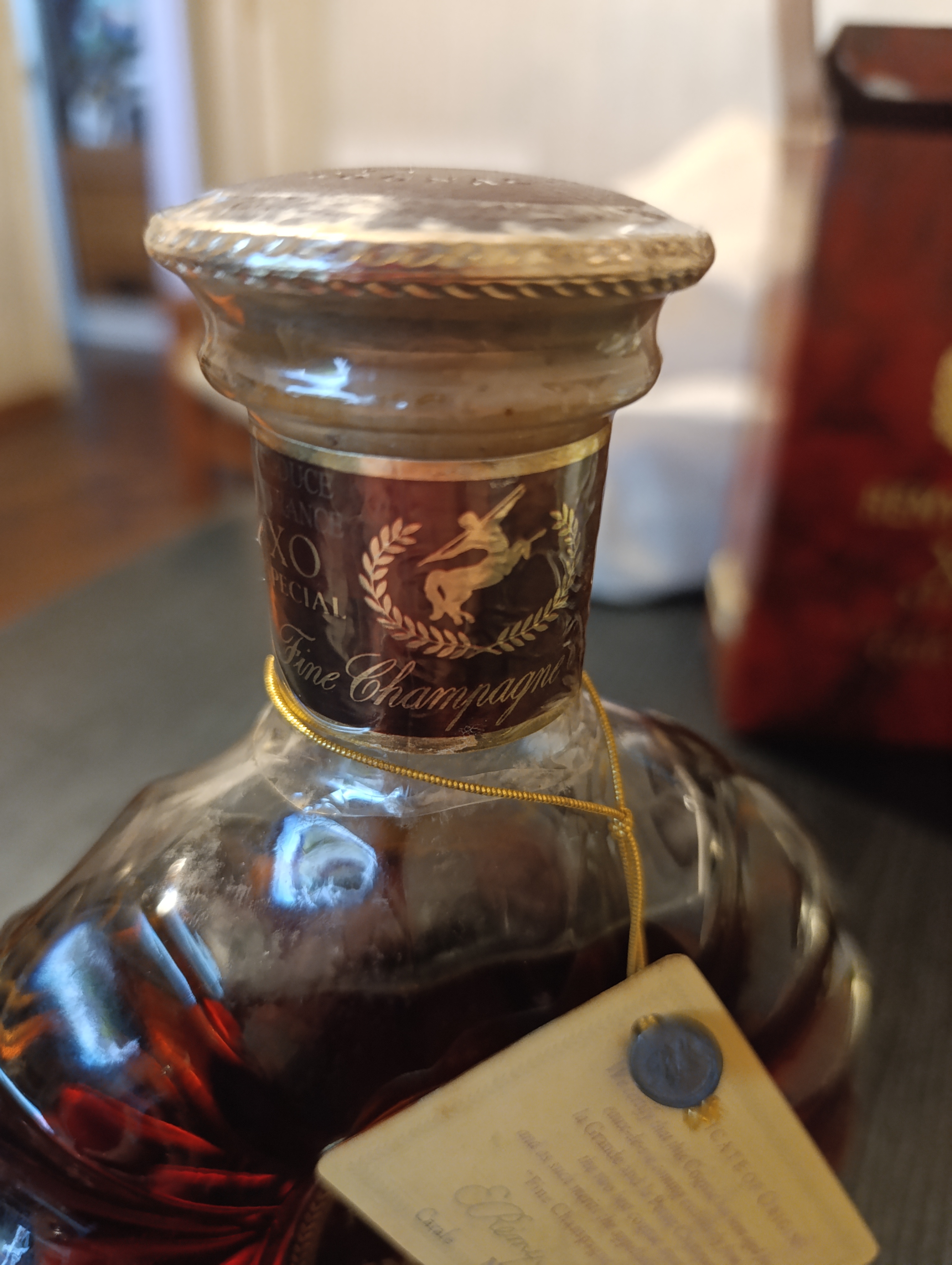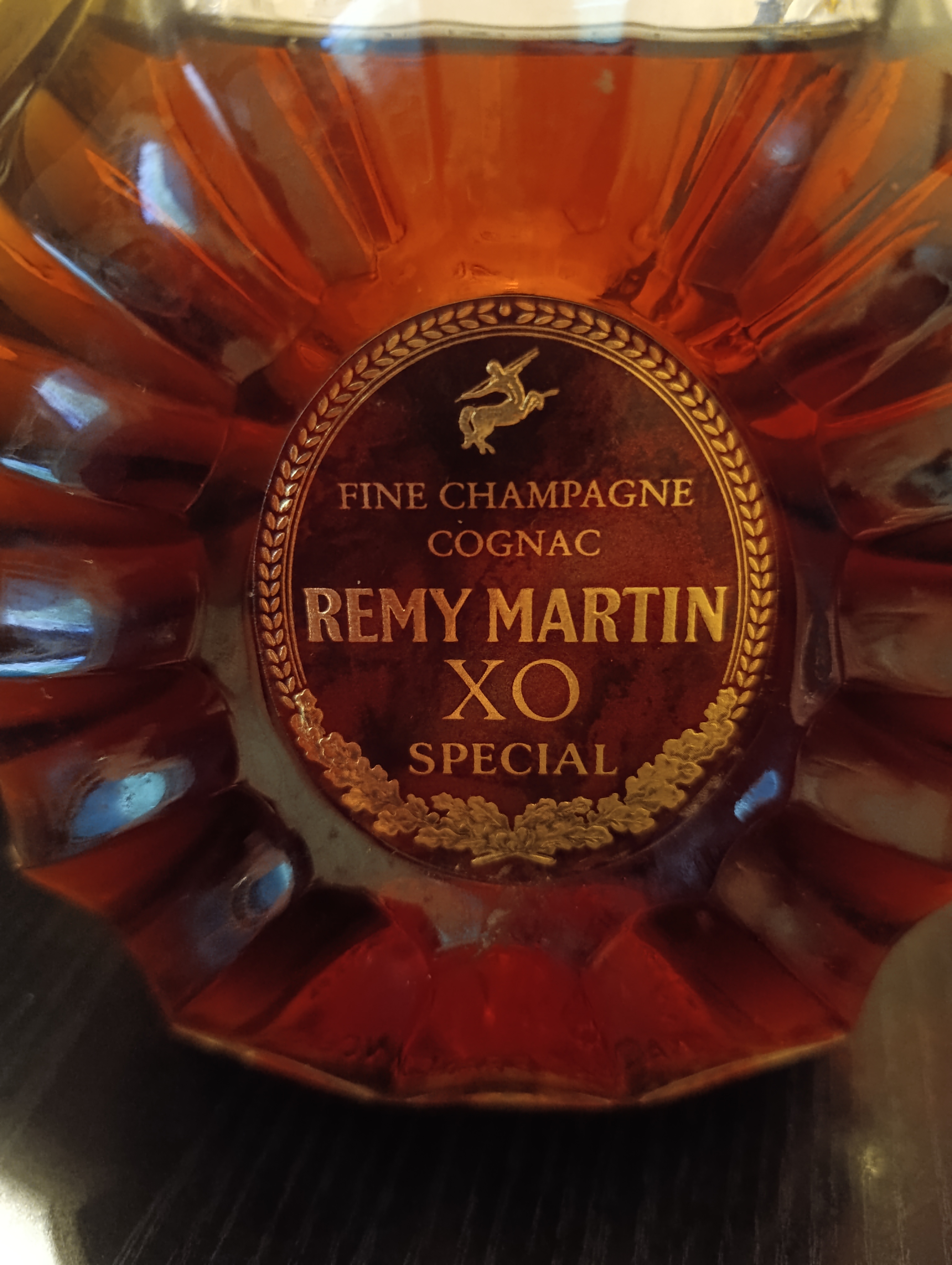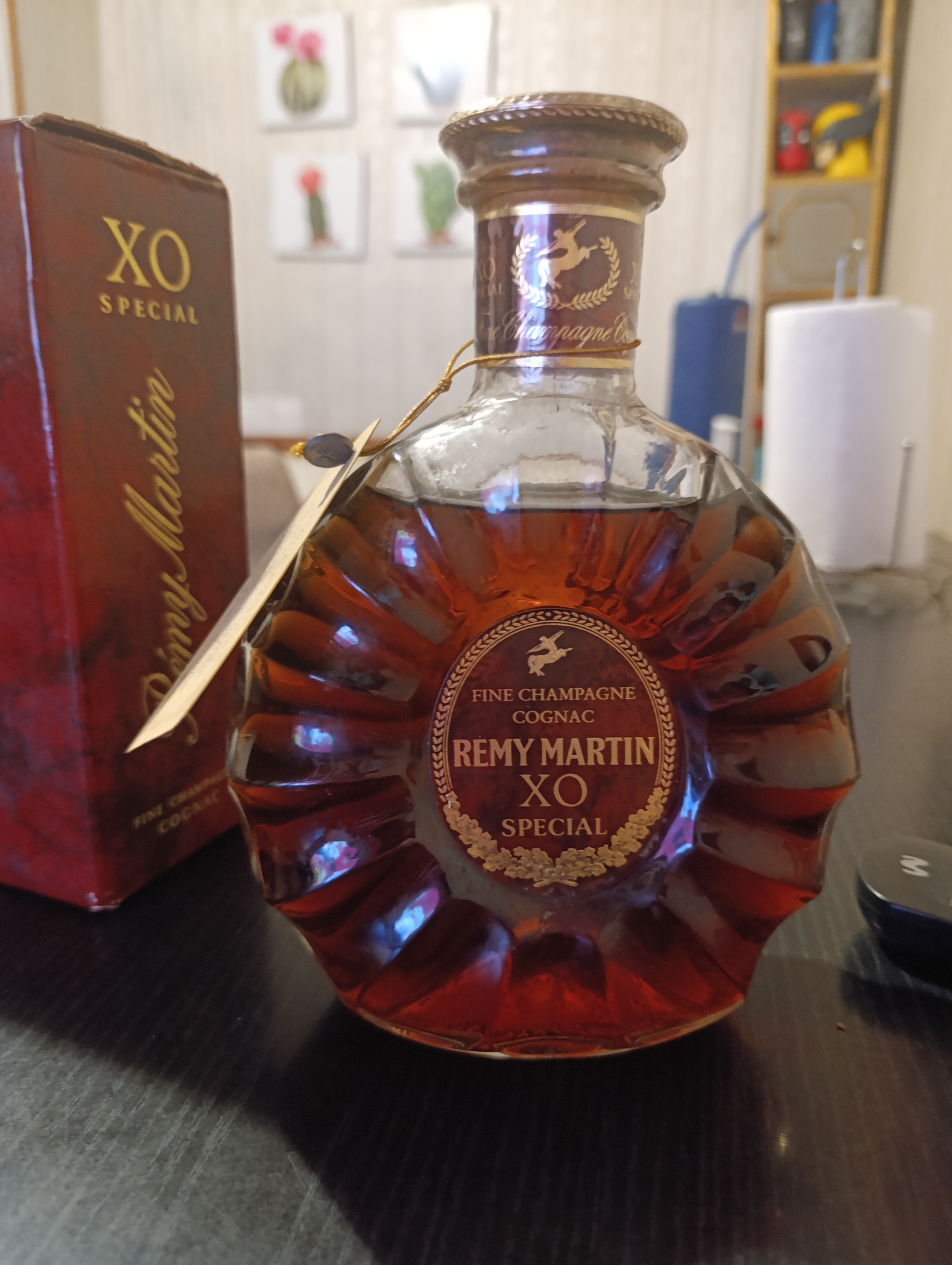 - 1) Text on label: Bottle Mid Label: FINE CHAMPAGNE COGNAC REMY MARTIN XO SPECIAL Bottle Neck Label: XO SPECIAL Fine Champagne Bottle Capsule (Top, embossed): FINE CHAMPAGNE COGNAC Bottle Hang Tag: CERTIFICATE OF ORIGIN Remy Martin XO SPECIAL Fine Champagne Cognac Code N° 458 231 Box Front: XO SPECIAL REMY MARTIN XO SPECIAL FINE CHAMPAGNE COGNAC Box Side: XO SPECIAL Remy Martin FINE CHAMPAGNE COGNAC 2) Visual elements: Emblem: A Centaur (half-man, half-horse archer) within a wreath/oval appears on the bottle's mid label, neck label, capsule top (embossed), and the box front. Bottle Shape: The main body of the bottle features a distinctive fluted/scalloped glass design. Capsule: The capsule is brown with a braided gold band around the top edge. Hang Tag: A cream-colored, irregularly shaped hang tag is attached by a gold string, featuring a dark wax seal near its top. Box: The box is dark red with a marbled pattern, adorned with gold text and the Centaur emblem. Font Styles: Serif fonts are used for "REMY MARTIN" and "XO". Sans-serif fonts are used for "FINE CHAMPAGNE COGNAC" and "SPECIAL". A cursive/script style is used for "Fine Champagne" on the neck label and "Remy Martin" on the box side, as well as on parts of the hang tag. 3) Fill level estimate: well above shoulder into neck: great