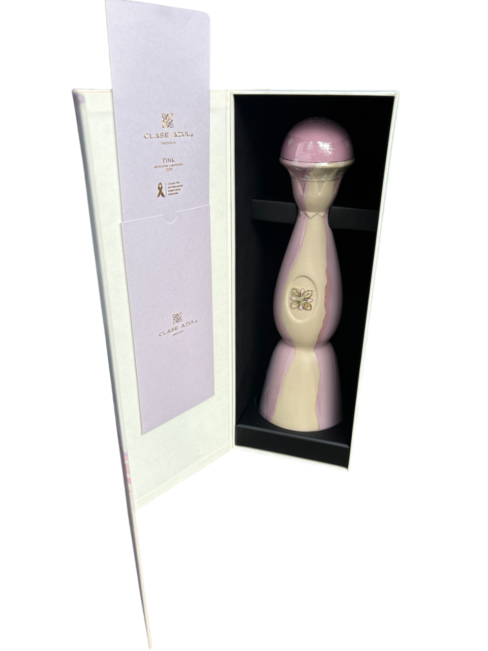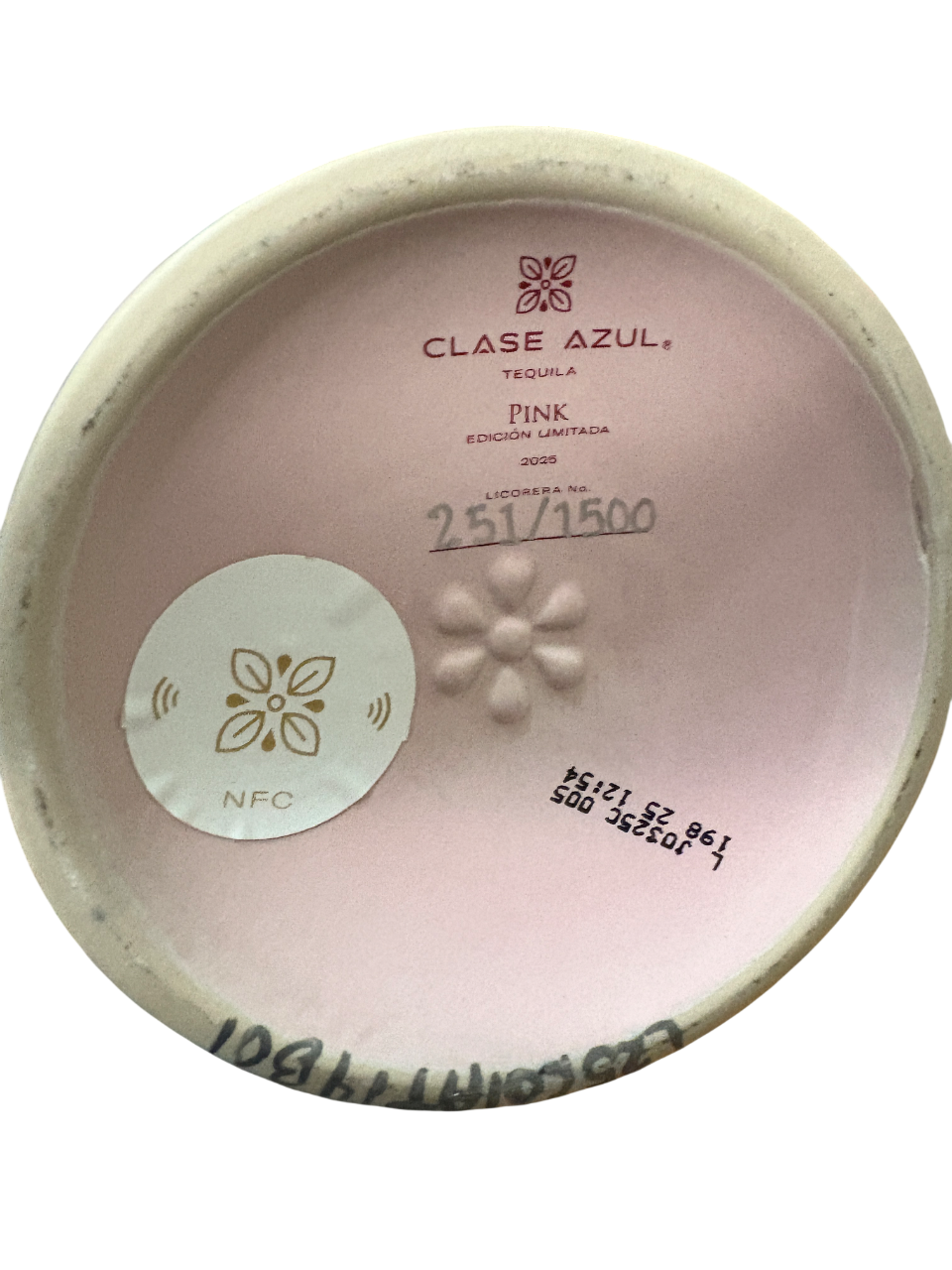 - 1) Text on label: On outer box (front panel): CLASE AZUL® TEQUILA PINK EDICIÓN LIMITADA 2023 Choose Pink to support vital breast cancer awareness 100% BLUE WEBER AGAVE On pamphlet (top section): CLASE AZUL® TEQUILA PINK EDICIÓN LIMITADA 2023 Choose Pink to support vital breast cancer awareness On pamphlet (bottom section): CLASE AZUL® TEQUILA On bottle bottom: CLASE AZUL® TEQUILA PINK EDICIÓN LIMITADA 2023 LICORERA No. 251/1500 L J9325C S00 25 12:54 198 (on NFC sticker): NFC (on rim, very faint): 10B44H0OEC 2) Visual elements: Bottle: A distinctive, tall, curvaceous ceramic decanter with a bell-shaped stopper. The body is primarily off-white/cream with irregular vertical sections of light pink. On the mid-body, a golden metallic emblem resembling a stylized butterfly or flower with a pink center is present. The light pink stopper features subtle, light-colored decorative patterns. Box: A cream/off-white box with decorative wavy patterns in shades of pink and light purple along the top and bottom edges of the front panel. Pamphlet: Features the brand logo and a pink breast cancer awareness ribbon. Logos/Emblems: A stylized butterfly/flower emblem (Clase Azul logo) is prominent on the bottle's mid-body (metallic), bottle's bottom (printed and on an NFC sticker), box (printed), and pamphlet (printed). A pink breast cancer awareness ribbon icon appears on the box and pamphlet. Embossing/Stamps: A flower-like shape is embossed into the pink base of the bottle. Printed production codes are visible on the bottle's bottom. Font styles: The brand name "CLASE AZUL" uses a distinct sans-serif font. Other texts such as "TEQUILA", "PINK", "EDICIÓN LIMITADA", "2023", "LICORERA No.", and descriptive phrases predominantly use various clear sans-serif fonts. 3) Fill level estimate: Not visible (opaque ceramic bottle).