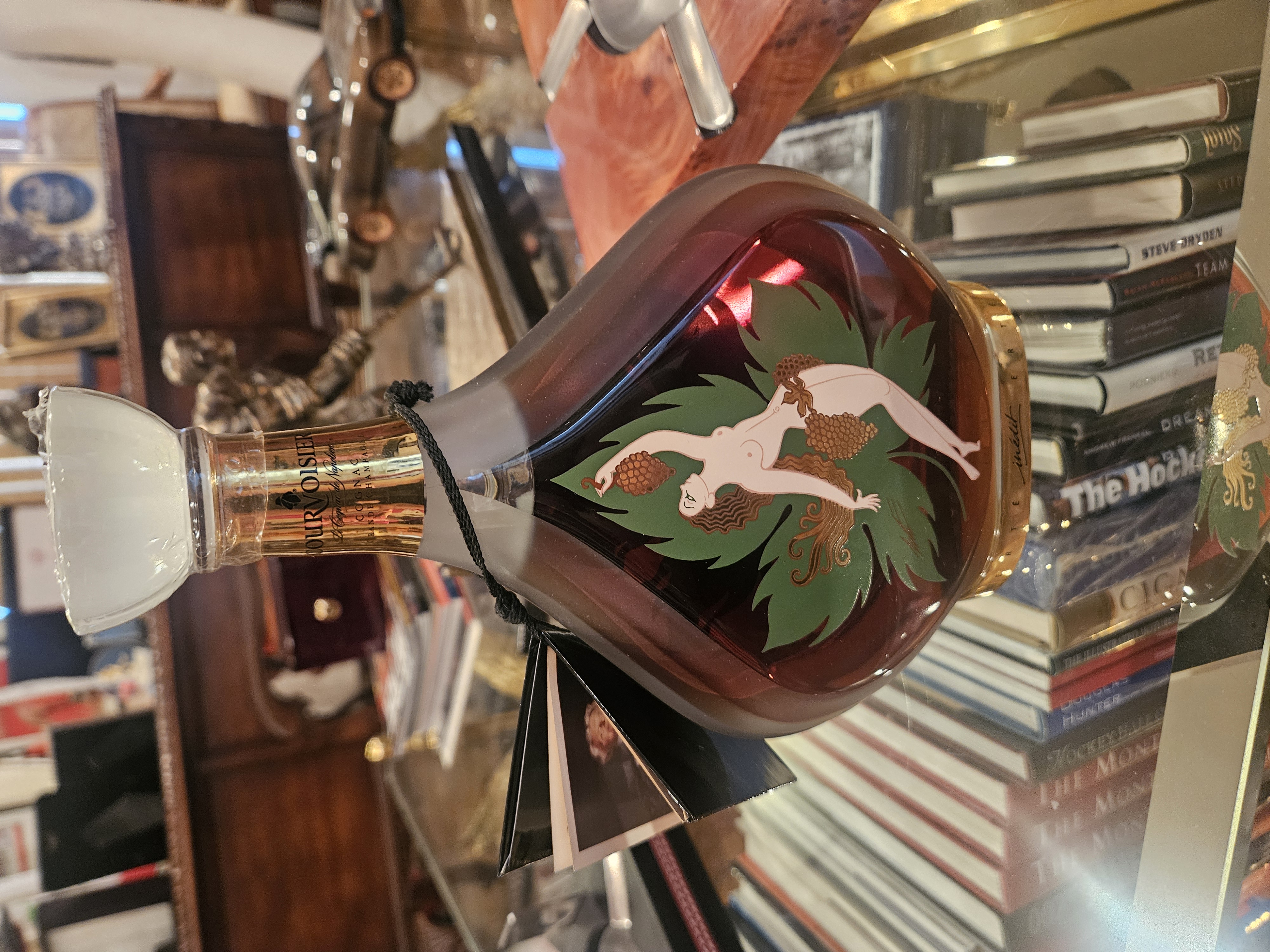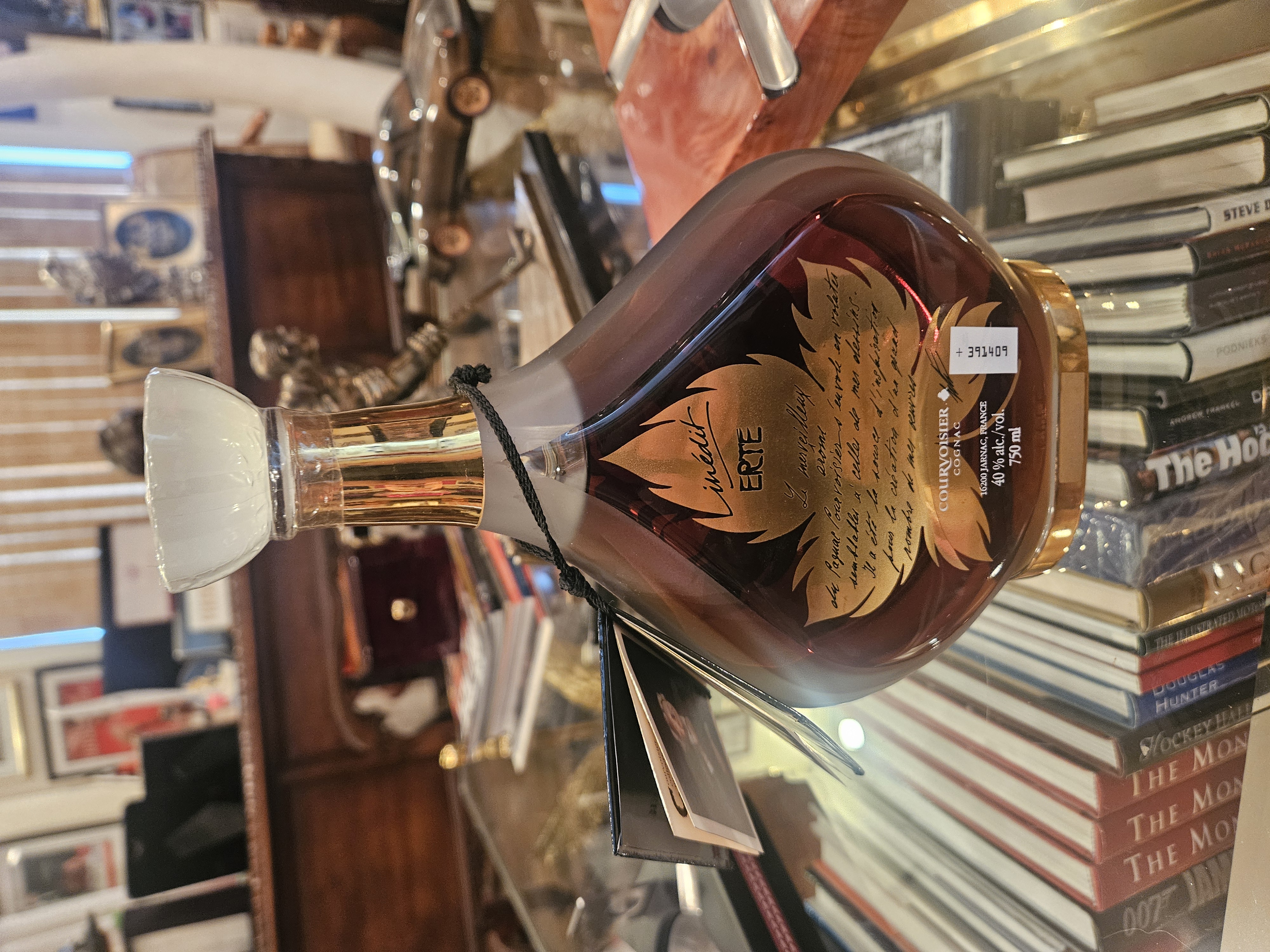 - 1) Text on label: On Bottle (Main Label): L'Inédit ERTE is a signature Courvoisier spirit created by the blend master, the late Jean-Marc Olivier. The selection of eaux de vie, taken from the Grande Champagne, Petite Champagne and Borderies crus, create a unique and rare cognac. This cognac is for connoisseurs who appreciate the unique and rare... (text continues, obscured) COURVOISIER COGNAC FINE CHAMPAGNE 40% alc./vol. 750 mL 391409 (serial number) On Bottle (Neck Band): COURVOISIER FINE CHAMPAGNE COGNAC On Box: L'Inédit ERTE COURVOISIER COGNAC FINE CHAMPAGNE 2) Visual elements: Bottle Shape: Distinctive, flattened, and wide at the base, tapering to a narrow neck, with a white decorative stopper. Upper/Mid Label (front): On one side, a gold-colored design of stylized foliage or leaves is visible. On the opposite side (mid label), an Art Deco-style illustration of a reclining nude female figure with grapes and large green leaves is featured. This illustration is also visible through the back of the bottle as part of the label design. Neck: A gold-colored band wraps around the neck, featuring the "COURVOISIER" name and "FINE CHAMPAGNE COGNAC" in black text. Cork/Capsule: A translucent white glass/resin stopper with an etched or painted black stylized mark on its top surface. Attached Tag: A small black tag is tied to the bottle's neck, likely carrying branding or further information, with a smaller version of the Erté illustration. Box: A black presentation box with a central recessed panel outlined in gold. The Art Deco illustration of the nude female figure appears on the left side of this panel. Font Styles: "L'Inédit" uses a graceful cursive/script font. "ERTE" is in distinctive, stylized block capitals characteristic of Art Deco. "COURVOISIER" is in a serif font. Other descriptive text and legal information mainly use sans-serif fonts. 3) Fill level estimate: well above shoulder into neck: great Reason: Minimal air gap visible, with the liquid level reaching the base of the decorative stopper.
