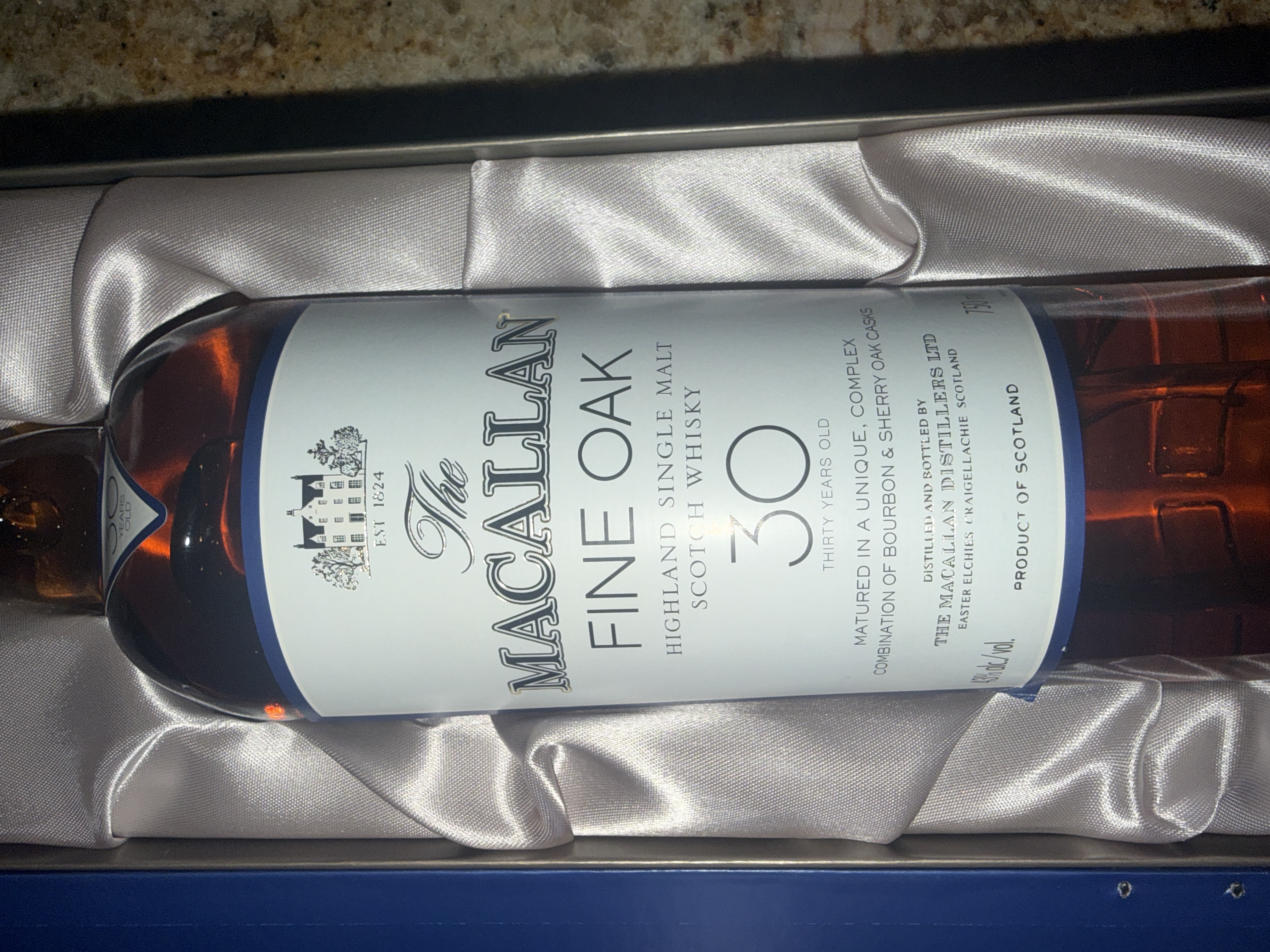 - 1) Text on label: Bottle Front Label: The Macallan FINE OAK HIGHLAND SINGLE MALT SCOTCH WHISKY 30 YEARS OLD 70cl PRODUCT OF SCOTLAND e 43%vol. MATURED FOR THIRTY YEARS OLD COMPLEX COMBINATION OF BOURBON & SHERRY OAK CASKS DISTILLED & BOTTLED BY THE MACALLAN DISTILLERS LTD. EASTER ELCHIES, CRAIGELLACHIE. SCOTLAND Bottle Neck Triangular Label: 30 YEARS OLD Bottle Back Label: "The Macallan 30 Years Old Fine Oak is an extraordinary expression, with a captivating aroma and an elegant, full flavour. Crafted from the triple cask combination of Bourbon & Sherry Oak casks, this exceptional single malt provides a testament to the richness and depth that can be achieved from prolonged maturation. PLEASE SAVOUR RESPONSIBLY www.themacallan.com GOVERNMENT WARNING: (1) ACCORDING TO THE SURGEON GENERAL, WOMEN SHOULD NOT DRINK ALCOHOLIC BEVERAGES DURING PREGNANCY BECAUSE OF THE RISK OF BIRTH DEFECTS. (2) CONSUMPTION OF ALCOHOLIC BEVERAGES IMPAIRS YOUR ABILITY TO DRIVE A CAR OR OPERATE MACHINERY, AND MAY CAUSE HEALTH PROBLEMS. 5 010314 007130 Box Top Label: The Macallan FINE OAK HIGHLAND SINGLE MALT SCOTCH WHISKY 30 MATURED THIRTY YEARS OLD COMPLEX COMBINATION OF BOURBON & SHERRY OAK CASKS 2) Visual elements: Emblems/Graphics: An illustration of Easter Elchies House appears on the upper main label and is embossed on the cap. Strip Labels: A white and blue triangular label stating "30 YEARS OLD" is positioned on the bottle's shoulder/neck. Neck/Capsule: A gold foil capsule covers the cork, featuring "The Macallan" printed repeatedly in a pattern. Box: The blue surface of the box has a subtle background pattern resembling concentric, organic lines. Font Styles: The main brand name "The Macallan" uses a decorative serif font. "FINE OAK" and the prominent "30" are displayed in a bold sans-serif style. Other descriptive text and legal warnings utilize a classic serif font. 3) Fill level estimate: well above shoulder into neck: great Reason: The liquid level is at the very top of the bottle's neck, just below the cork.