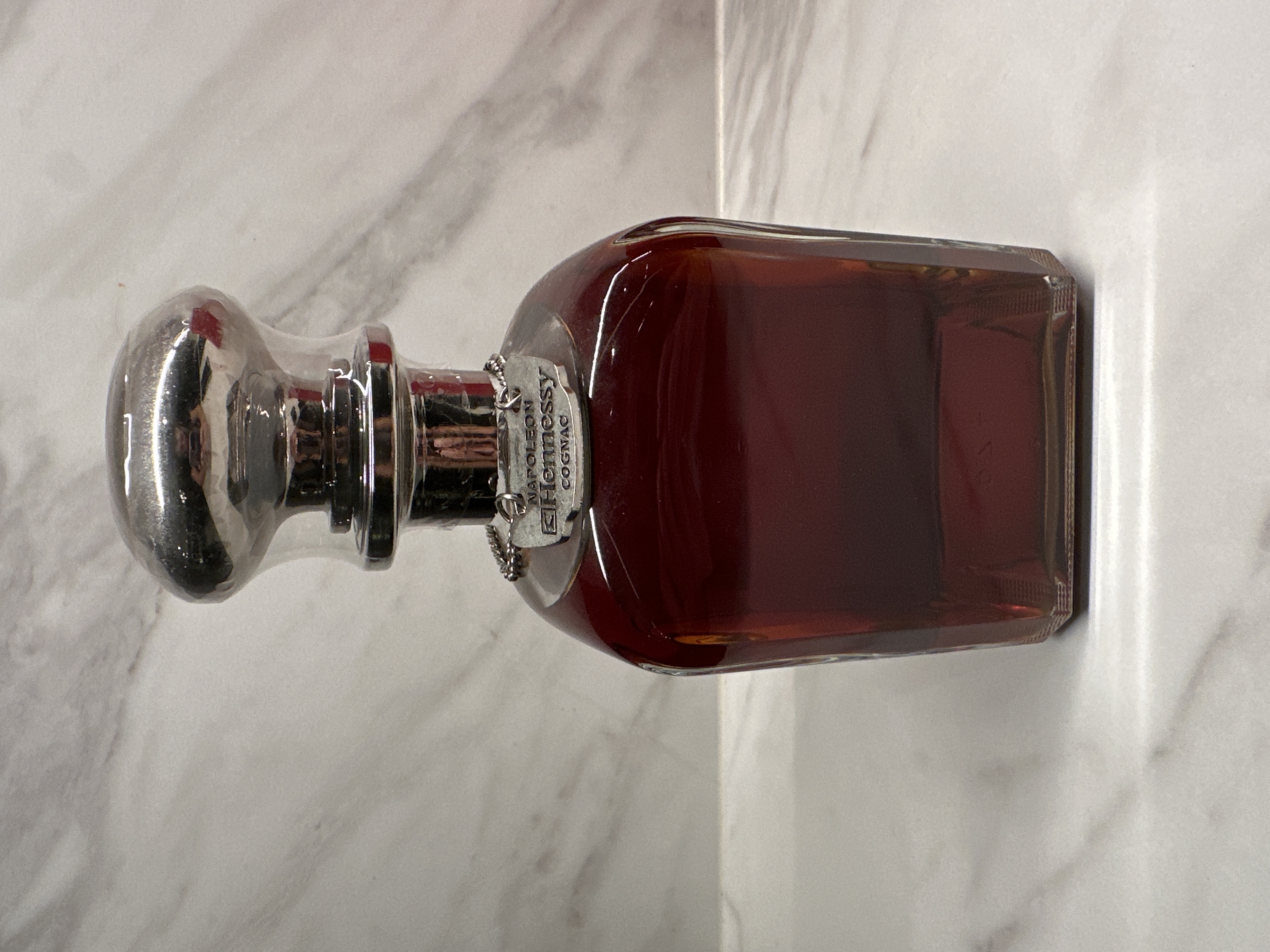 - 1) Text on label: On bottle's metal tag: NAPOLEON [Hennessy logo - an 'H' with an arm holding an axe] Hennessy COGNAC On box spine (side 1): COGNAC [Hennessy logo - an 'H' with an arm holding an axe] Hennessy On box spine (side 2): NAPOLEON 2) Visual elements: Notable graphics: A metallic, decorative tag (with scalloped edges) is attached around the neck of the bottle by a small chain. This tag features the distinctive Hennessy "arm and axe" emblem (an 'H' incorporating an arm holding an axe). The red presentation box has gold border accents. Where they appear: The metallic tag serves as the mid-label on the bottle. The gold borders and text are on the exterior spines of the red box. Apparent font style(s): On both the bottle tag and the box, "NAPOLEON" and "COGNAC" are in a sans-serif, all-caps font. "Hennessy" is in its distinctive decorative script brand font. 3) Fill level estimate: well above shoulder into neck: great Reason: The liquid fills high into the bottle's neck, with no visible air gap that would suggest evaporation.