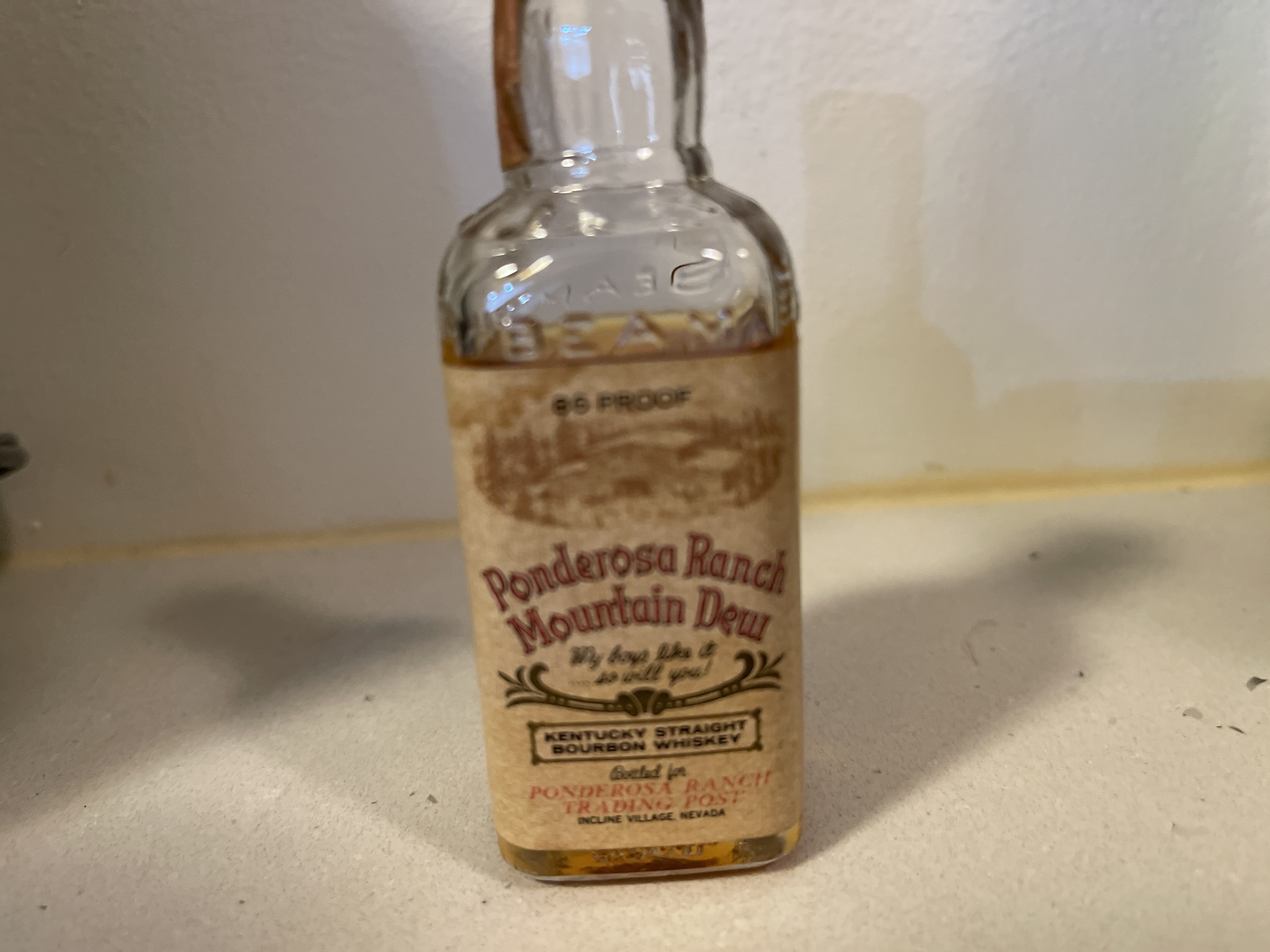 - 1) Text on label: Front Label: 86 PROOF Ponderosa Ranch Mountain Dew We hope you like it as well as you! KENTUCKY STRAIGHT BOURBON WHISKEY DISTILLED FOR PONDEROSA RANCH TRADING POST INCLINE VILLAGE, NEVADA Back Label: CHARCOAL FILTERED COPPER DISTILLED SLOW-MASH THIS BOTTLE CONTAINS THE FINEST KENTUCKY STRAIGHT BOURBON WHISKEY DISTILLED AND BOTTLED IN THE HEART OF THE BLUE GRASS COUNTRY. BOTTLED BY JAMES B. BEAM DISTILLING CO. CLERMONT • BEAM, KENTUCKY KENTUCKY STRAIGHT BOURBON WHISKEY 1/10 PINT Bottle Embossing (on shoulder): BEAM 2) Visual elements: Embossing: The name "BEAM" is embossed on the upper shoulder of the glass bottle. Front Label: Features scrollwork under "Mountain Dew" and a stylized border around "KENTUCKY STRAIGHT BOURBON WHISKEY". The background appears to have a textured, possibly wood-grain or aged paper pattern. Back Label: A small graphic of a horse-drawn buggy/carriage is present. Tax Strip: A torn, reddish-brown strip label covers the top of the cap and extends down a portion of the neck, showing a circular emblem. Font Styles: The labels utilize a mix of styles: sans-serif block (e.g., "86 PROOF", "CHARCOAL FILTERED"), decorative script/cursive (e.g., "Ponderosa Ranch", "Mountain Dew"), a simpler script (e.g., "We hope you like it..."), and block serif (e.g., "KENTUCKY STRAIGHT BOURBON WHISKEY", "JAMES B. BEAM DISTILLING CO."). 3) Fill level estimate: well above shoulder into neck: great
