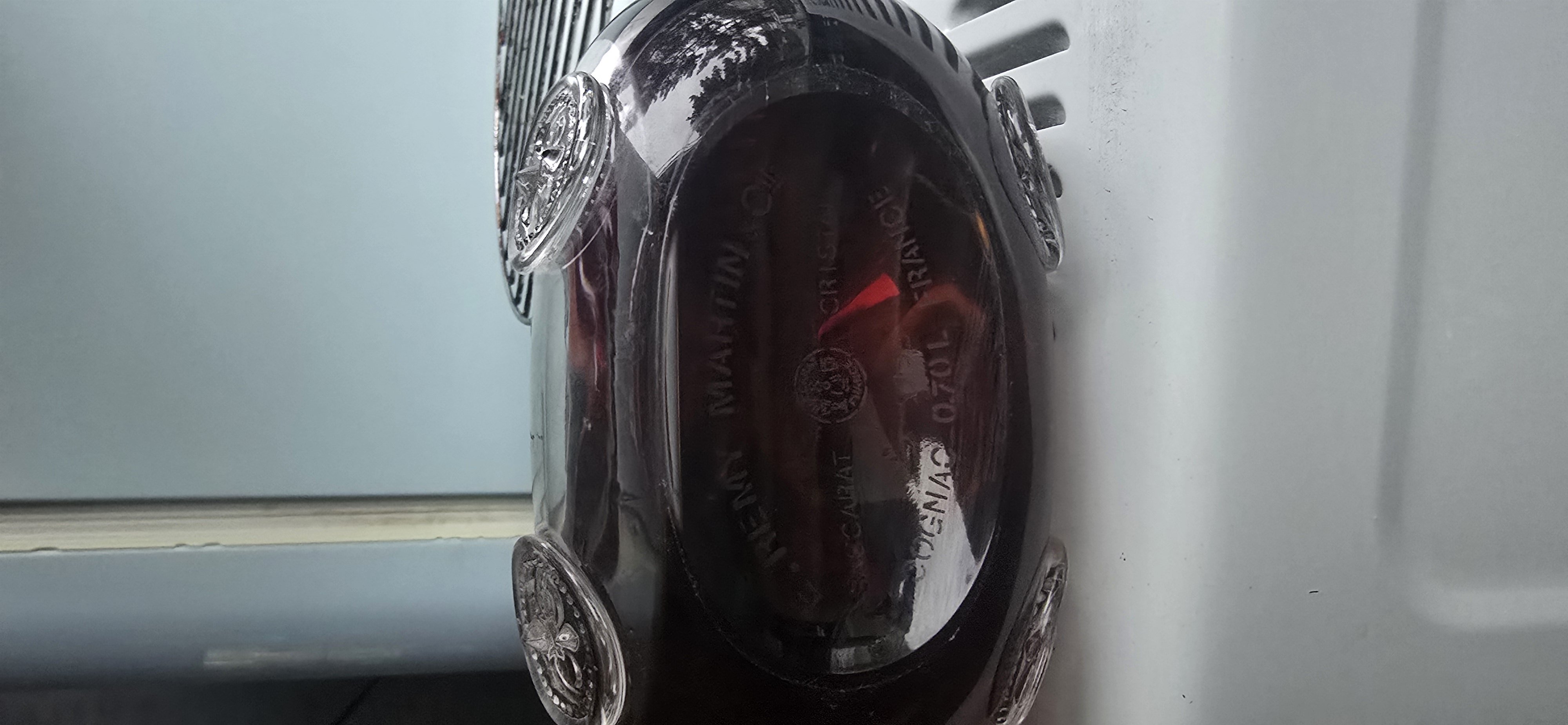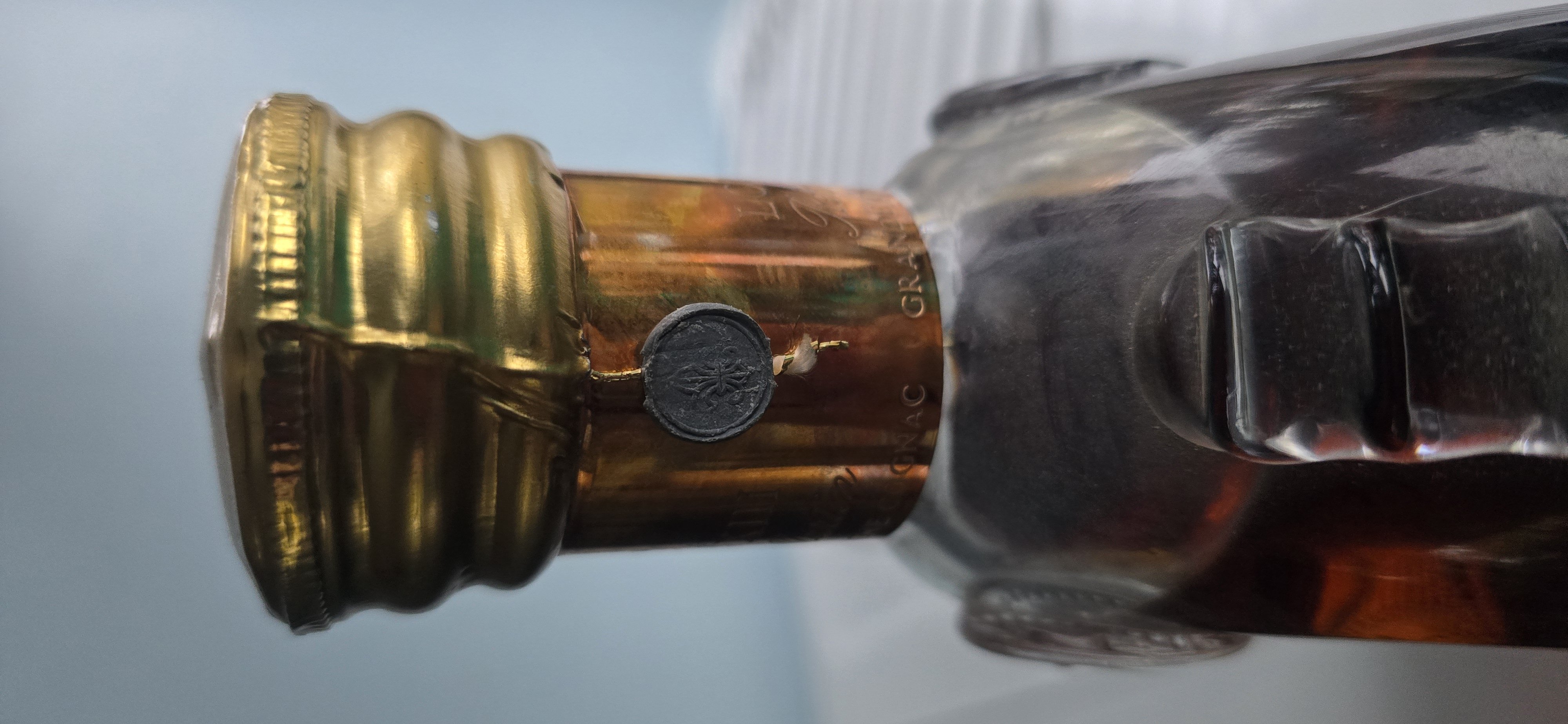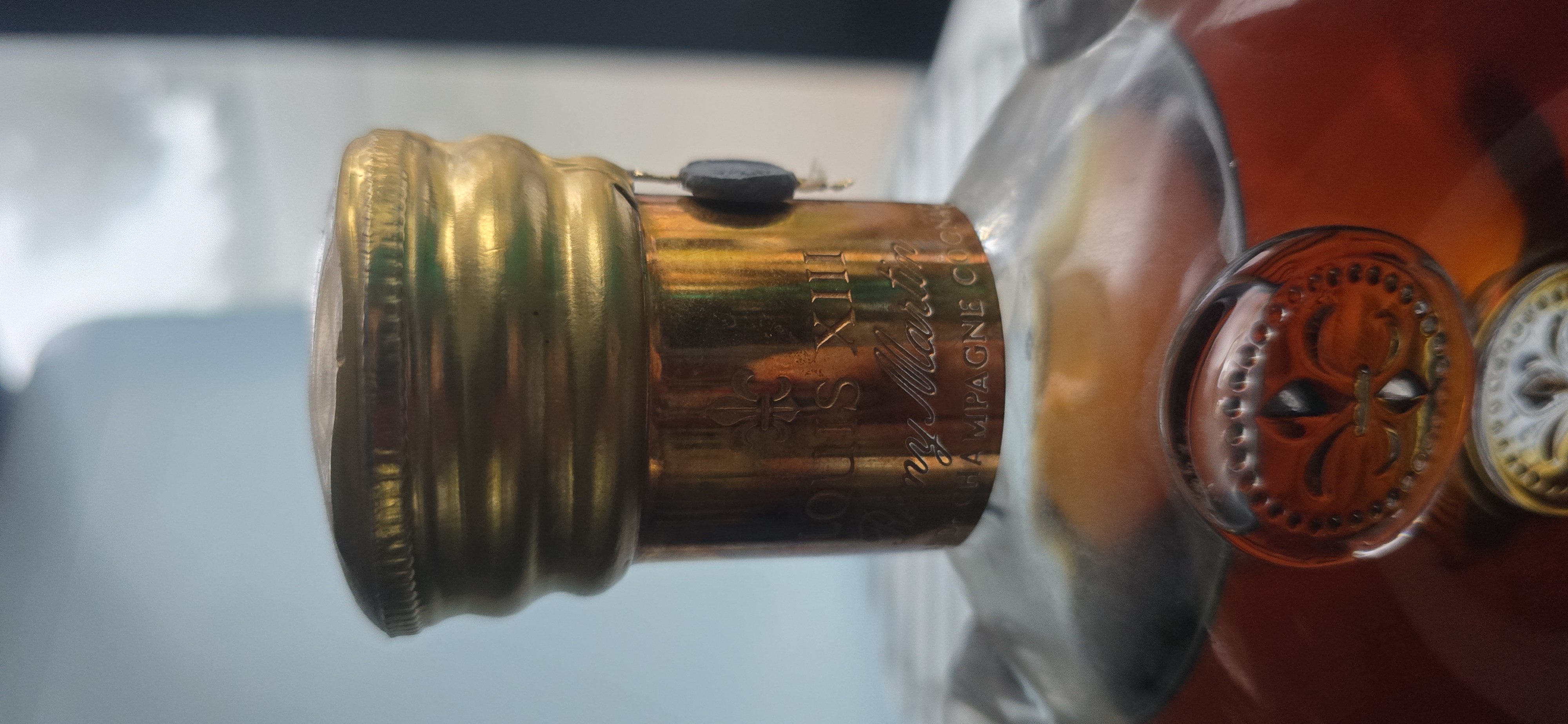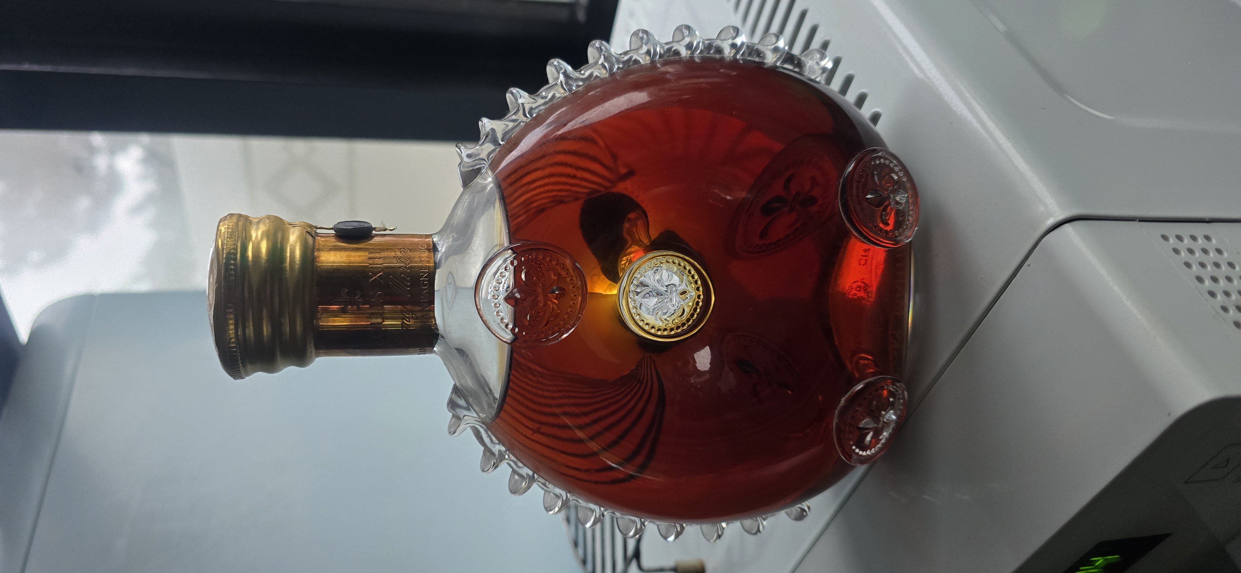 - 1) Text on label: From neck band: LOUIS XIII Rémy Martin GRANDE CHAMPAGNE COGNAC Embossed on glass body/bottom: E. REMY MARTIN & C° BACCARAT CRISTAL COGNAC 0.70 L FRANCE 2) Visual elements (concise): Graphics: A fleur-de-lis emblem is visible on the golden neck band and on a small, round black wax seal attached to the neck. A decorative gold medallion with a starburst/crown-like design is on the front mid-body. An embossed centaur emblem appears on the bottom/side glass, within the embossed text. The bottle itself has a distinctive multi-lobed shape with ribbed/spiked sides. Location: Neck band, neck seal, front mid-body, and embossed on the glass body/bottom. Font style(s): "LOUIS XIII" is in a decorative serif font. "Rémy Martin" is in a cursive/script font. Other text on the neck band and the embossed text on the glass appears to be in a sans-serif or block-like font. 3) Fill level estimate: Well above shoulder (very good), as the liquid fills the main body of the decanter up to the base of the neck, with no visible air gap.