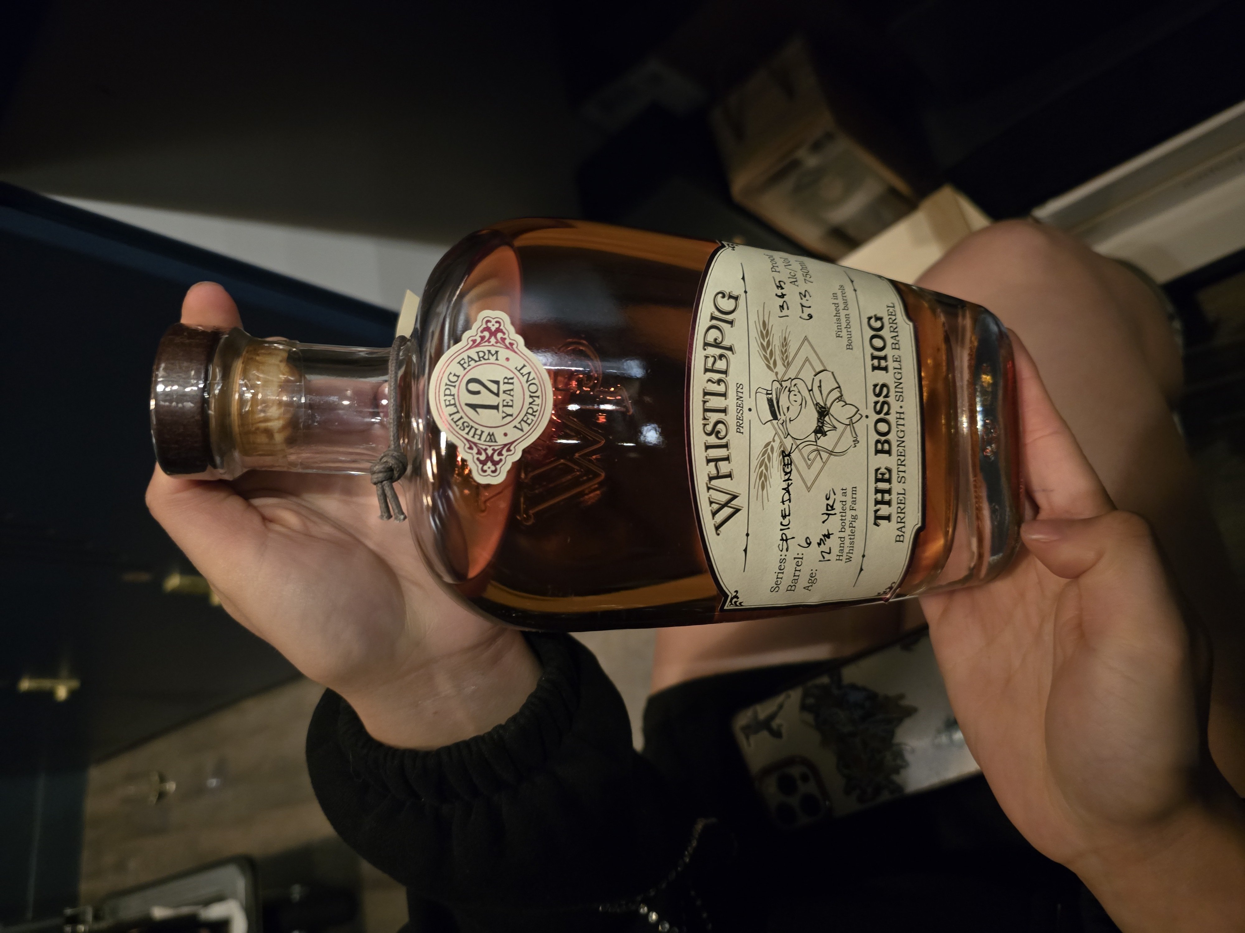 - Here is the analysis of the image: 1) Text on label: WHISTLEPIG FARM 12 YEAR VERMONT WHISTLEPIG PRESENTS Series: SPICE DANGER Barrel: 6 Age: 12 3/4 YRS Hand bottled at WhistlePig Farm 134.5 Proof 67.3 Alc/Vol 750ml Finished in ex-Bourbon barrels THE BOSS HOG BARREL STRENGTH - SINGLE BARREL 2) Visual elements (concise): - **Bottle Embossing:** A large "W" is embossed on the glass on the upper part of the bottle, below the neck. - **Neck Label:** An oval-shaped paper label featuring "12 YEAR" in the center, surrounded by "WHISTLEPIG FARM" and "VERMONT". It has a decorative red/maroon border with scrollwork. This label is attached to the neck with a dark string, tied in a knot. - **Main Label:** An irregularly shaped, off-white label with a stylized black border and decorative elements at the top corners. - **Graphics:** Above "PRESENTS", there is a stylized depiction of wheat stalks. In the mid-right, a cartoon pig mascot, wearing a top hat and bowtie and holding a cane, stands within a diamond shape with more wheat stalks. - **Font Styles:** - "WHISTLEPIG" (main label) uses a large, decorative serif font. - "PRESENTS" and "THE BOSS HOG" are in bold, all-caps serif fonts. - "BARREL STRENGTH - SINGLE BARREL" uses a smaller, all-caps serif font. - "WHISTLEPIG FARM" and "VERMONT" on the neck label use a serif font, curved along the label's edge, while "12 YEAR" is in a bold sans-serif. - The handwritten details like "Series: SPICE DANGER", "Barrel: 6", and "Age: 12 3/4 YRS" are in a distinct script/cursive style. - Numeric and volumetric information (Proof, Alc/Vol, 750ml) use a sans-serif font. 3) Fill level estimate: well above shoulder (very good); liquid extends significantly into the neck, just below the cork.