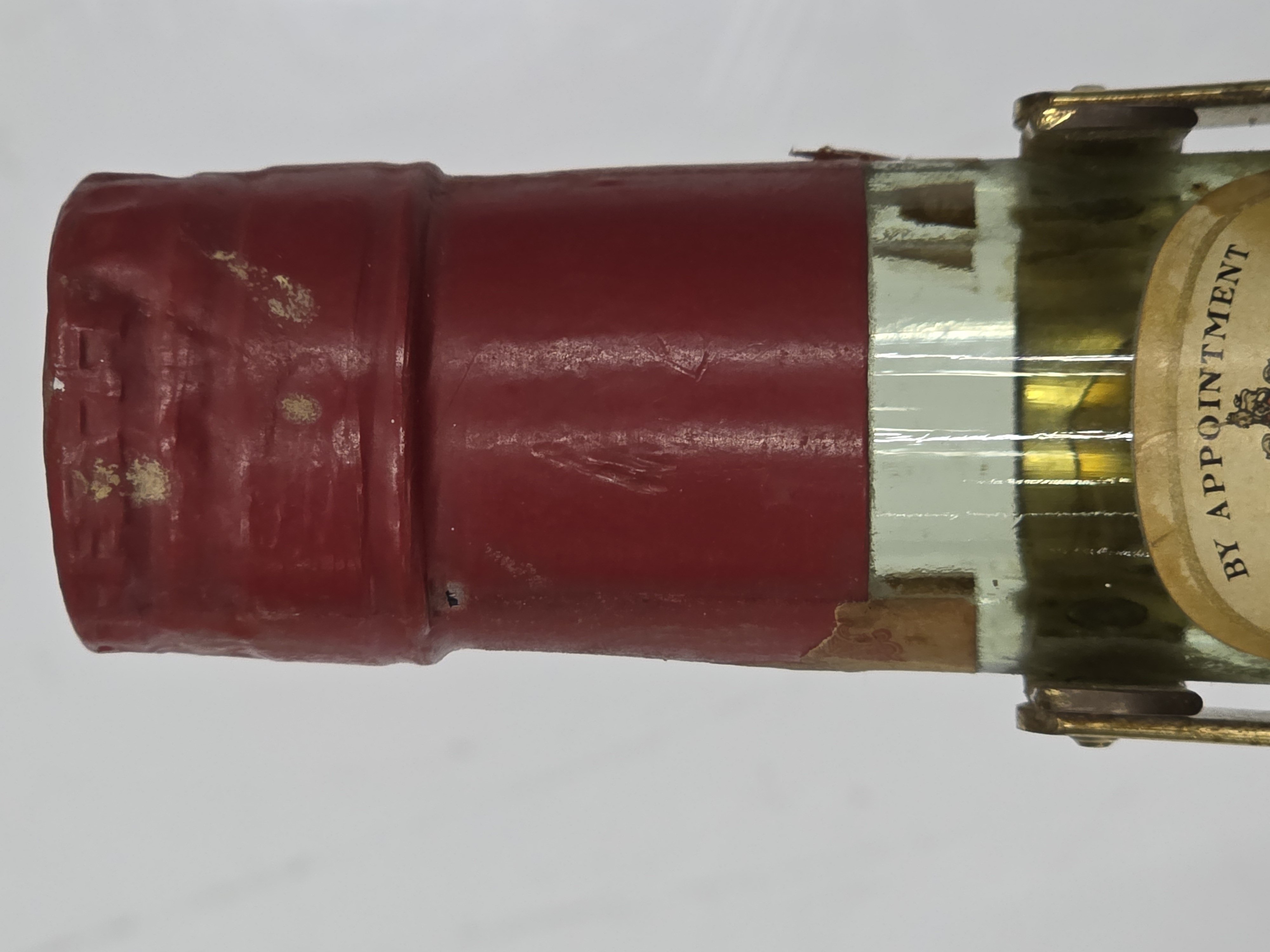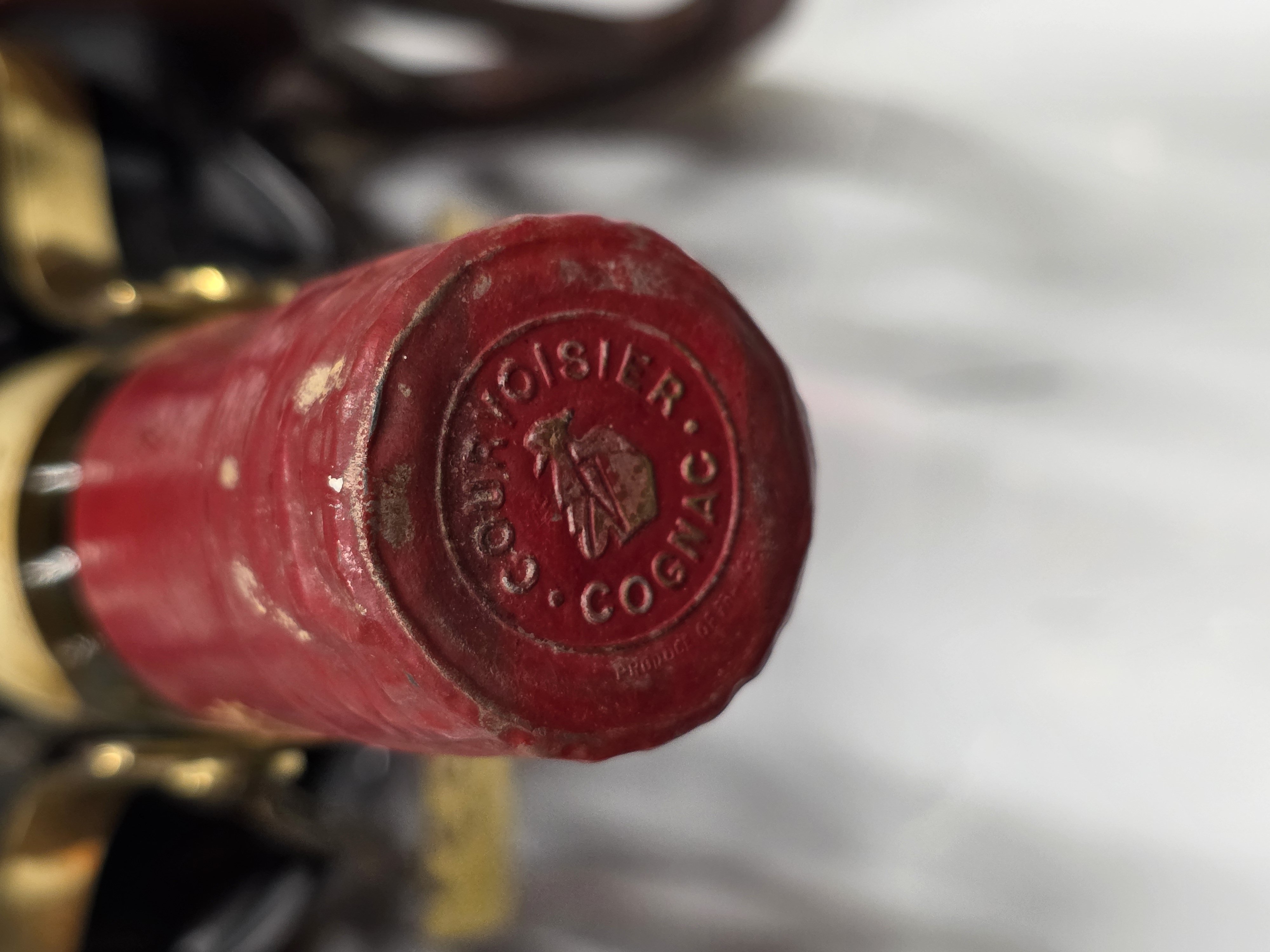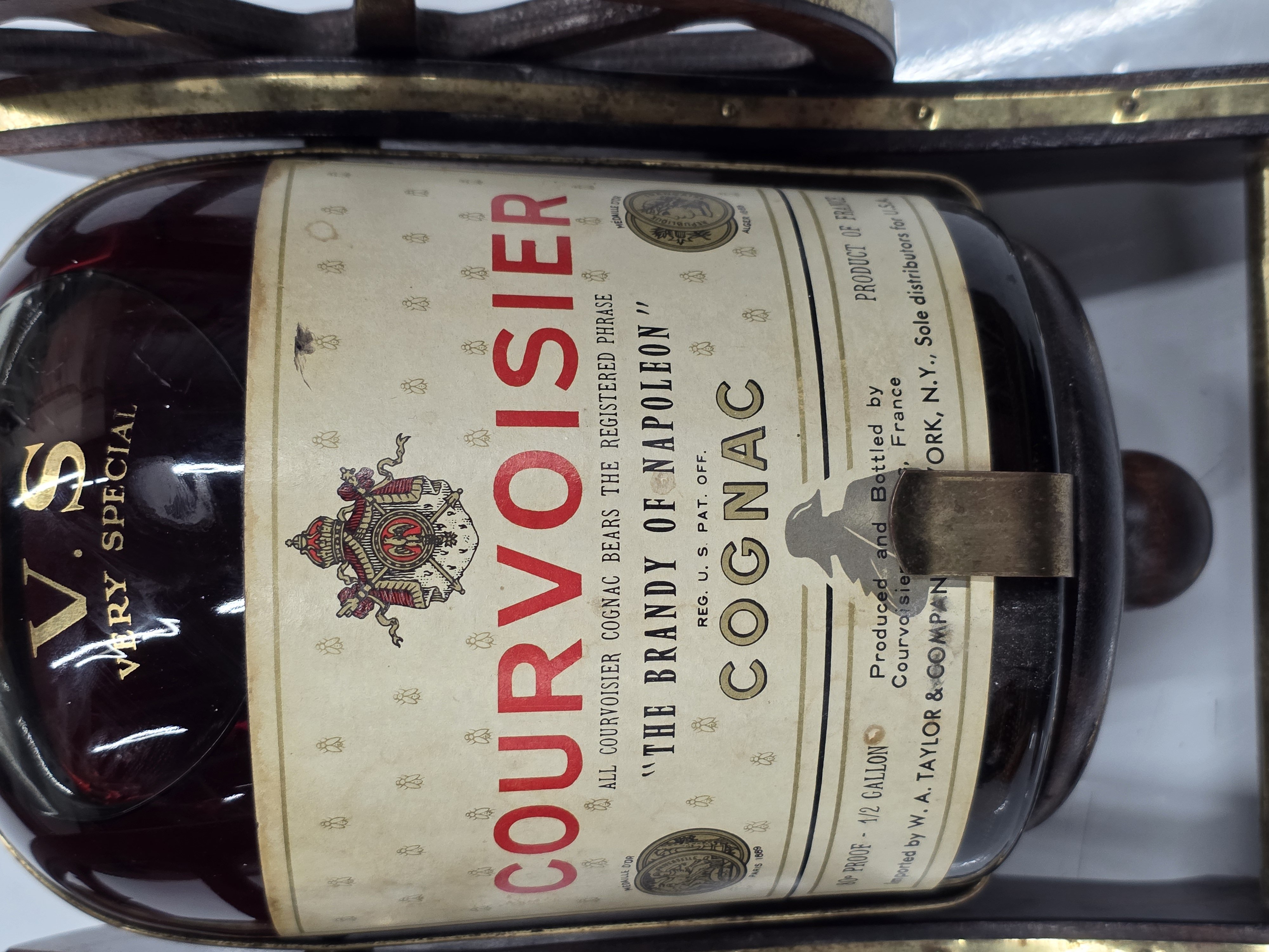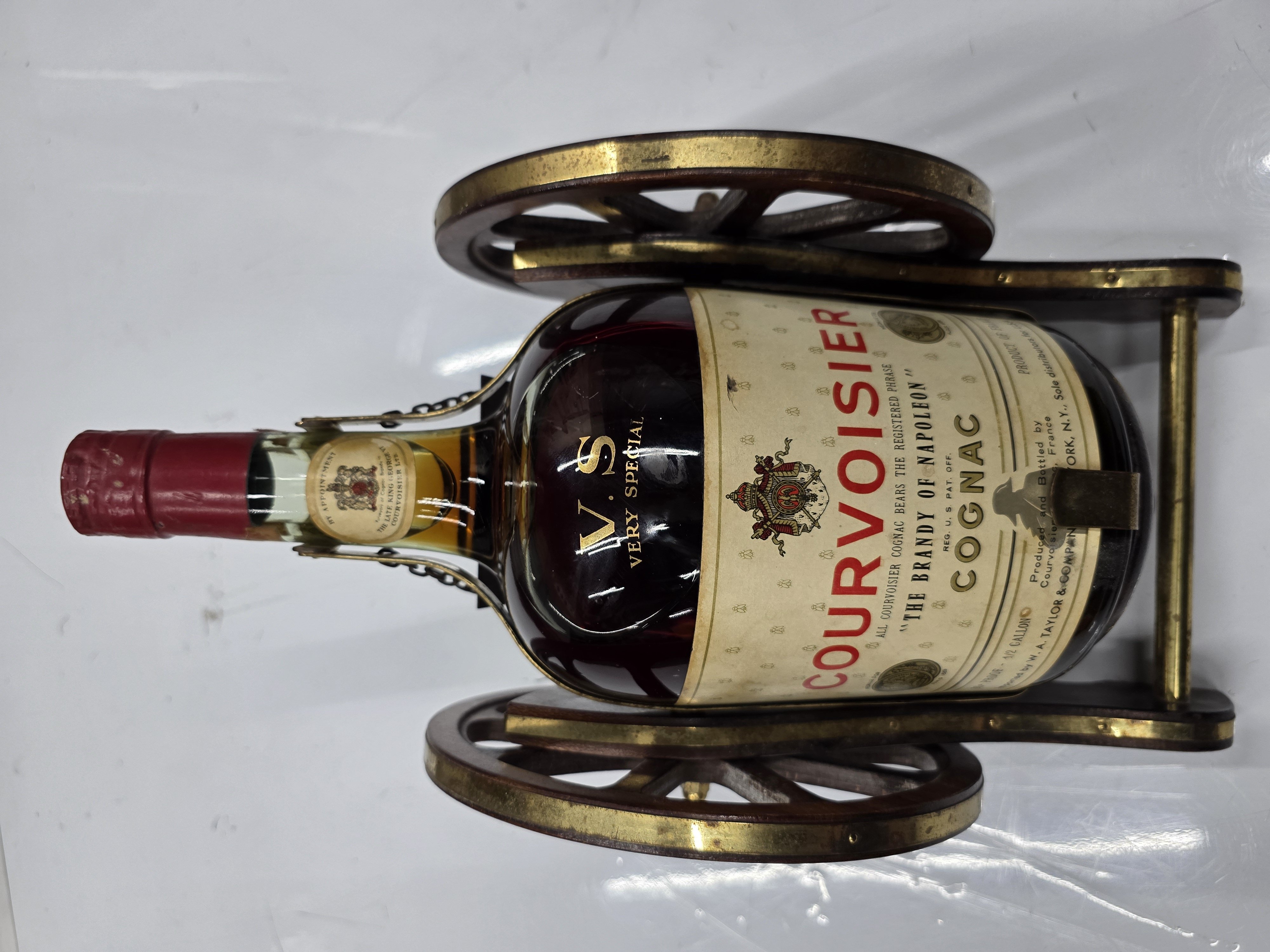 - 1) Text on label: Neck Label: BY APPOINTMENT Surveyors of Cognac Brandy to THE LATE KING GEORGE VI COURVOISIER LTD. Main Label (Upper): V.S VERY SPECIAL Main Label (Mid): COURVOISIER ALL COURVOISIER COGNAC BEARS THE REGISTERED PHRASE "THE BRANDY OF NAPOLEON" REG. U.S. PAT. OFF. COGNAC Main Label (Lower): 100 PROOF - 1/2 GALLON PRODUCT OF FRANCE Produced and Bottled by Courvoisier, Jarnac, France W. A. TAYLOR & COMPANY, NEW YORK, N.Y., Sole distributors for U.S. A. 2) Visual elements: Neck label: Features a British Royal Coat of Arms (lion and unicorn supporters with crown) within an oval frame. Appears in a serif font. Mid label (main): Features a large, ornate Napoleonic Imperial Eagle coat of arms with a crown and draping, set against a background pattern of small golden bees/flies. "COURVOISIER" is in large, prominent red block serif lettering. "THE BRANDY OF NAPOLEON" is in a decorative serif script. "COGNAC" is in bold, gold block serif. Lower label (main): Includes a dark silhouette of Napoleon Bonaparte in his bicorne hat, centered above the distributor information. Other text is in simple serif and sans-serif fonts. Bottle structure: The bottle is cradled within a decorative, dark wood and brass stand designed to resemble an antique cannon, complete with large wooden wheels with brass rims and brass chains connecting to the bottle's neck. Capsule: The capsule covering the cork is a solid red color, showing some minor wear and discoloration. 3) Fill level estimate: well above shoulder into neck: great