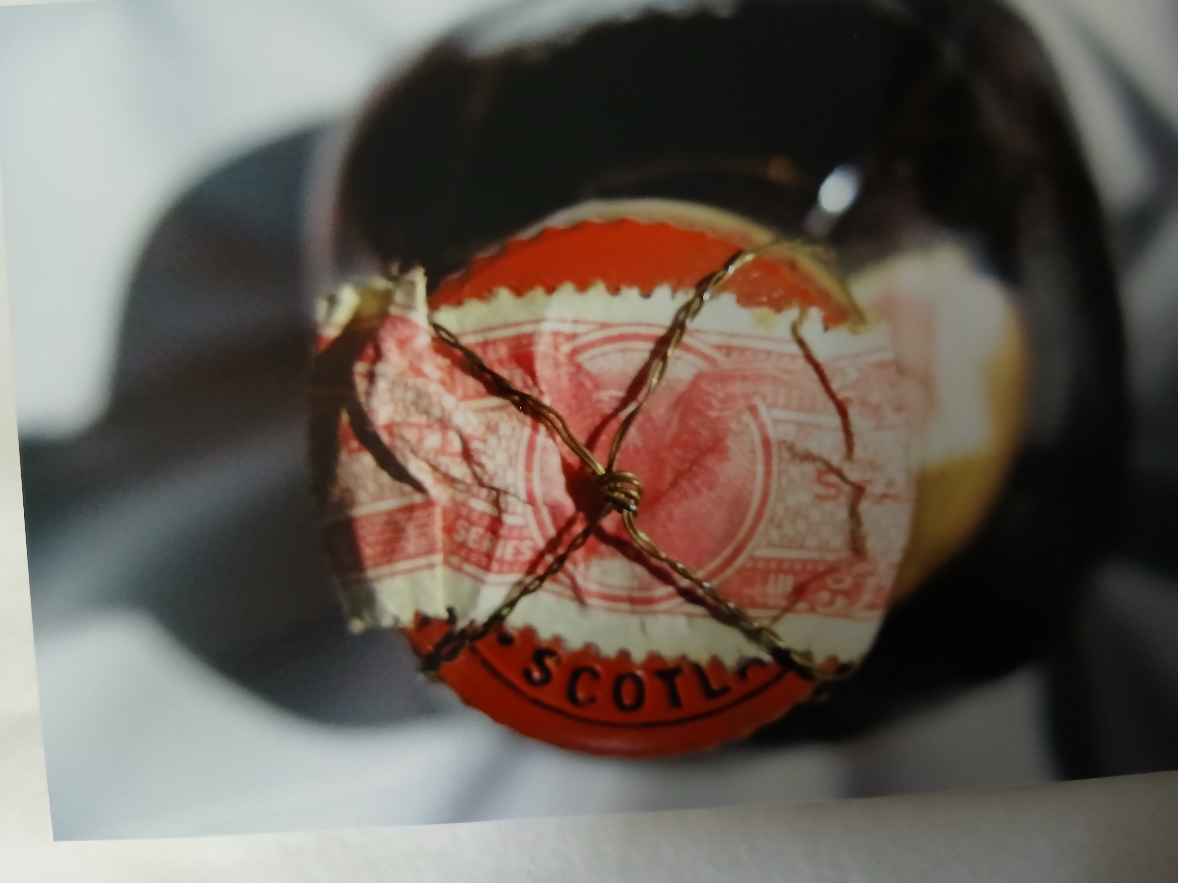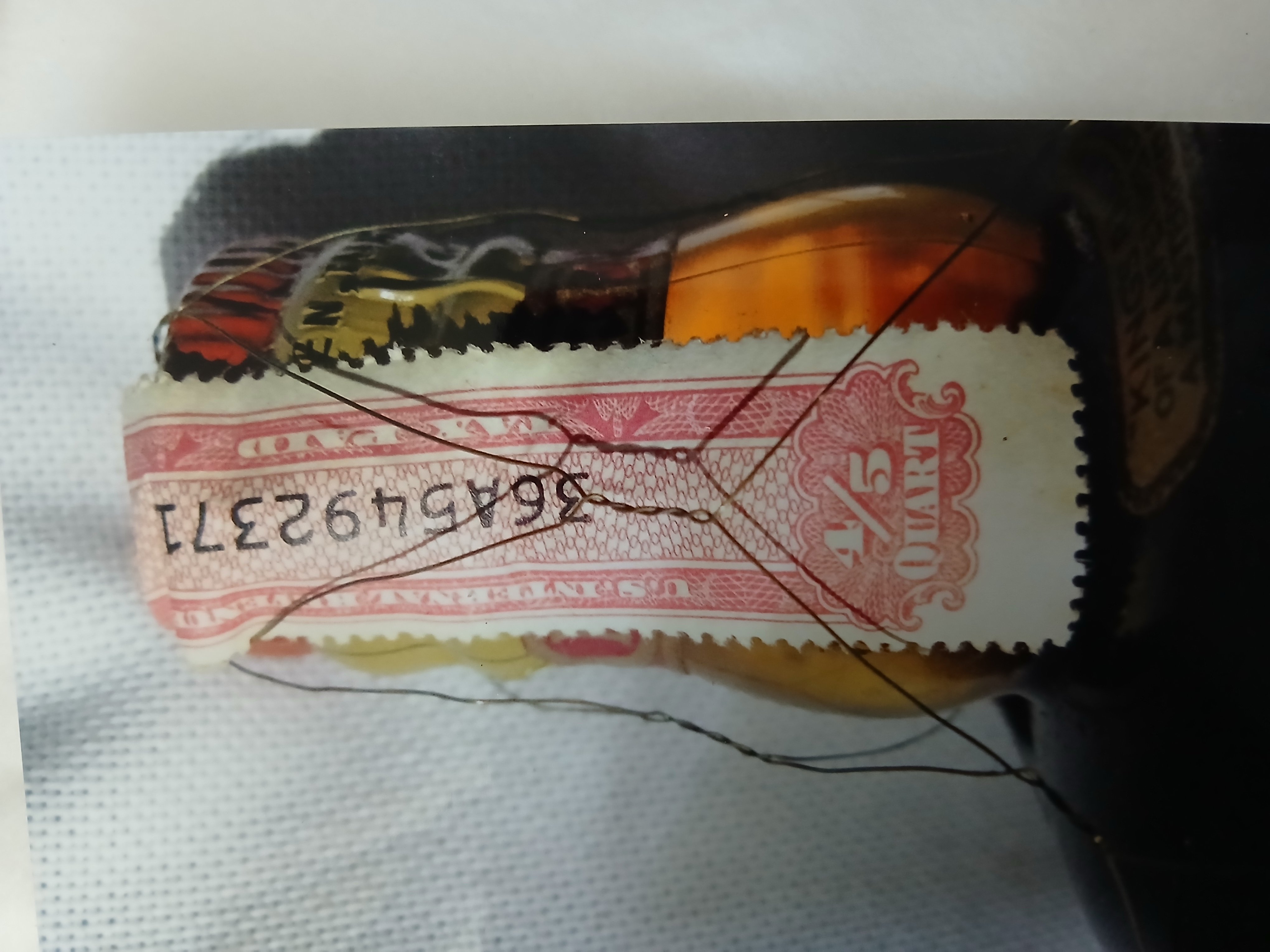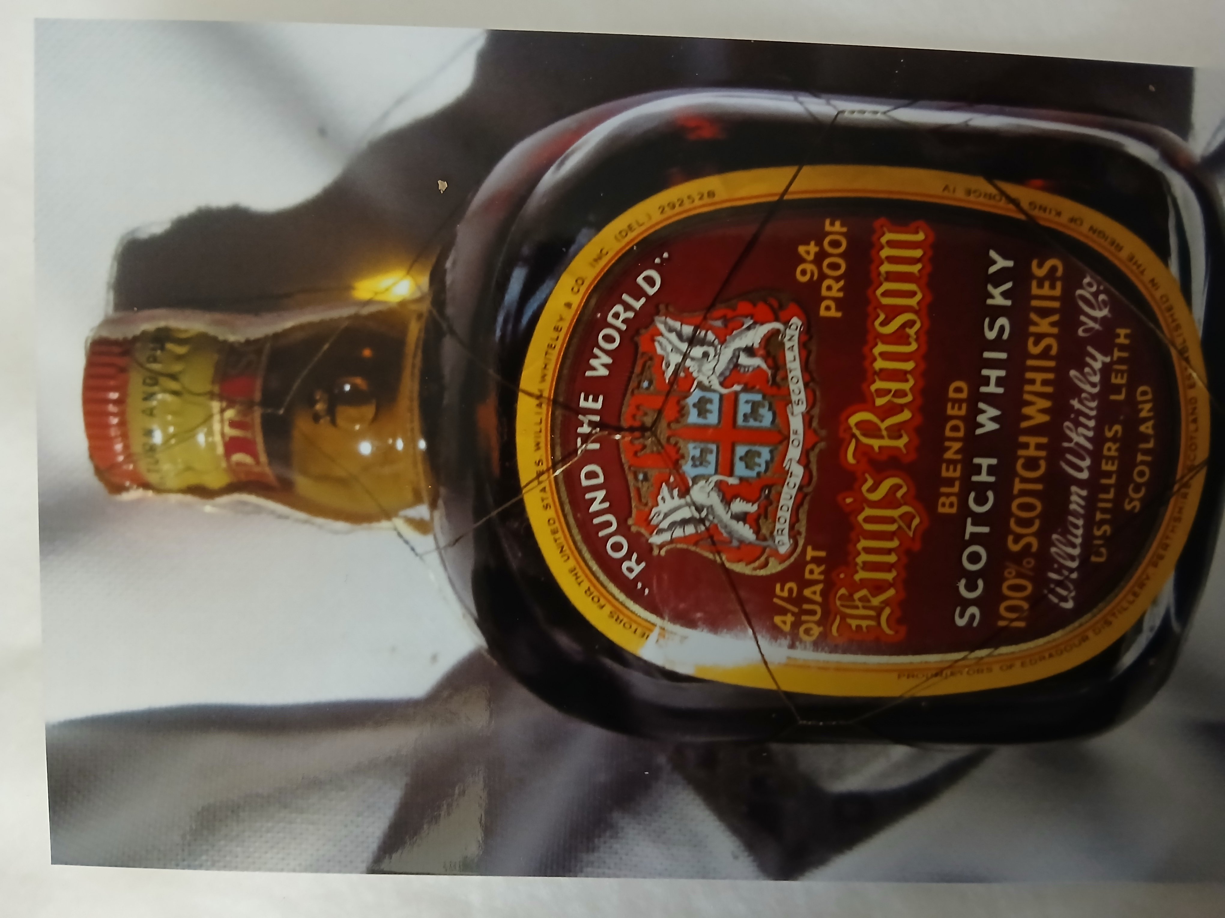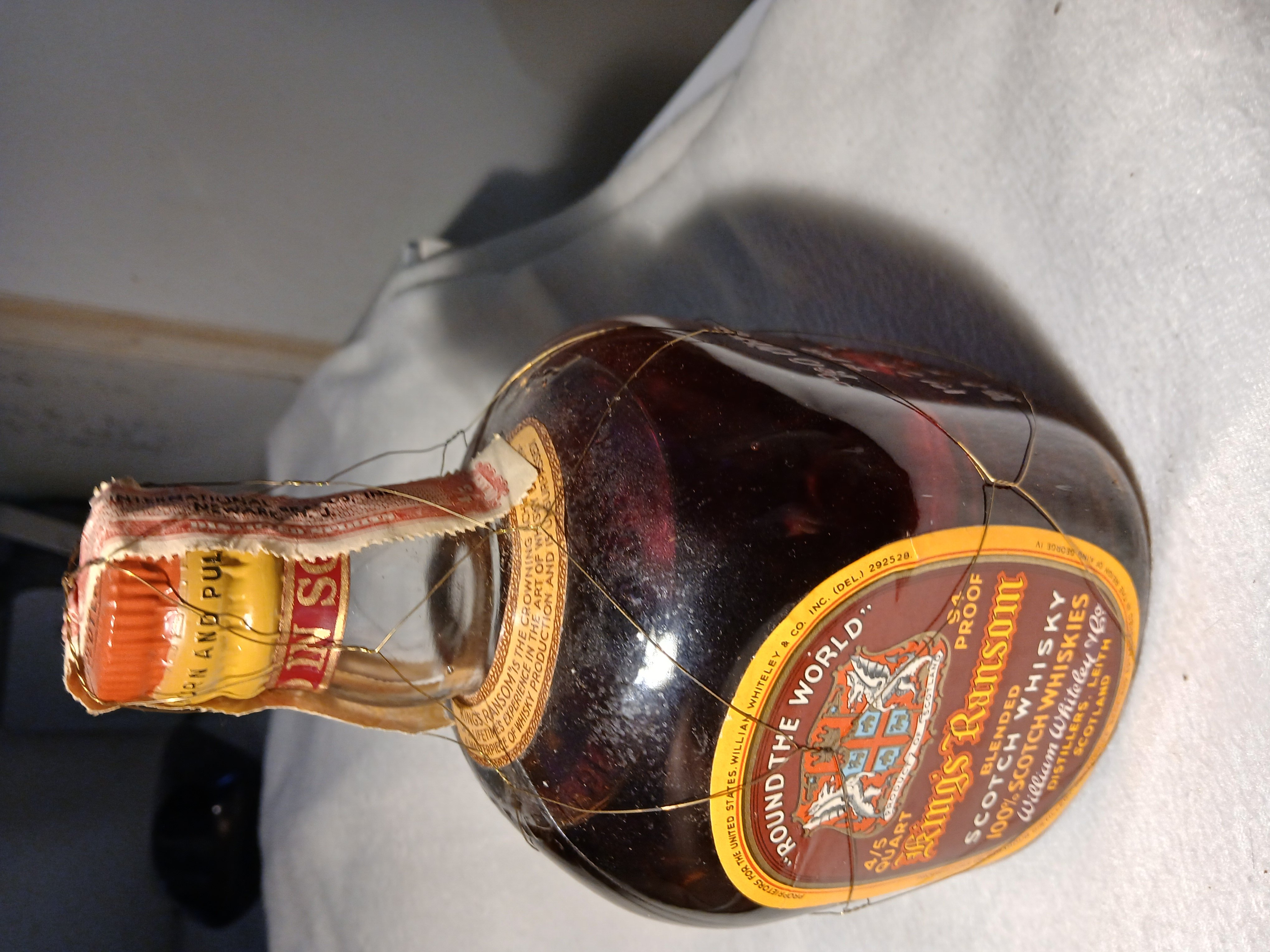 - 1) Text on label: Cap (yellow band): TURN AND PULL Neck strip: U.S. INTERNAL REVENUE / TAX PAID / 48 Upper label (around shoulder): KING'S RANSOM IS THE CROWNING ACH IEVEMENT OF A LIFETIMES EXPERIENCE IN THE ART OF WHISKY PRODUCTION AND IS UNSURPASSED. Main Label (gold border, top): PROPRIETORS FOR THE UNITED STATES. WILLIAM WHITELEY & CO. INC. (DEL.) 292520 Main Label (center, large): “ROUND THE WORLD” Main Label (left): 4/5 QUART Main Label (right): PROOF Main Label (brand name): King's Ransom Main Label (description): BLENDED / SCOTCH WHISKY / 100% SCOTCH WHISKIES Main Label (producer): William Whiteley & Co. Main Label (location): DISTILLERS, LEITH / SCOTLAND Main Label (gold border, bottom): ESTABLISHED IN THE REIGN OF KING GEORGE IV 2) Visual elements: Neck/Capsule: An orange ribbed screw cap is present, with a yellow band featuring sans-serif text. A red and white striped, perforated U.S. Internal Revenue tax band runs vertically from the cap down the neck, displaying "TAX PAID" and a number "48" within a stamp-like emblem. Upper Label: A thin, gold-bordered label encircles the neck/shoulder, containing descriptive serif text. Mid Label: The main label is a shield shape, predominantly red-brown with a gold border. It features a coat of arms depicting two rampant griffins supporting a quartered shield, topped with a crown. The main brand name "King's Ransom" is in a decorative serif font. "ROUND THE WORLD" is in a bold, sans-serif, block font. Other descriptive text uses a clear serif font, while "William Whiteley & Co." is in a cursive/script font. Overall: The entire bottle, with its distinctive flattened, rounded shape, is encased in a gold wire mesh. 3) Fill level estimate: below shoulder: not that good