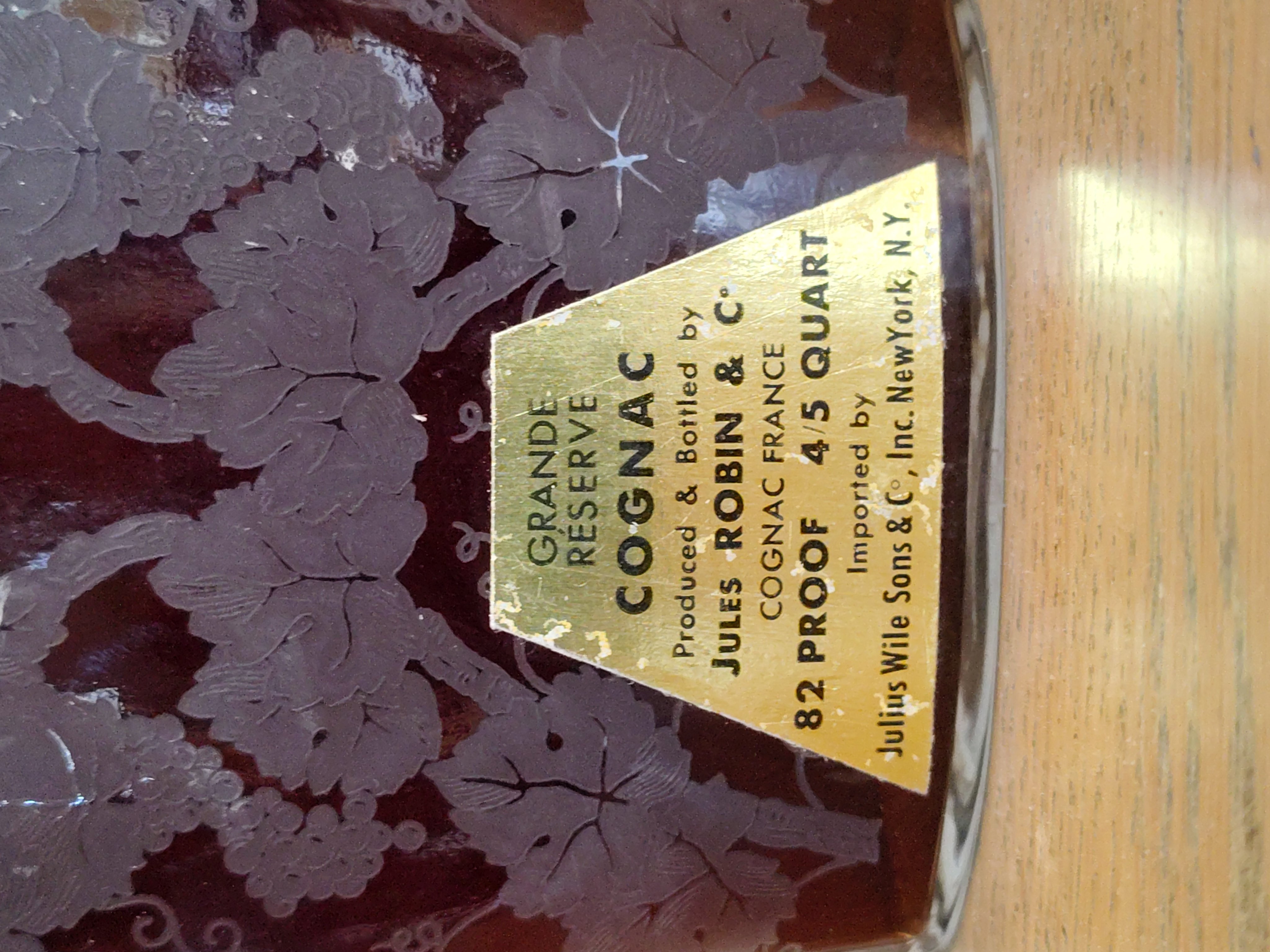 - 1) Text on label: GRANDE RÉSERVE COGNAC Produced & Bottled by JULES ROBIN & Cie COGNAC FRANCE 82 PROOF - 4/5 QUART Imported by Julius Wile Sons & Co, Inc. New York, N.Y. 2) Visual elements: The bottle's body and shoulder are adorned with an etched or frosted pattern depicting vine leaves and bunches of grapes. The main label, located on the lower mid-body, is gold-colored and has a distinctive hexagonal/shield-like shape. The text on the label employs a mix of font styles: prominent sans-serif block letters for "GRANDE RÉSERVE" and "COGNAC", and serif fonts for brand names like "JULES ROBIN & Cie" and "Julius Wile Sons & Co, Inc. New York, N.Y.", with smaller sans-serif text for descriptive lines. 3) Fill level estimate: well above shoulder into neck: great