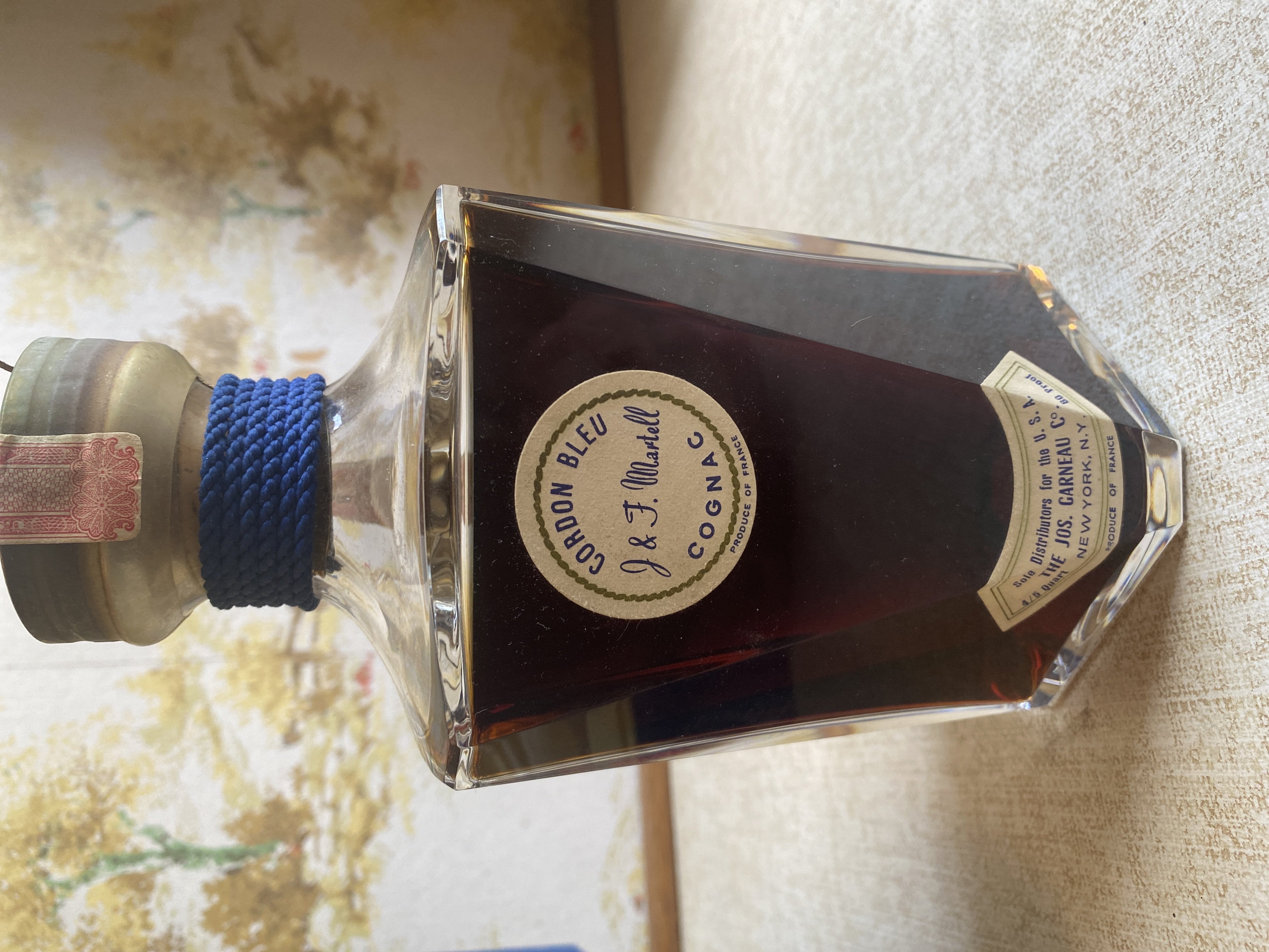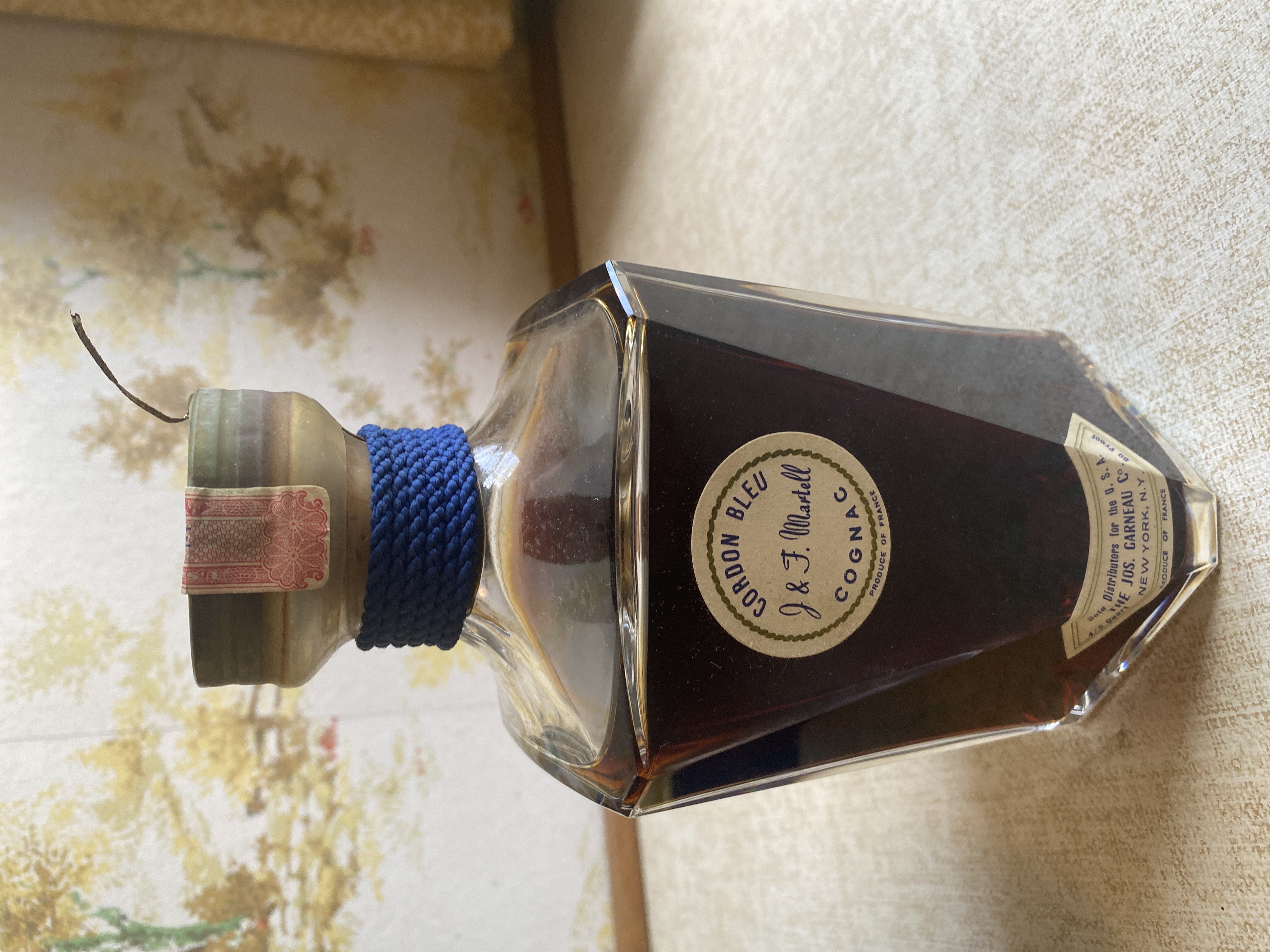 - Here is the analysis of the image: 1) Text on label: **Mid label:** CORDON BLEU J & F. Martell COGNAC PRODUCE OF FRANCE **Lower label:** Sole Distributors for the U. S. A. 1/5 QUART THE JOS. GARNEAU CO. 80 Proof NEW YORK, N. Y. PRODUCE OF FRANCE 2) Visual elements (concise): * **Neck**: A blue braided cord is wrapped around the lower part of the neck. * **Capsule/Upper Neck**: A red and cream strip label, likely a tax band, with an intricate patterned design including a central circular motif, is affixed over the capsule and upper neck. * **Mid label**: Circular label with a green braided/rope-like border. * **Lower label**: Rectangular label with slightly curved upper and lower edges. * **Font style(s)**: "GORDON BLEU" and "COGNAC" use a sans-serif font. "J & F. Martell" is in a cursive/script style. Other text, such as "PRODUCE OF FRANCE" and the distributor information, appears in a serif font. 3) Fill level estimate: Above shoulder (very good). The liquid level extends slightly into the neck, well above where the shoulder begins to curve.