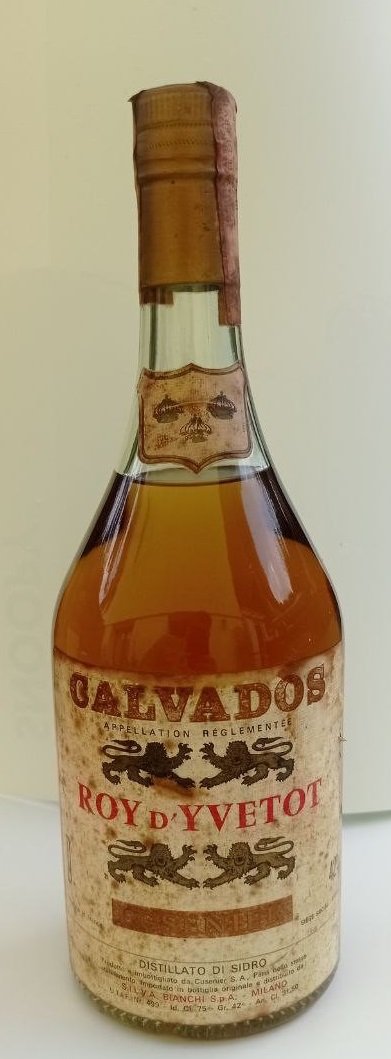 - Calvados - Appellation Reglementee - Roy d'Yvetout - Cusenier Distillato di Sidro - Prodotto e imbottigliato da Cusenier S. A. - Paris nello stesso stabilimento - Importato in bottiglia originale e distribuito da SILVA BIANCHI Spa Milano UTAF nr 499 - Id. cl. 75 - Gr. 42° - An. Cl. 31.50.