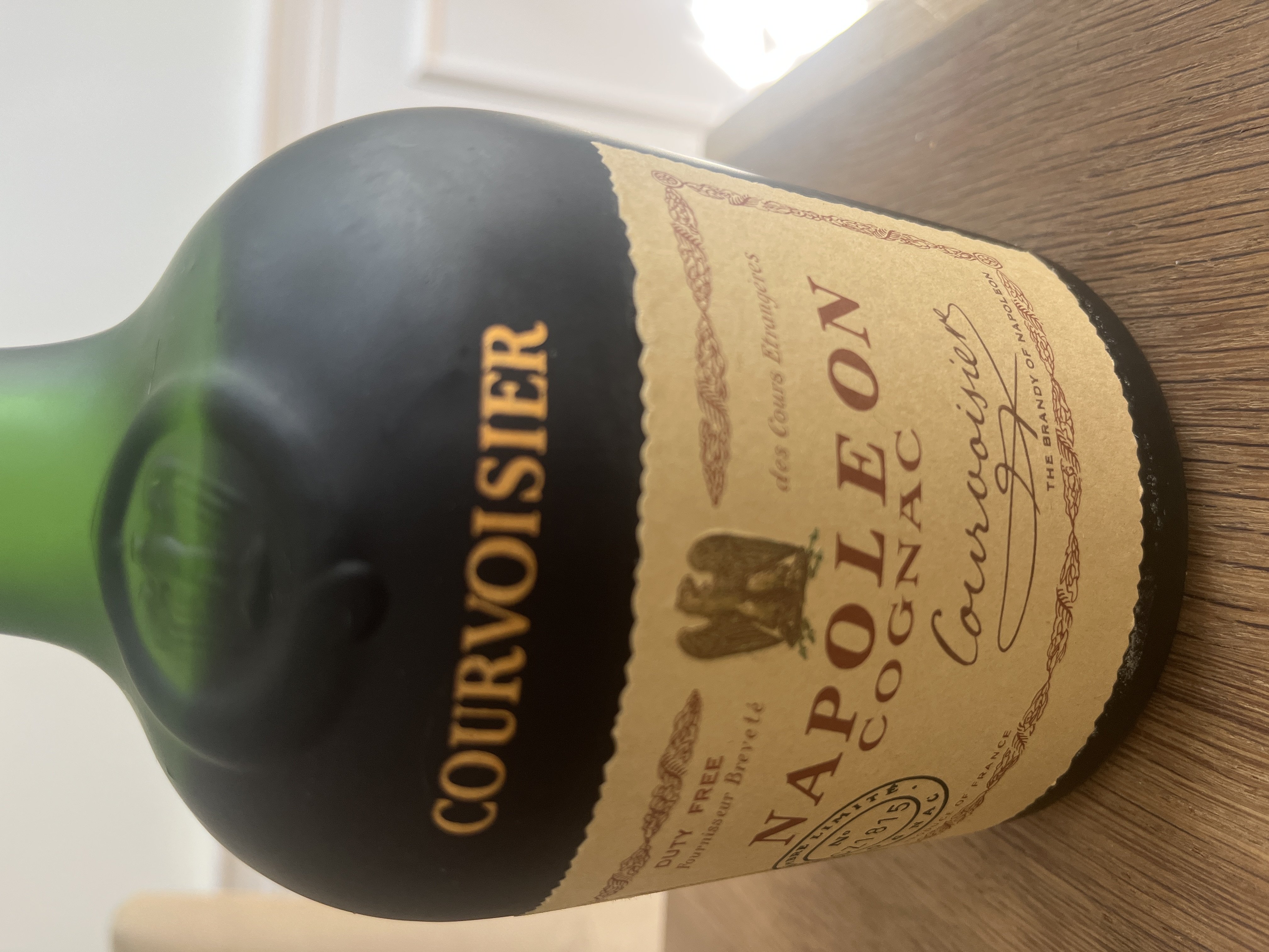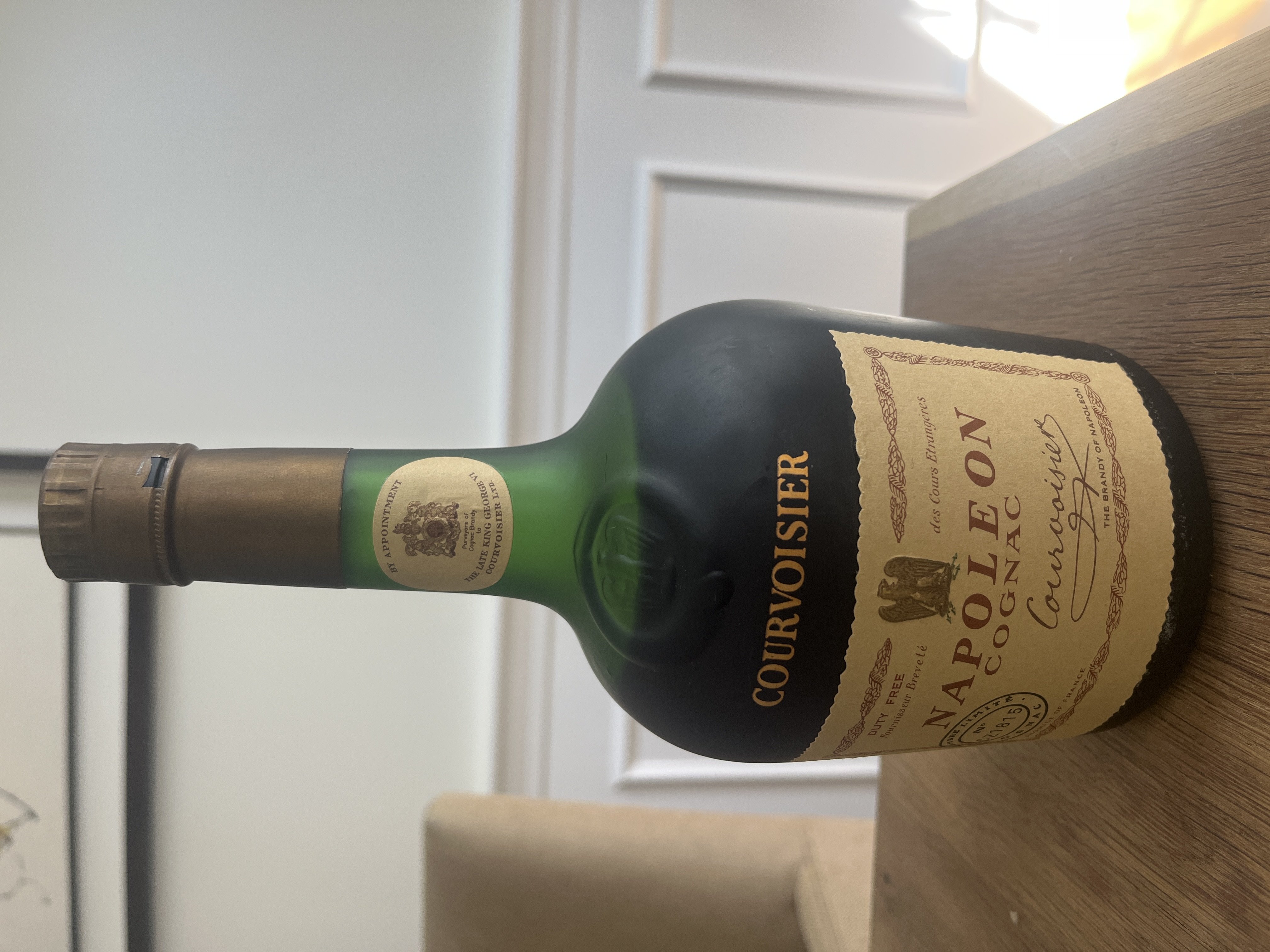 - Main Label: BY APPOINTMENT Purveyors of Cognac Brandy to THE LATE KING GEORGE VI COURVOISIER LTD. COURVOISIER Fournisseur Breveté des Cours Etrangères NAPOLEON COGNAC Courvoisier THE BRANDY OF NAPOLEON N° 271815 PRODUCE OF FRANCE. Neck Label: DUTY FREE.