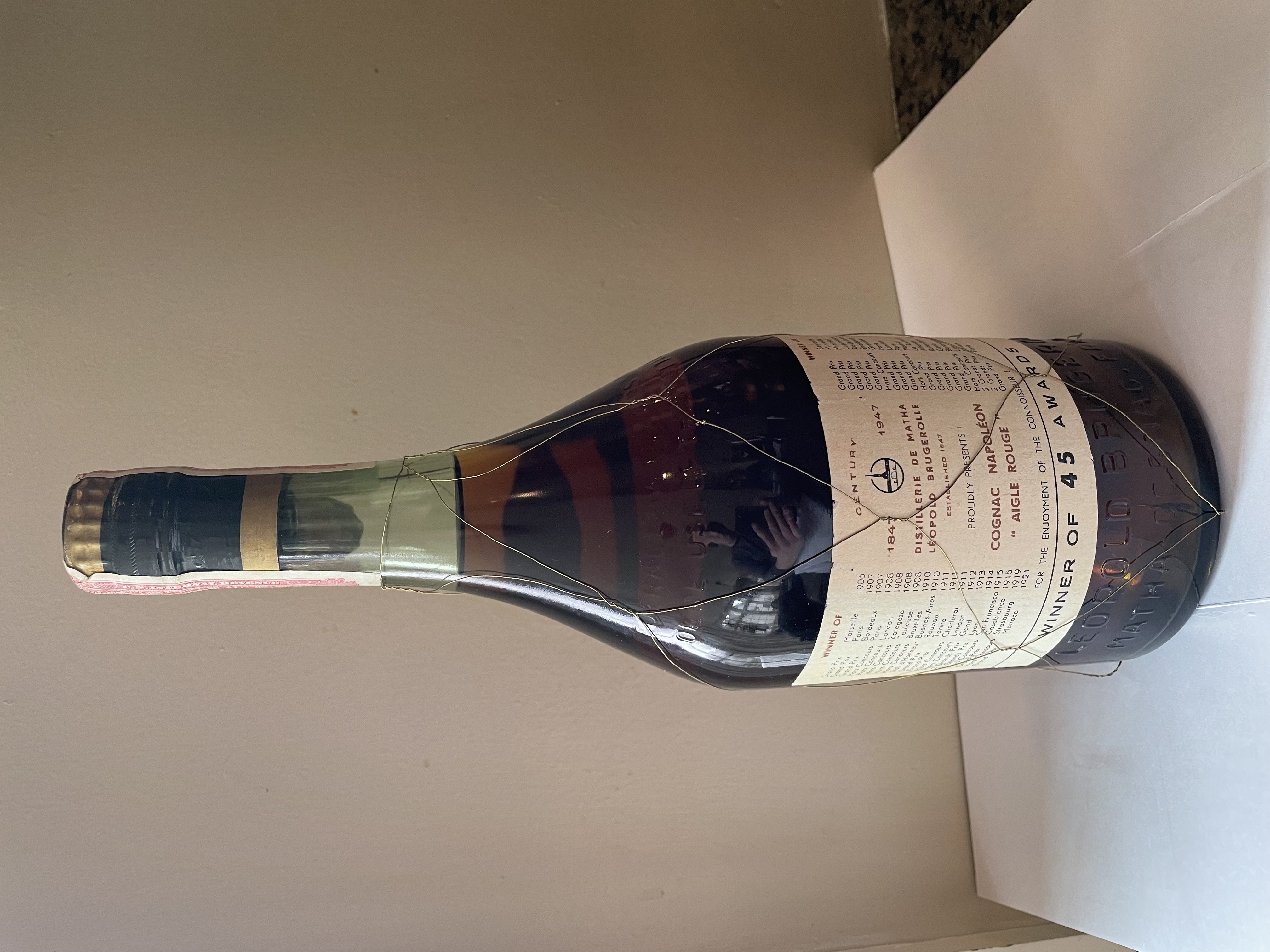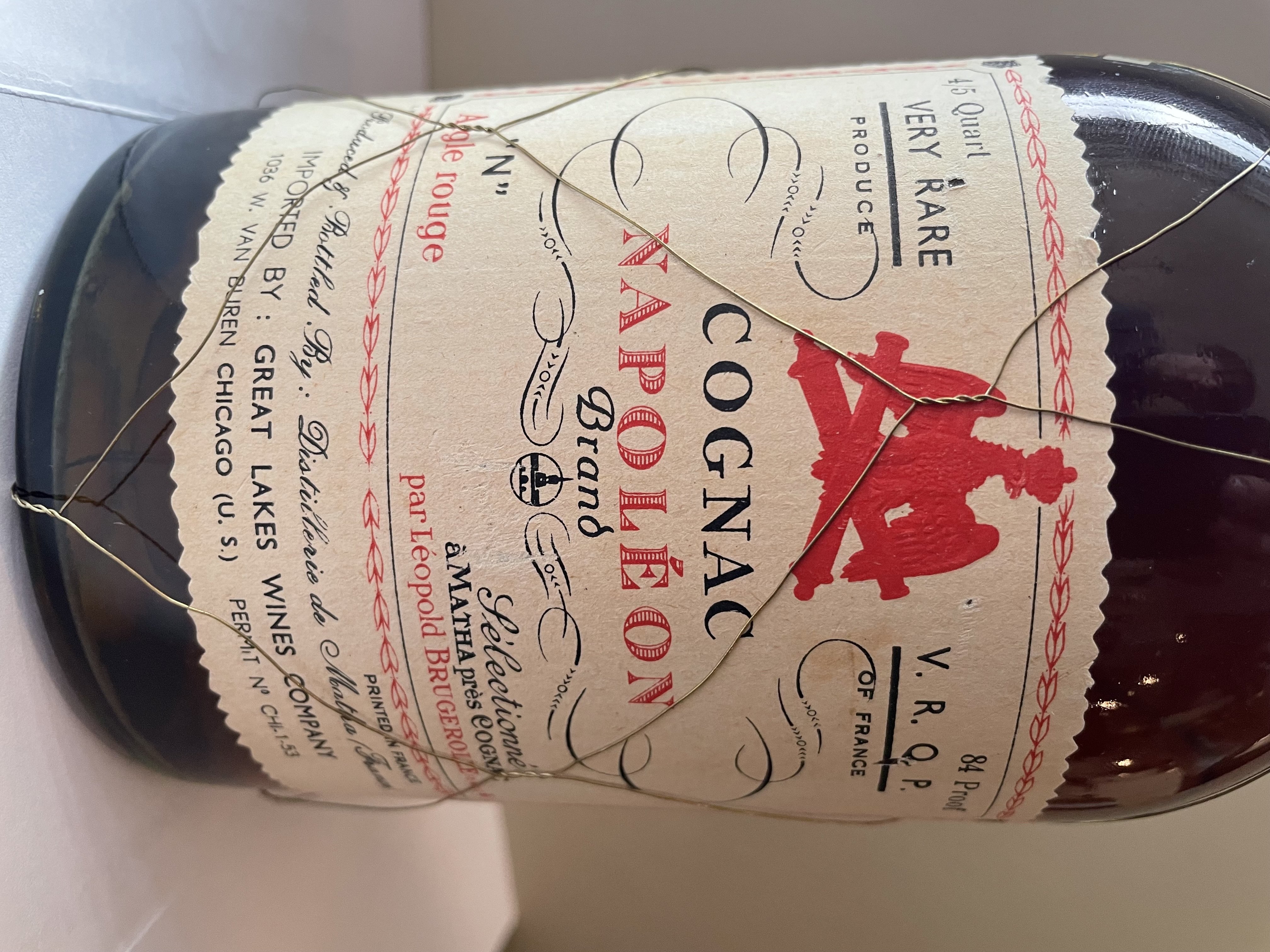 - Produit de France Winner of 45 awards 4/5 quart Very rare 84 proof V.R.Q.P. of France Cognac Napoleon Brand "N" Aigle rouge Lelectionne aMatha pres Cognac par Leopold Brugerolle Printed in France Produced or bottled by Distillerie de Martha (Frances) Imported by Great Lakes WIne Company 1036 W Van Buren Chicago (U.S.) permit no CHI-1-53 Century 1847 - 1947 Distillerie de Matha Leopold Brugerolle Established 1847 Proudly presents! Cognac Napoleon "Aigle Rouge" For the enjoyment of the connoisseur