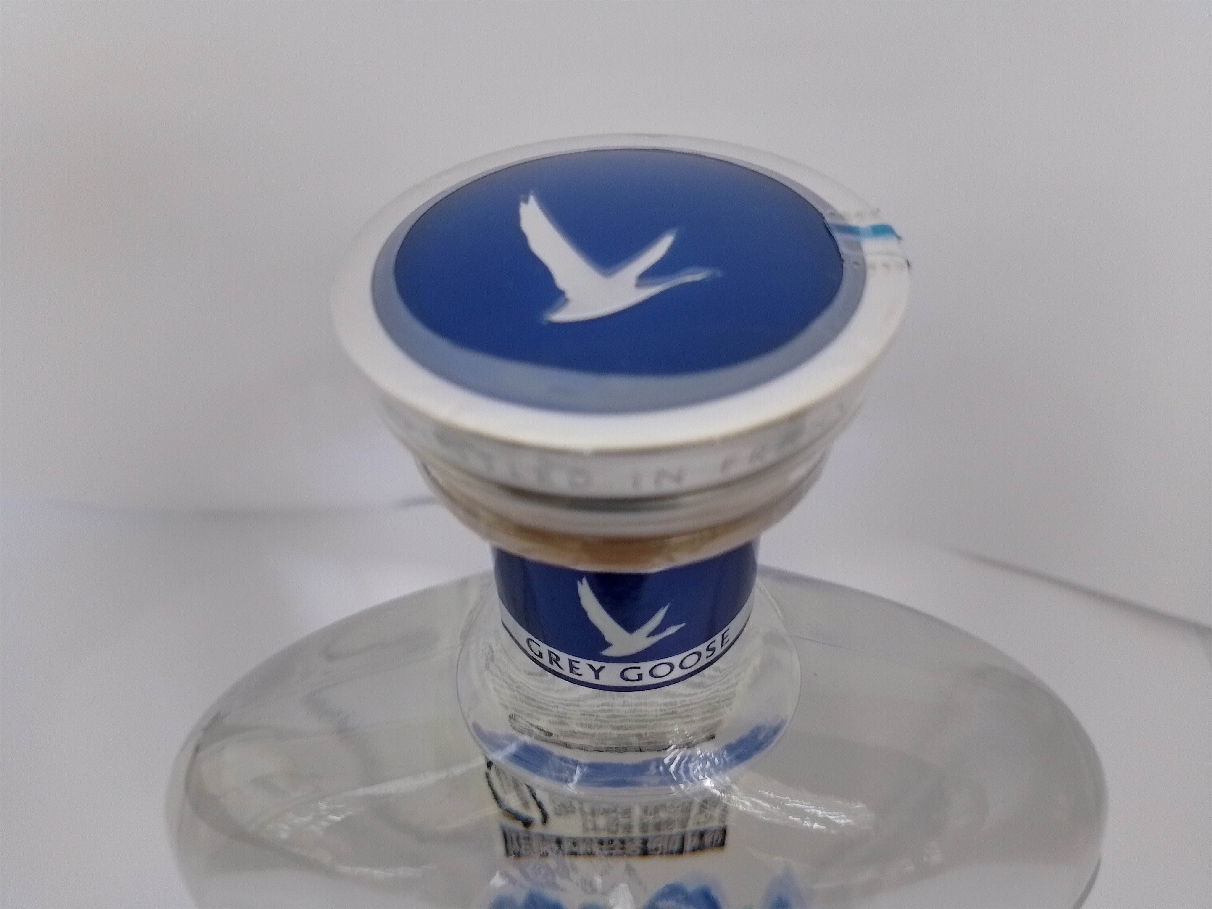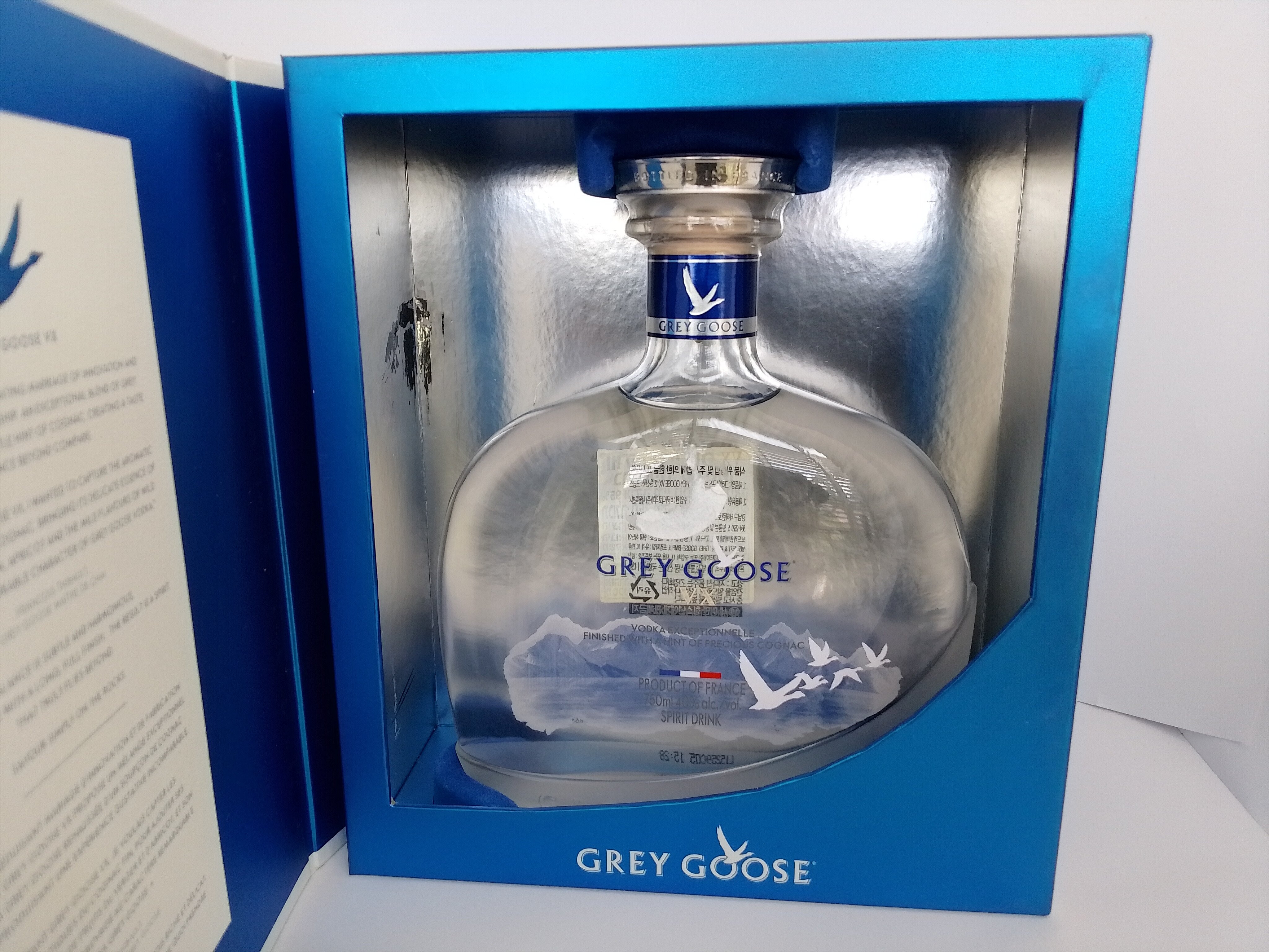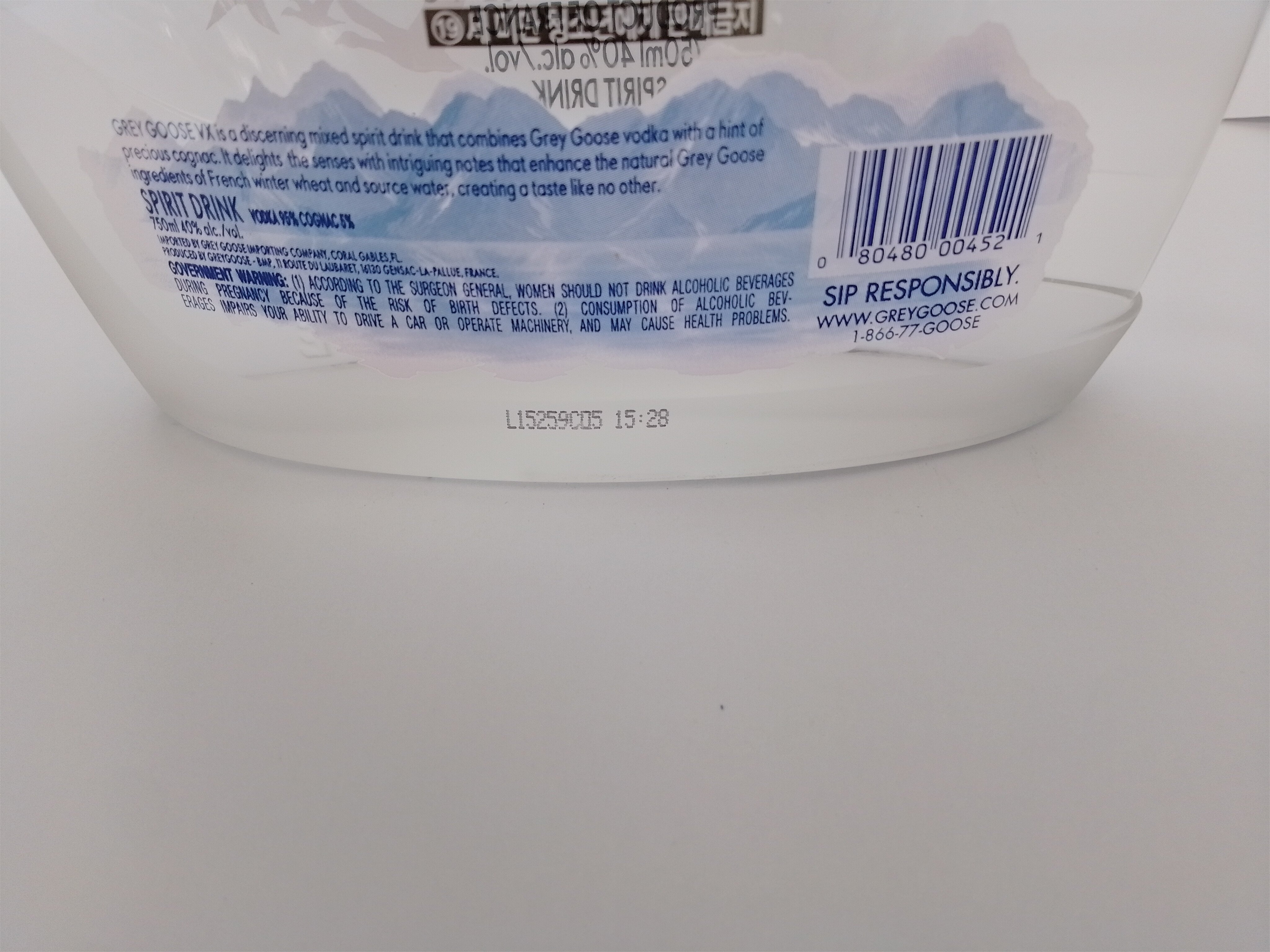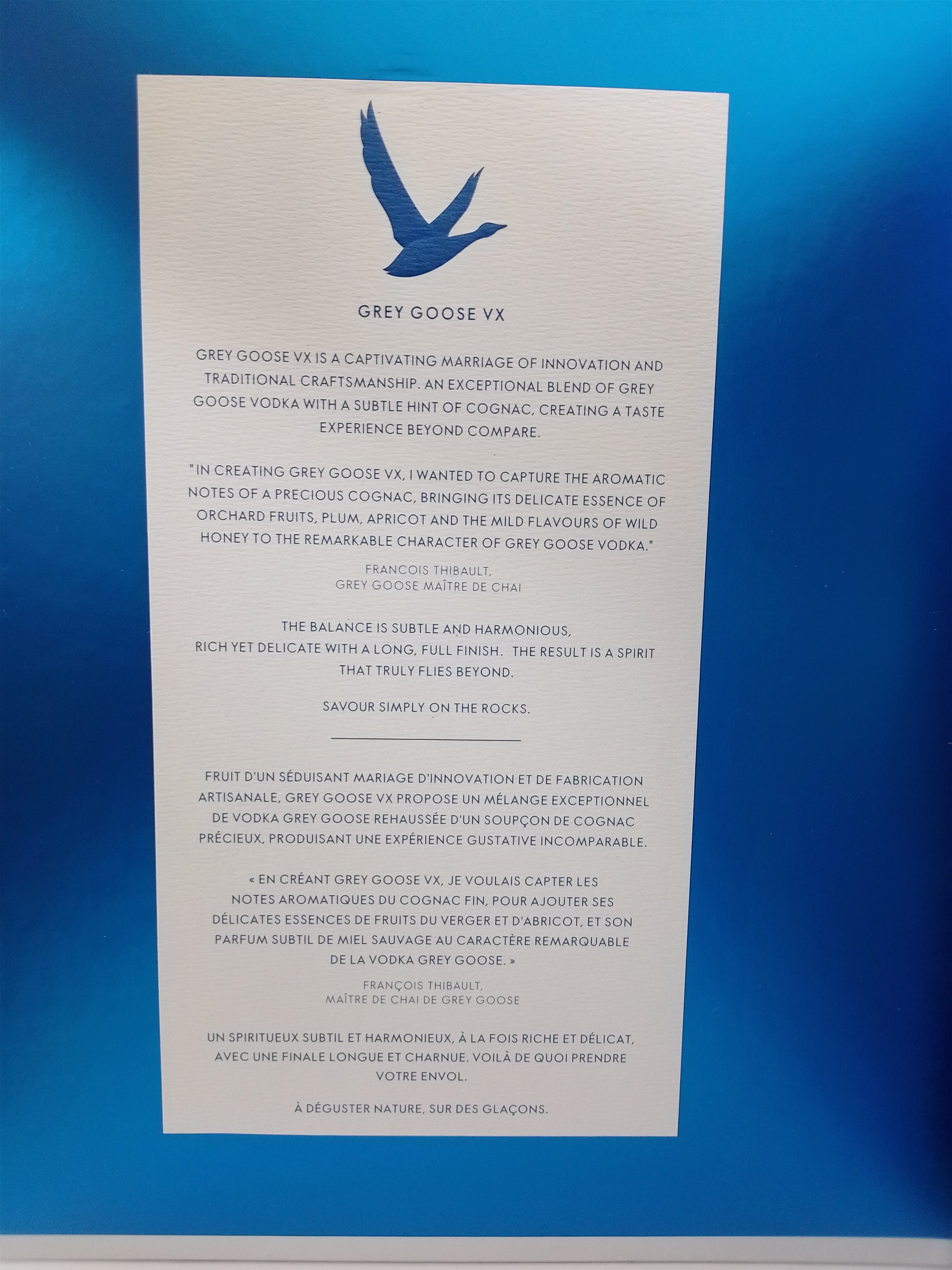 - FRONT LABEL: GREY GOOSE VX, VODKA EXCEPTIONNELLE, VODKA AND A HINT OF PRECIOUS COGNAC, PRODUCED AND BOTTLED IN FRANCE. BACK LABEL: GREY GOOSE VX IS AN EXCLUSIVE EDITION OF GREY GOOSE VODKA MASTERFULLY FINISHED WITH A HINT OF PRECIOUS COGNAC MADE BY FRANÇAIS THIBAULT, MAÎTRE DE CHAI, VX IS BEST ENJOYED ON THE ROCKS IN A FINE SNIFTER GLASS. 40% ALC./VOL. 75cl e. LOT: L15259C05.