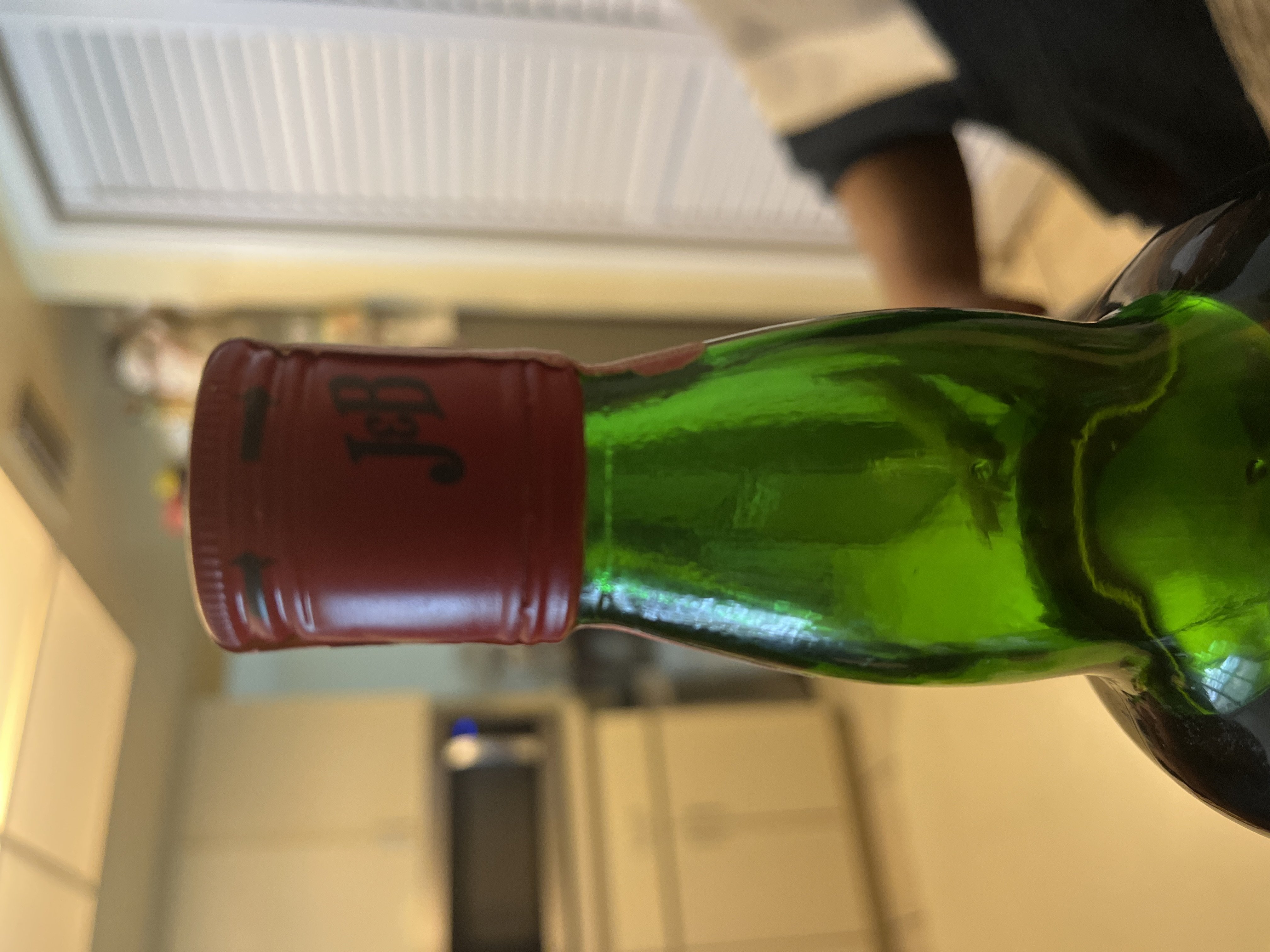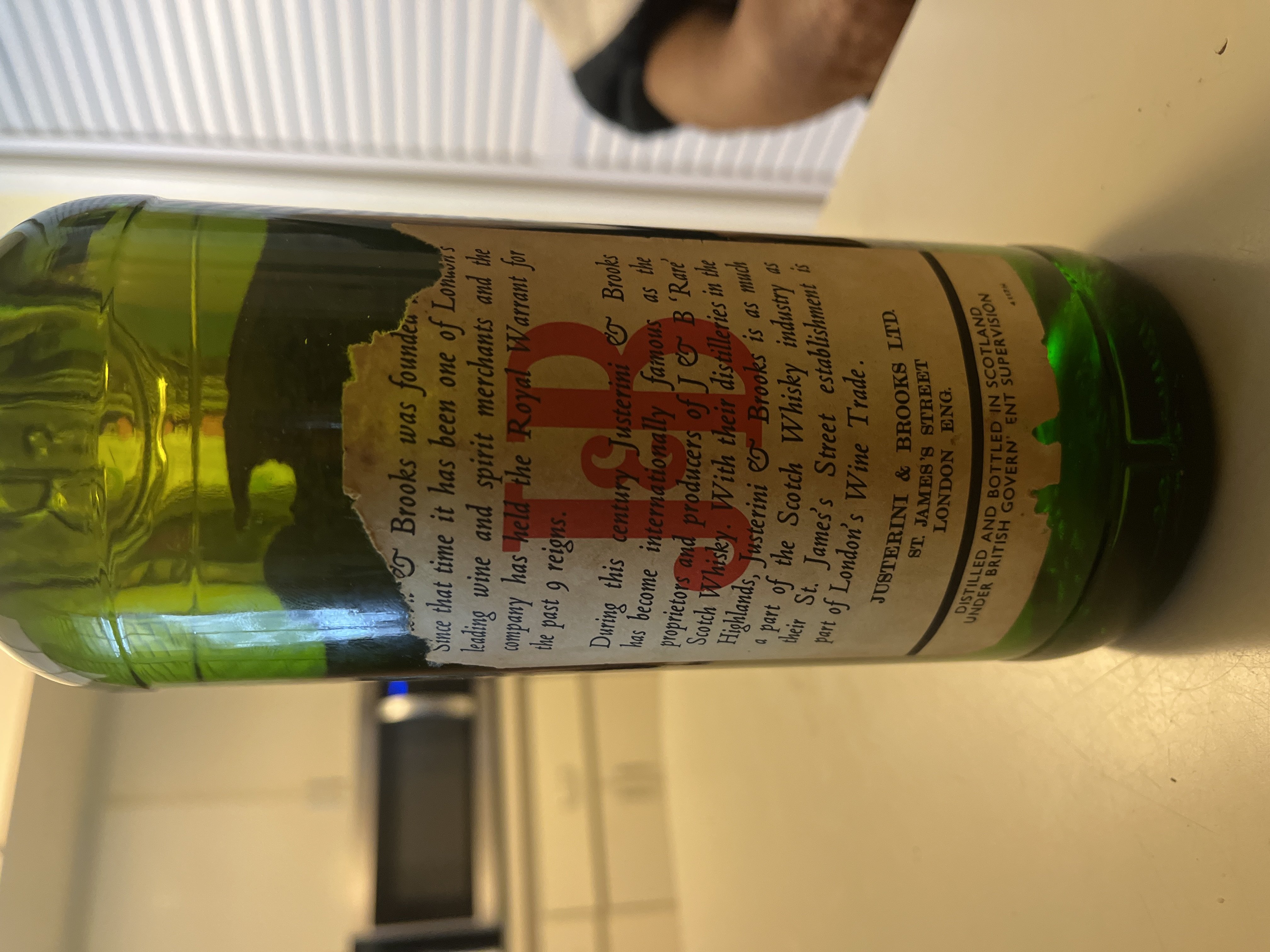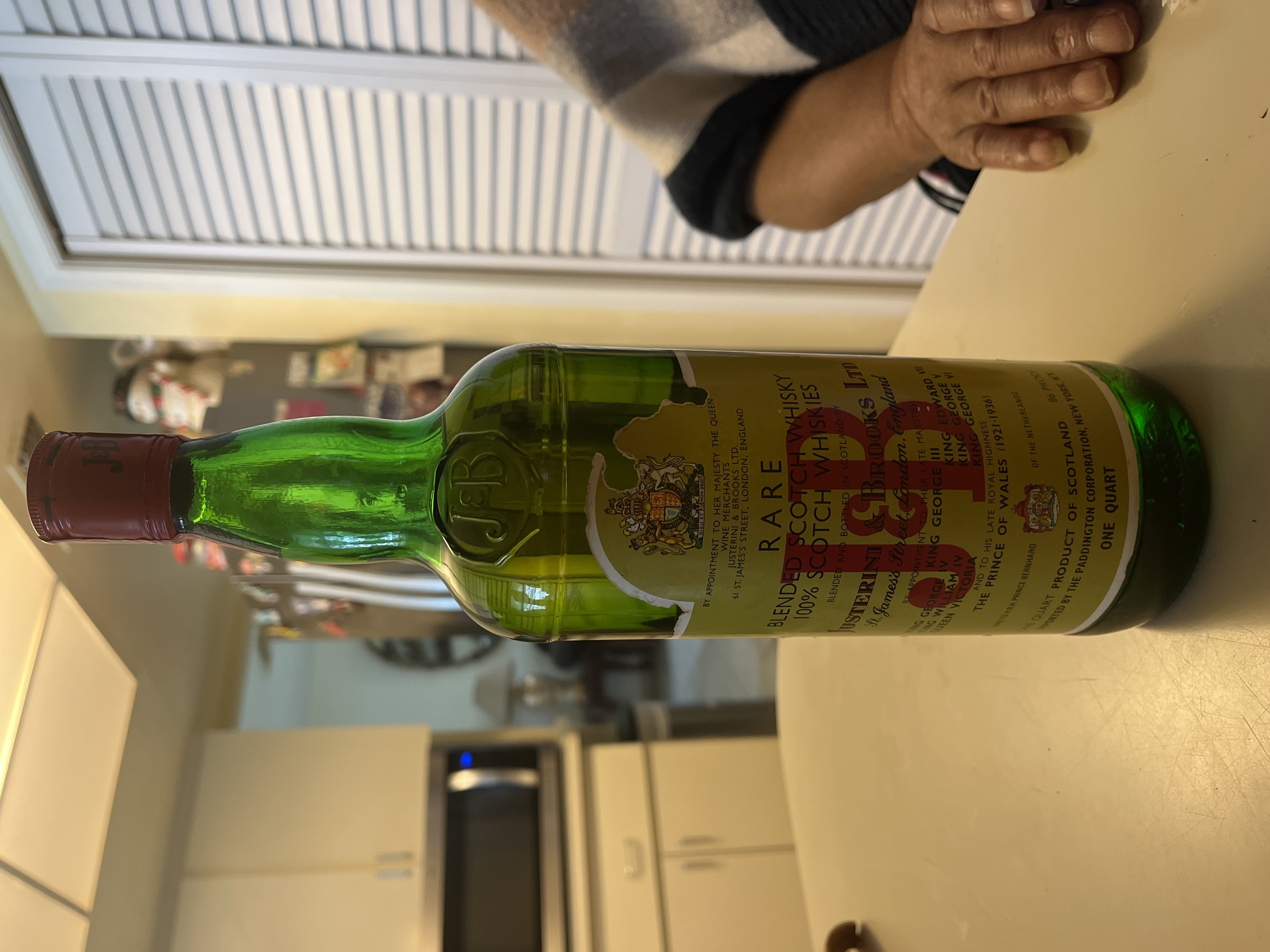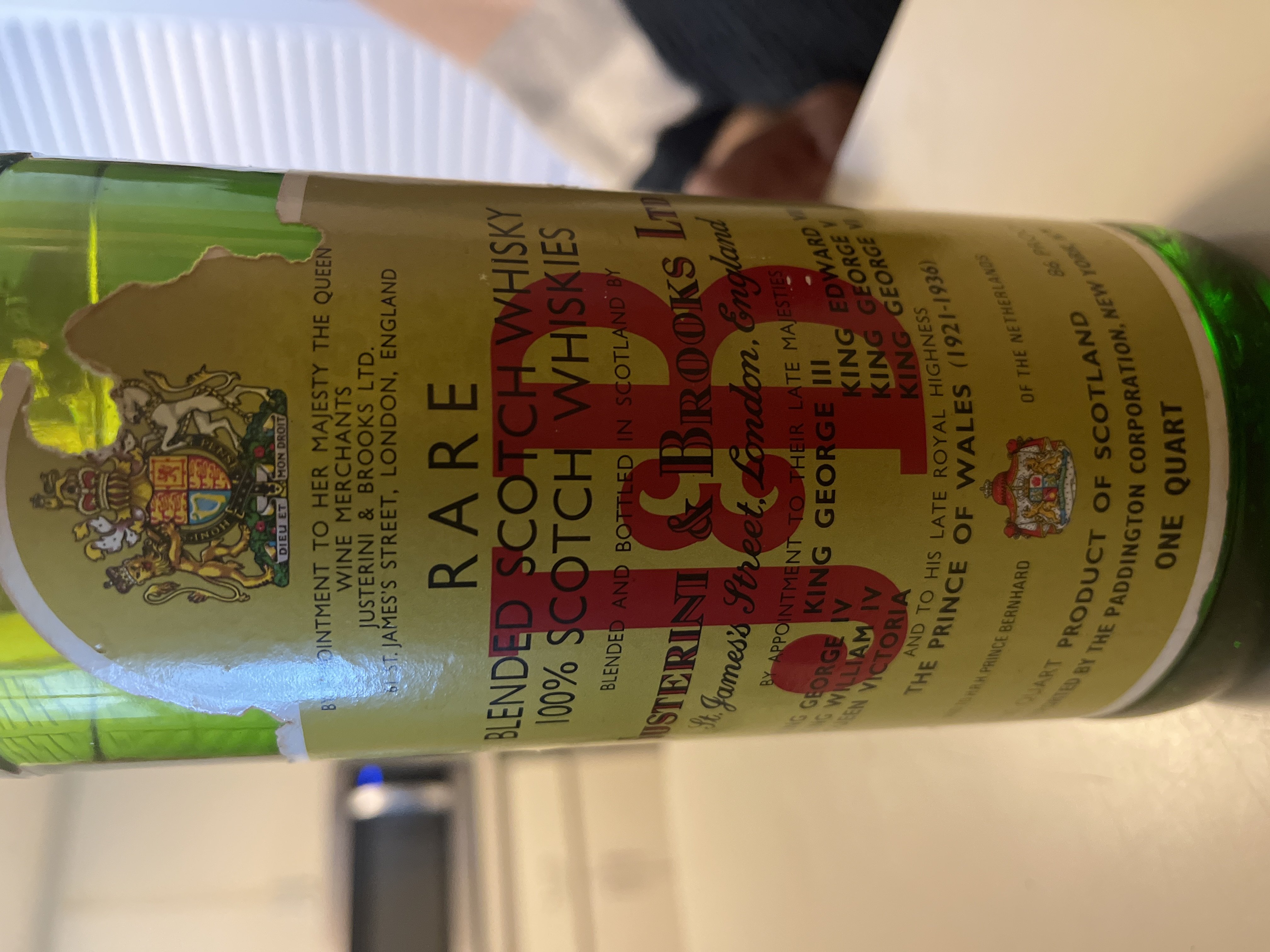 - Here is the analysis of the image: ### 1) Text on label: BY APPOINTMENT TO HER MAJESTY THE QUEEN WINE MERCHANTS JUSTERINI & BROOKS LTD. 61 ST. JAMES'S STREET, LONDON, ENGLAND RARE BLENDED SCOTCH WHISKY 100% SCOTCH WHISKIES BLENDED AND BOTTLED IN SCOTLAND BY J&B JUSTERINI & BROOKS Ltd St. James's Street, London, England BY APPOINTMENT TO THEIR LATE MAJESTIES KING GEORGE III KING EDWARD VII KING GEORGE IV KING GEORGE V KING WILLIAM IV KING GEORGE VI QUEEN VICTORIA AND TO HIS LATE ROYAL HIGHNESS THE PRINCE OF WALES (1921-1936) AND TO H.R.H. PRINCE BERNHARD OF THE NETHERLANDS A QUART PRODUCT OF SCOTLAND 86 PROOF IMPORTED BY THE PADDINGTON CORPORATION, NEW YORK, N.Y. ONE QUART *(Note: "J&B" on the capsule and embossed on the glass are separate visual elements, not part of the main label text transcription.)* ### 2) Visual elements (concise): * **Royal Coat of Arms:** A detailed British royal coat of arms (lion, unicorn, shield, "DIEU ET MON DROIT" banner) appears on the upper label. * **Monogram (Capsule):** "J&B" in a serif font is printed in white on the red neck capsule. * **Monogram (Embossed):** "J&B" in a serif font is embossed within an oval shape on the glass at the bottle's shoulder. * **Main Branding:** "J&B" in large, bold, red serif font dominates the mid-label. * **Font Styles:** The main body text uses a serif font. "RARE" and "BLENDED SCOTCH WHISKY" appear in a sans-serif style. "JUSTERINI & BROOKS Ltd" is also in a serif font, following a curved path. * **Label Design:** The main label has an irregular, somewhat organic shape with a white border against a yellowish/gold background. ### 3) Fill level estimate: Above shoulder (good). The liquid level is at the very base of the neck, indicating minimal evaporation.
