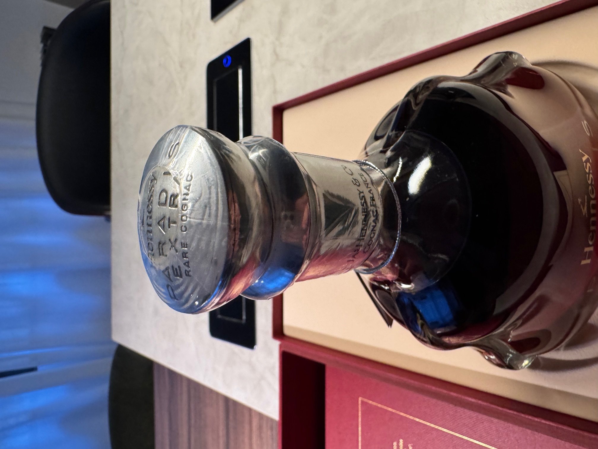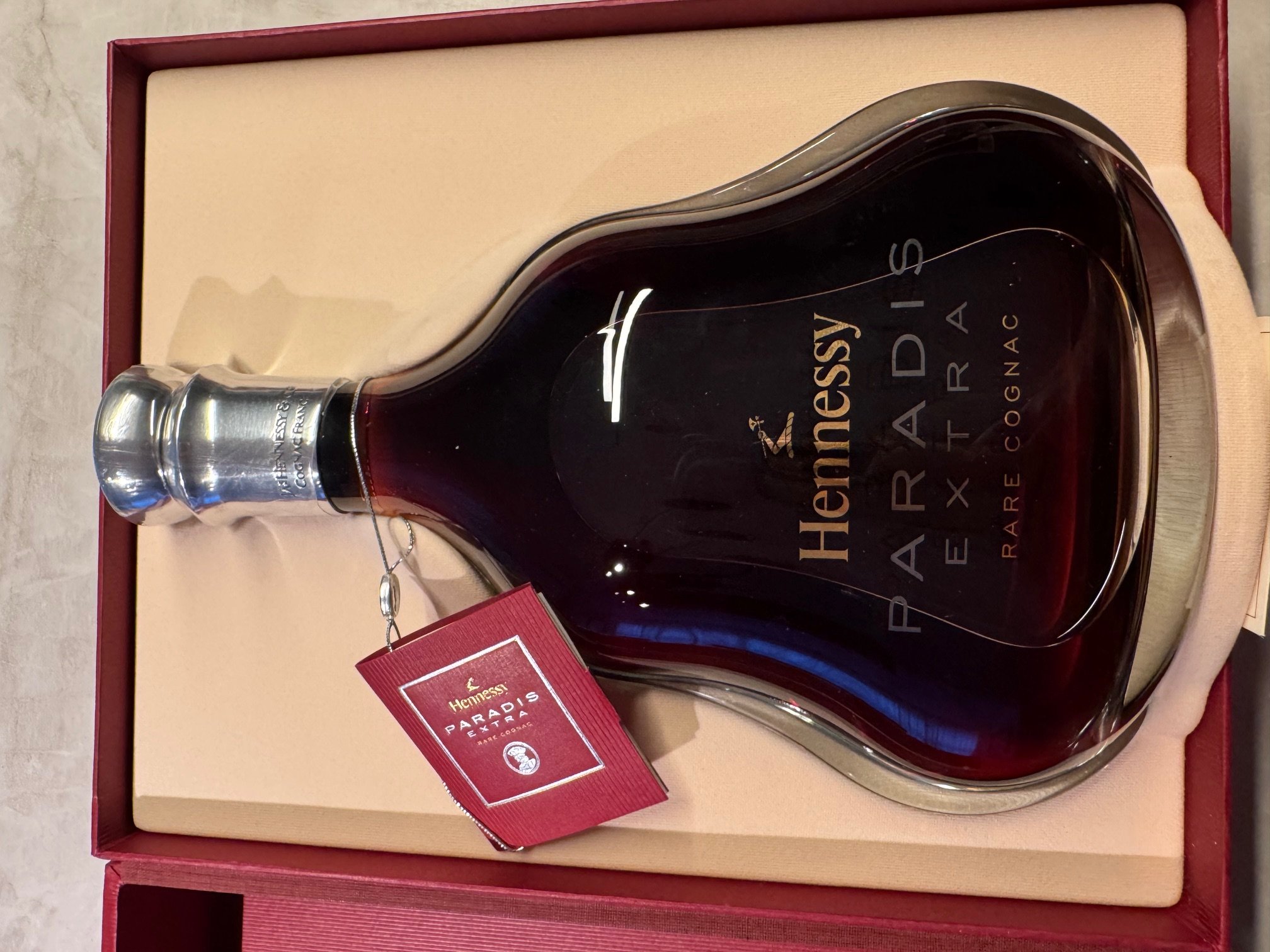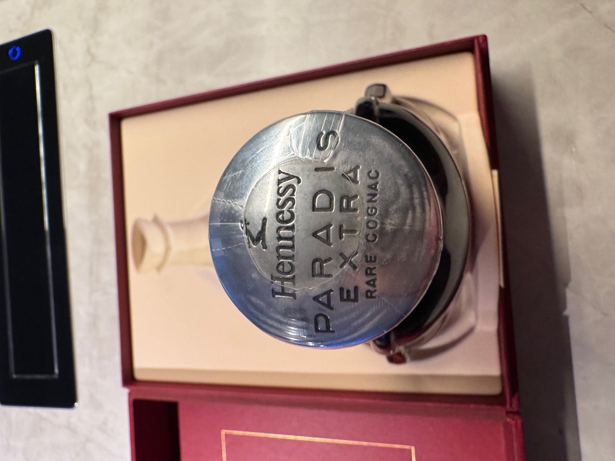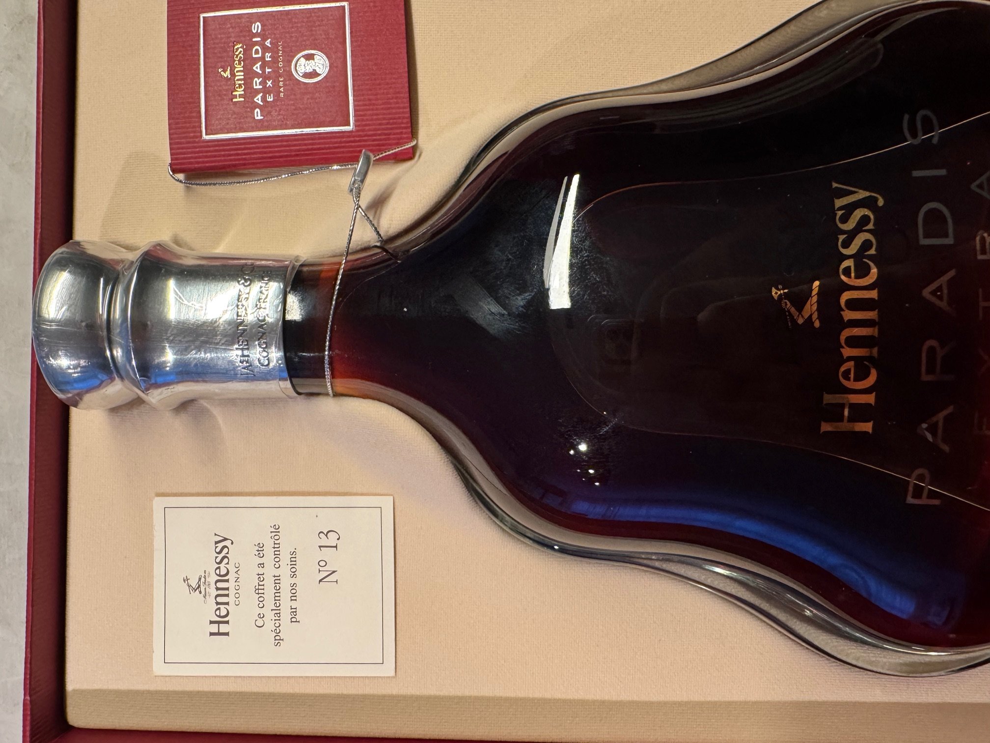 - Here is the analysis of the image: 1) Text on label: HENNESSY & CO COGNAC FRANCE Hennessy PARADIS EXTRA RARE COGNAC (On hanging tag) Hennessy PARADIS EXTRA RARE COGNAC 2) Visual elements (concise): - **Neck:** Silver-colored metallic capsule/closure covering the cork and top part of the neck. Text is embossed on the silver band at the base of the capsule. - **Main Label:** The text is directly printed on the glass decanter, which has a unique, elegant, flat-backed flask shape. - **Graphic:** A stylized "H" emblem appears above "Hennessy". Below "Hennessy", a "bras armé" (arm holding an axe) emblem is visible. - **Font Styles:** "Hennessy" is in a decorative serif script. "PARADIS EXTRA" is in a tall, elegant serif font. "RARE COGNAC" uses a simpler, all-caps sans-serif font. - **Hanging Tag:** A red rectangular tag with a silver border. - **Graphics:** A stylized "H" emblem above "Hennessy". A circular medallion with a profile of a person is at the bottom. - **Font Styles:** Mirrors the main label: "Hennessy" in decorative serif, "PARADIS EXTRA" in tall serif, "RARE COGNAC" in sans-serif. 3) Fill level estimate: Well above shoulder (very good) - The liquid level is full to the base of the metallic neck collar, with no visible air gap.