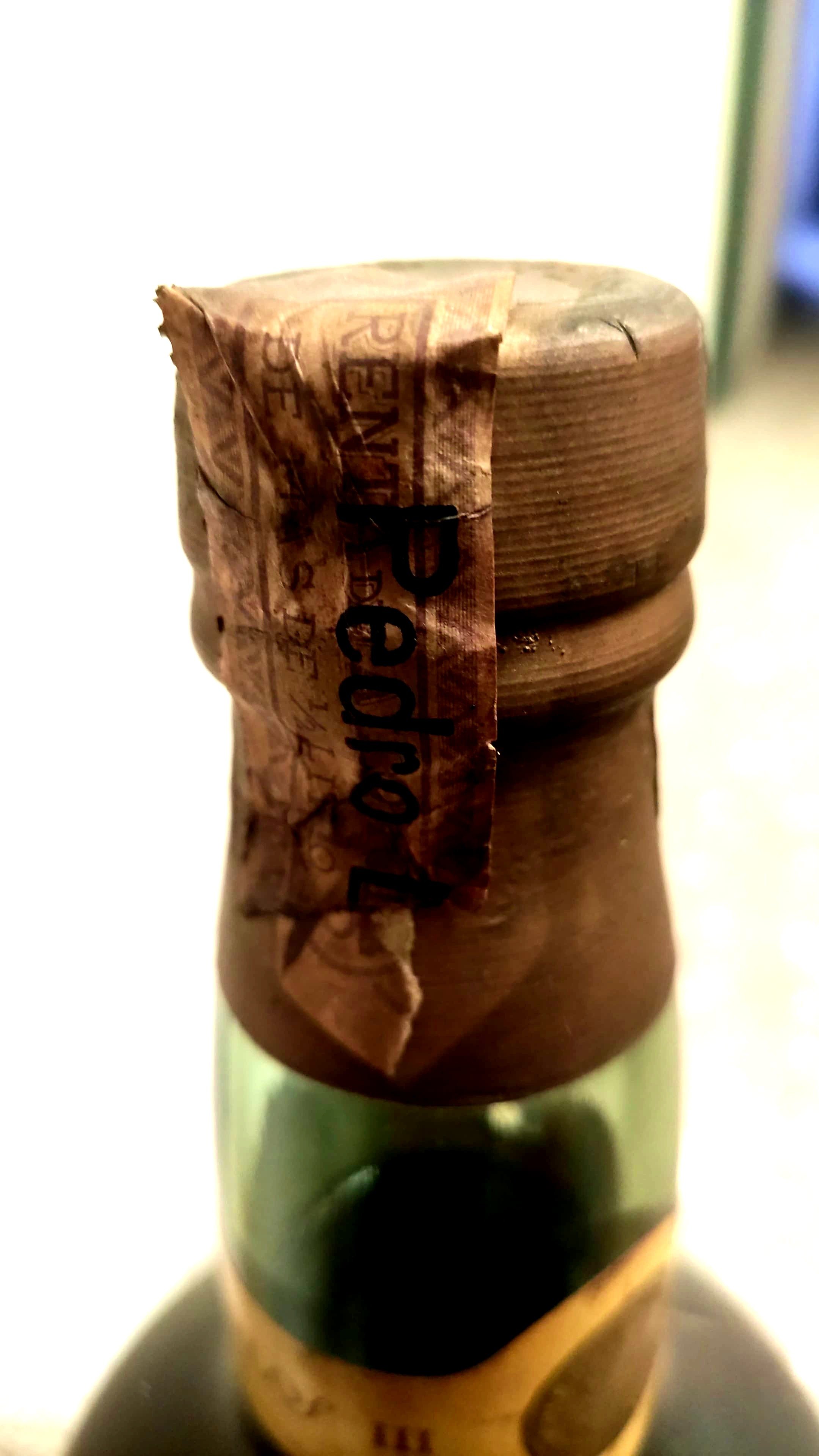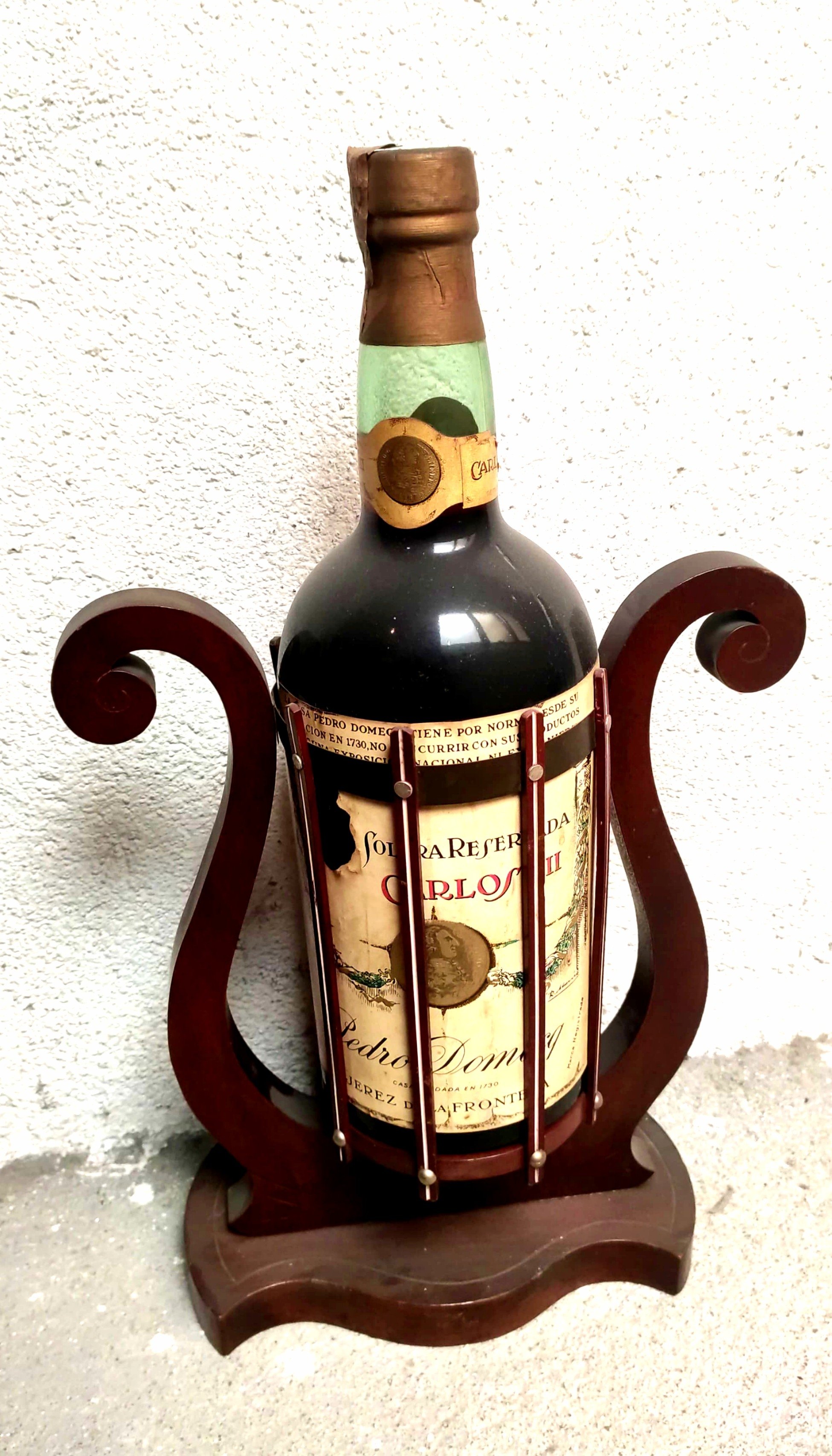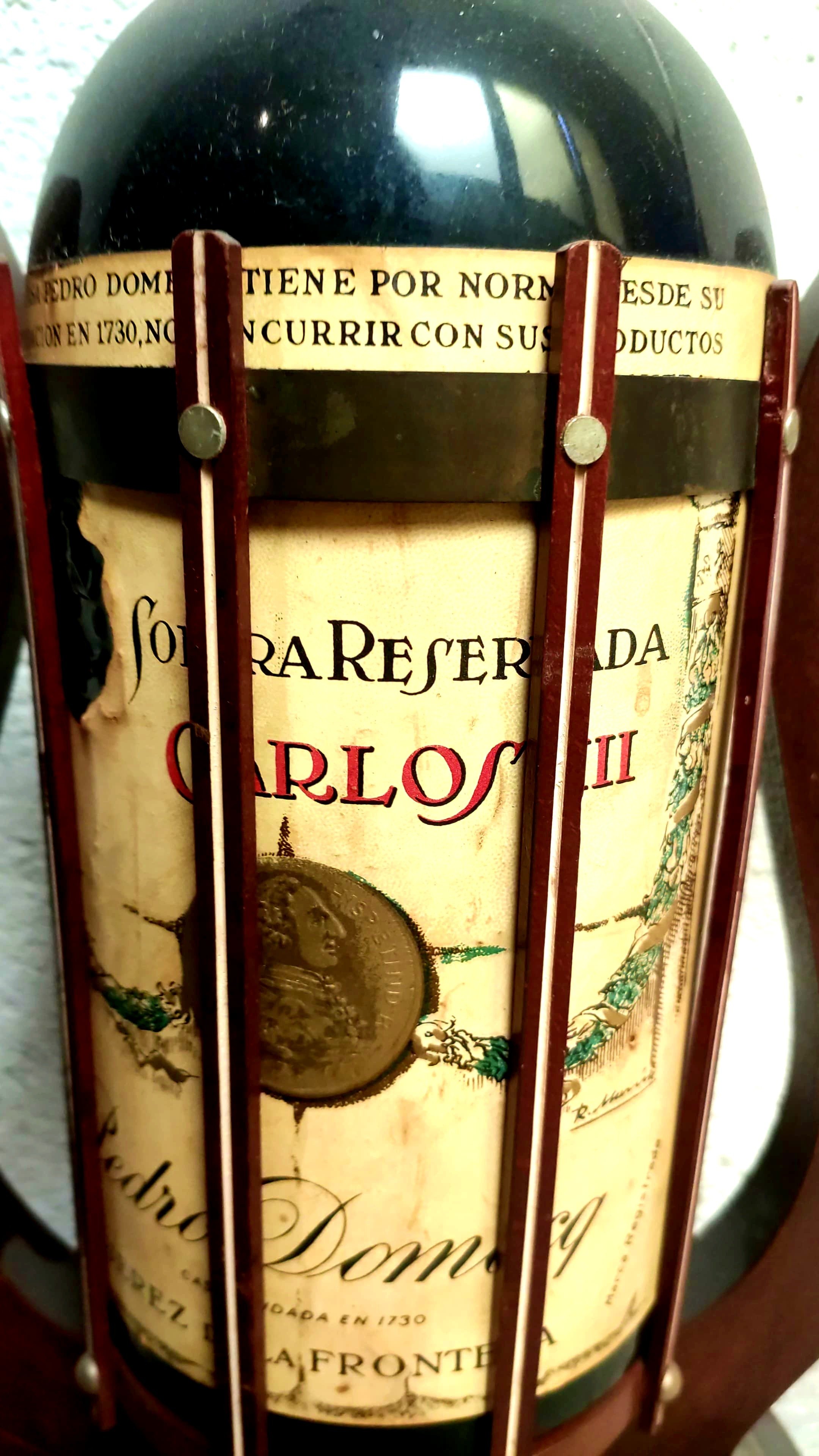 - Here is the analysis of the image: 1) Text on label: **Neck Label:** CARL **Main Label:** SA PEDRO DOMEC TIENE POR NOR CION EN 1730,NO CURRIR CON SUS ENA EXPOSICI NACIONAL NI EX SOLERA RESERVADA CARLOS III Pedro Domecq CASA FUNDADA EN 1730 JEREZ DE LA FRONTE Marca Registrada 2) Visual elements (concise): - **Neck:** Bronze-colored foil capsule, slightly cracked, covering the cork. A small, golden strip label with a central circular medallion featuring a profile bust and decorative elements wraps around the upper neck. Font: Serif for "CARL". - **Mid label:** The main label is off-white/cream, rectangular with rounded corners. It features an upper dark horizontal band with fine, light serif text. "SOLERA RESERVADA" is in a serif font. "CARLOS III" is prominent in a large red serif font. A central circular gold-colored medallion, placed below "CARLOS III", depicts a profile bust (likely Carlos III). "Pedro Domecq" is written in a distinct ornate cursive/script font. Smaller texts like "CASA FUNDADA EN 1730" and "JEREZ DE LA FRONTE" use serif fonts. "Marca Registrada" is in a small serif font at the bottom left. A subtle decorative border with hints of green and red is visible along the edges, partly obscured by the wooden holder. 3) Fill level estimate: Well above shoulder (very good). The dark glass makes it difficult to see clearly, but the liquid appears to fill the bottle well into the neck, with no visible air gap.