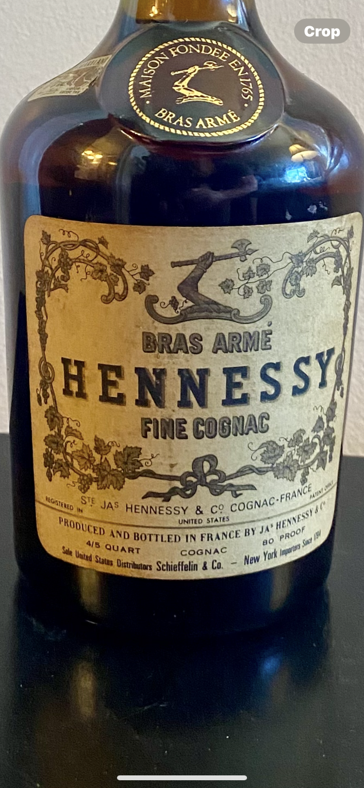 - Bras Arme Fine Cognac Hennessy Ste Jas Hennessy & Co Cognac-France Registered in United States Patent Office Produced and bottled in France by JA s Hennessy & Co 4/5 quart cognac 80 proof Sale United States Distributors Schieffelin & Co- New York Importers since 1794