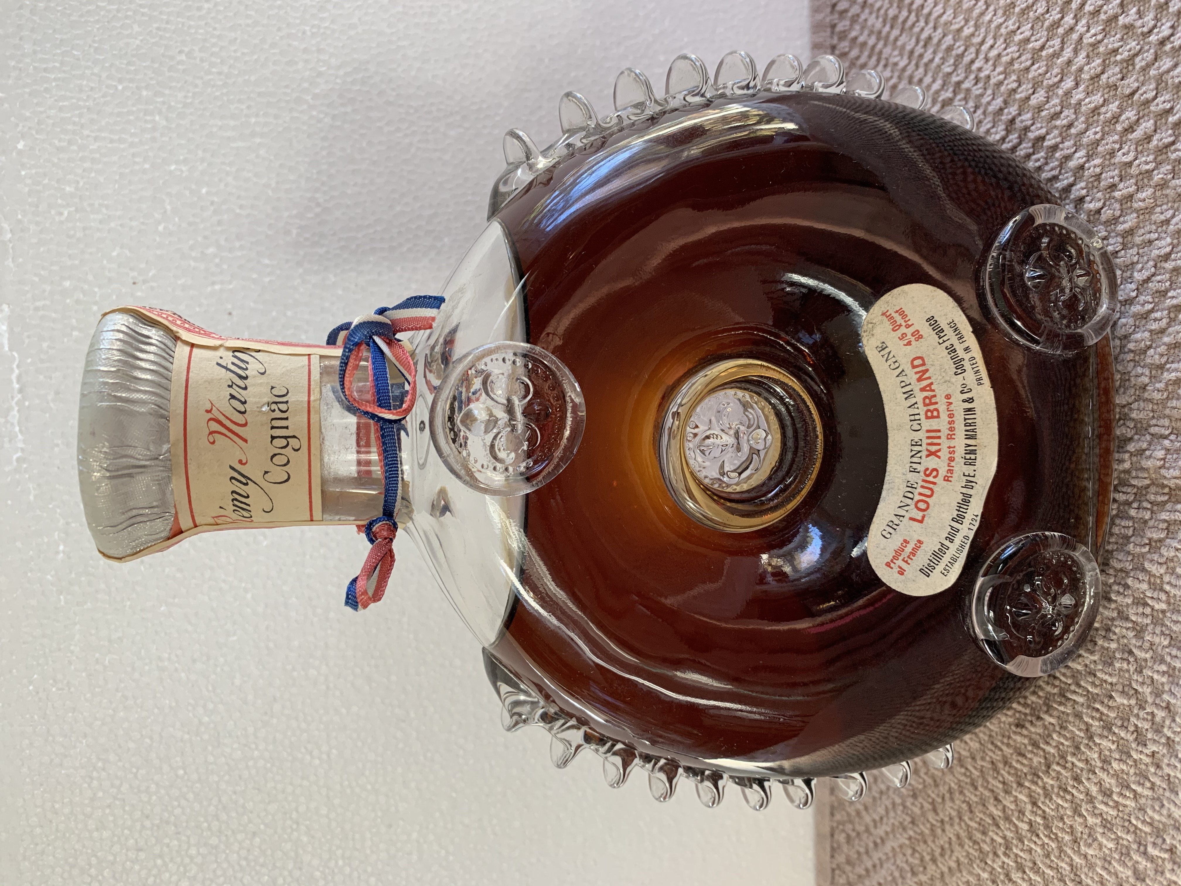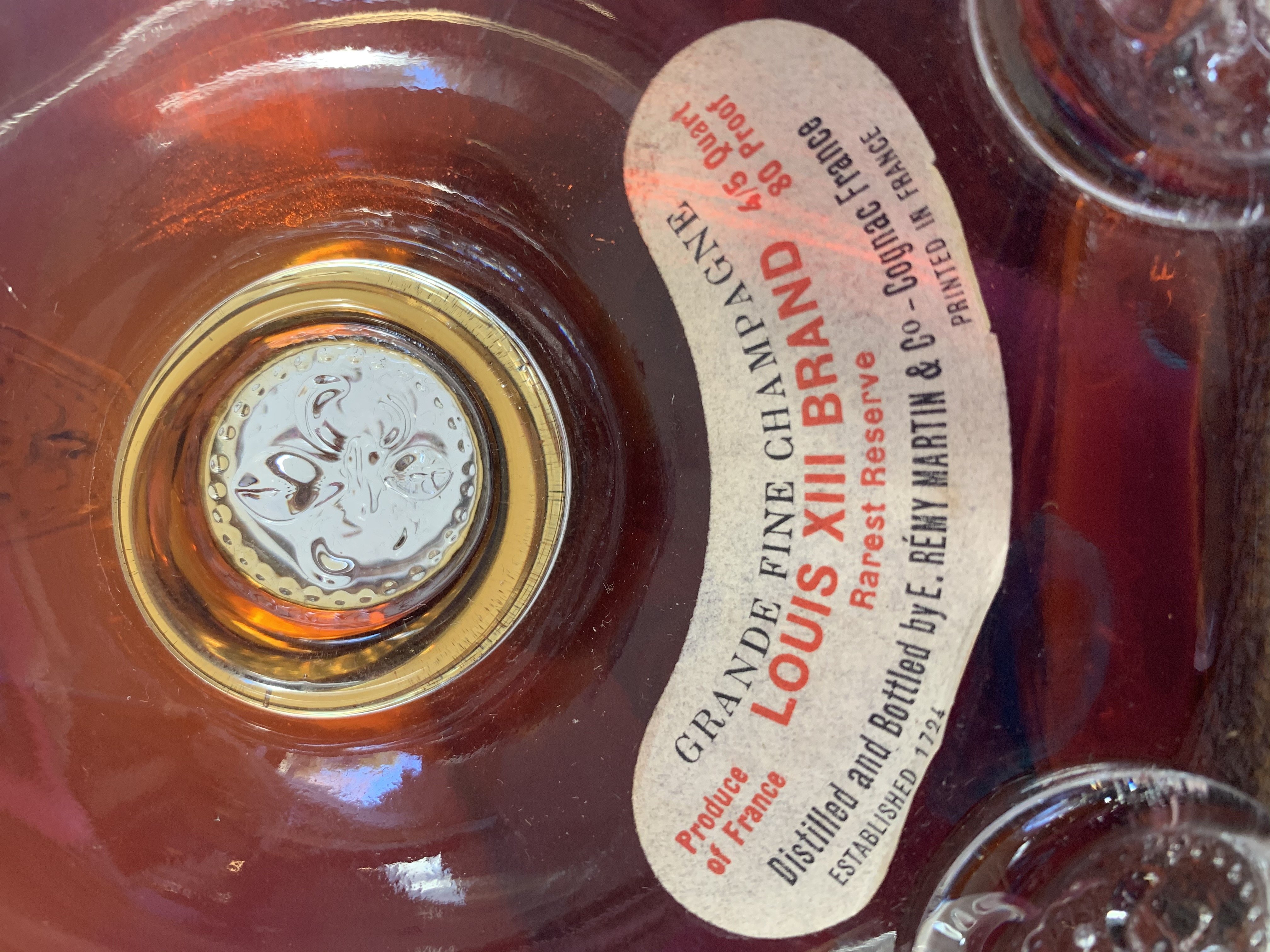 - Grande Fine Champagne Produce of France LOUIS XIII BRAND 4/5 quart 80 proof Rarest Reserve Distilled and Bottled by E. REMY MARTIN & Co - Cognac France - Established 1724 Printed in France