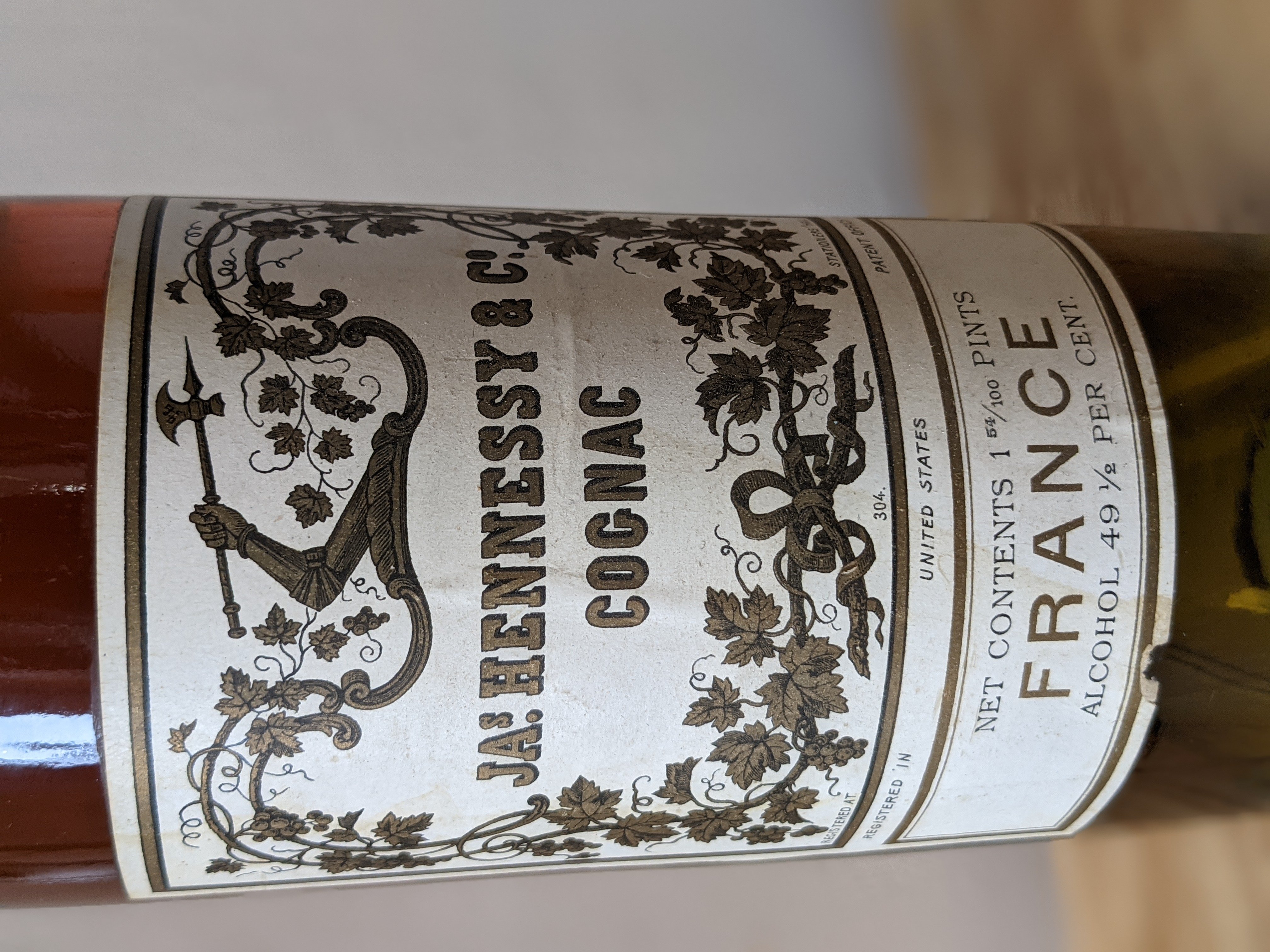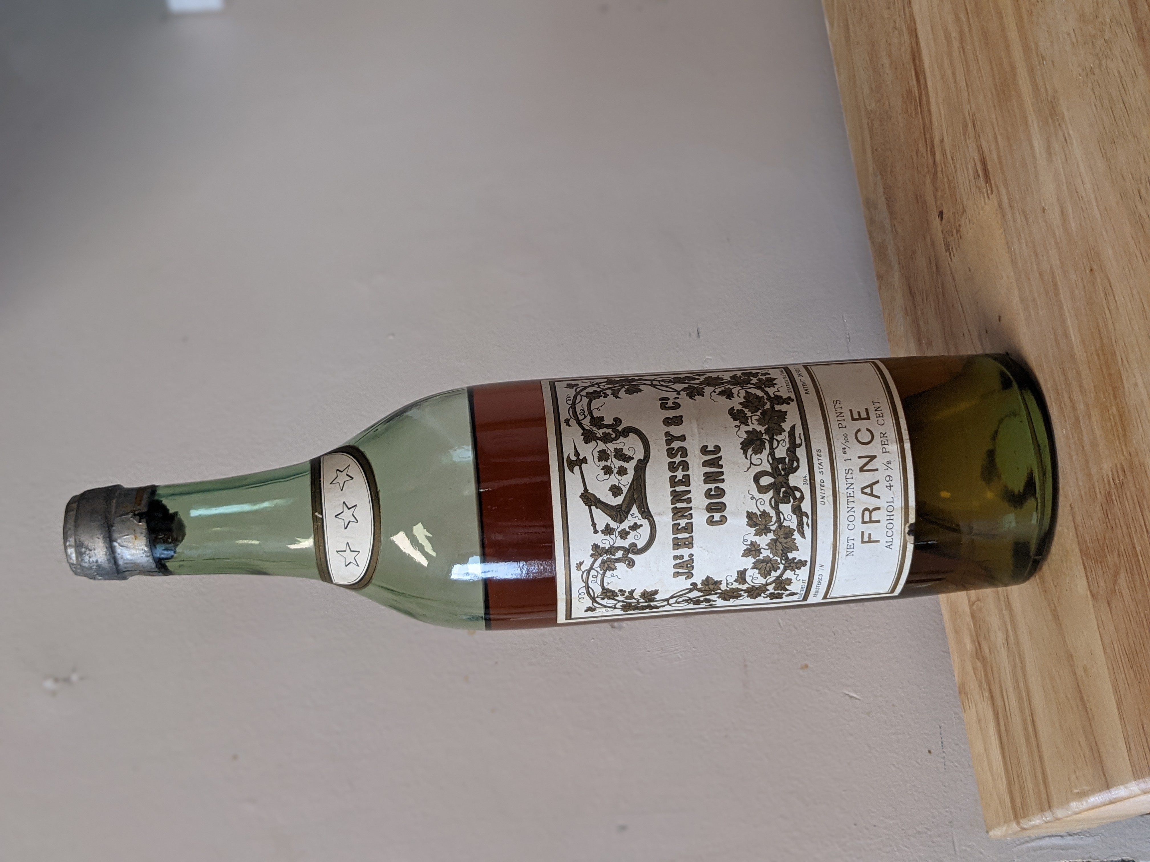 - There are three stars on the neck of the bottle then: JAS Hennessy & Co Cognac Registered at 304 Stationers Hall Registered in United States Patent Office Net Contents 1 54/100 Pints FRANCE Alcohol 49 1/2 PER CENT