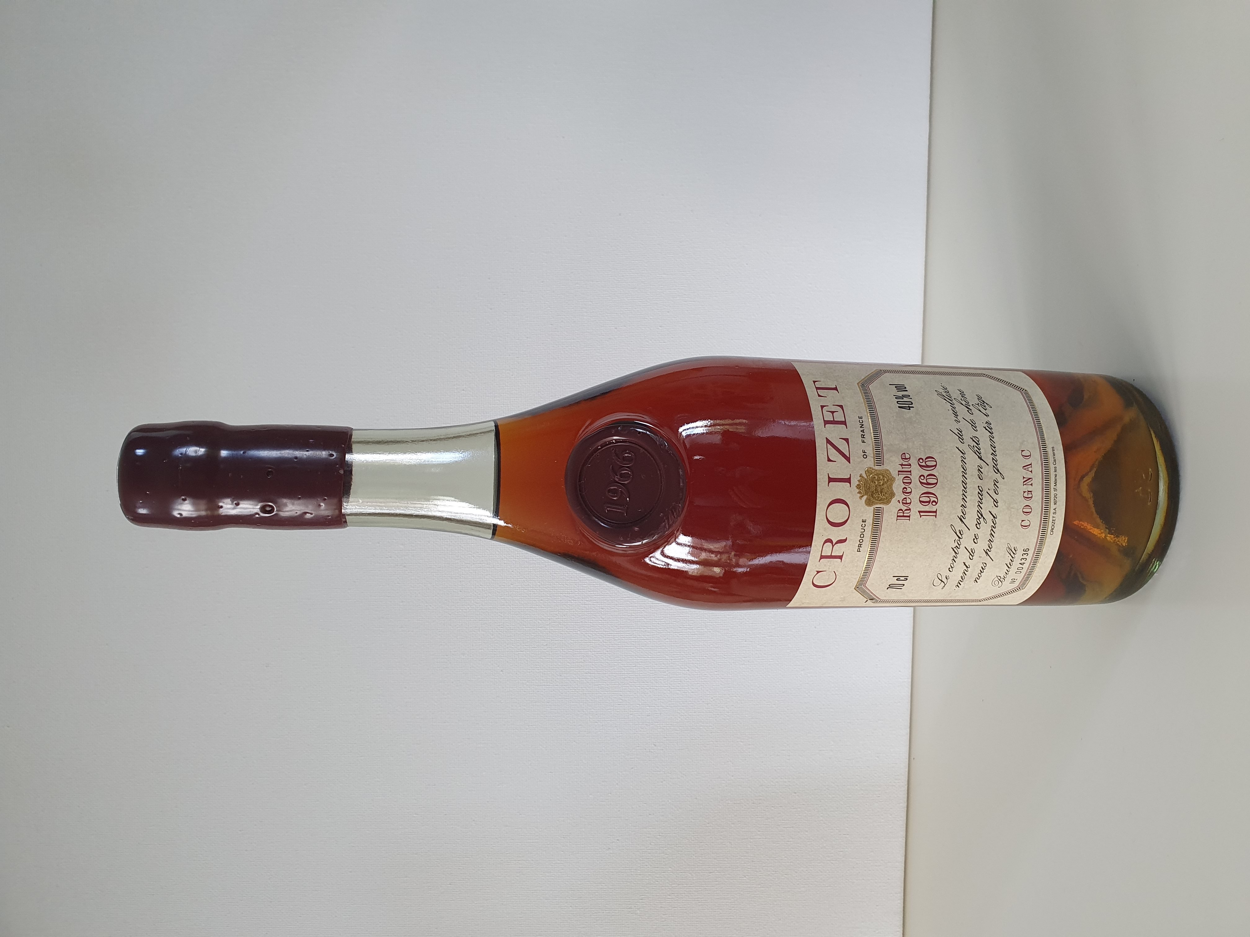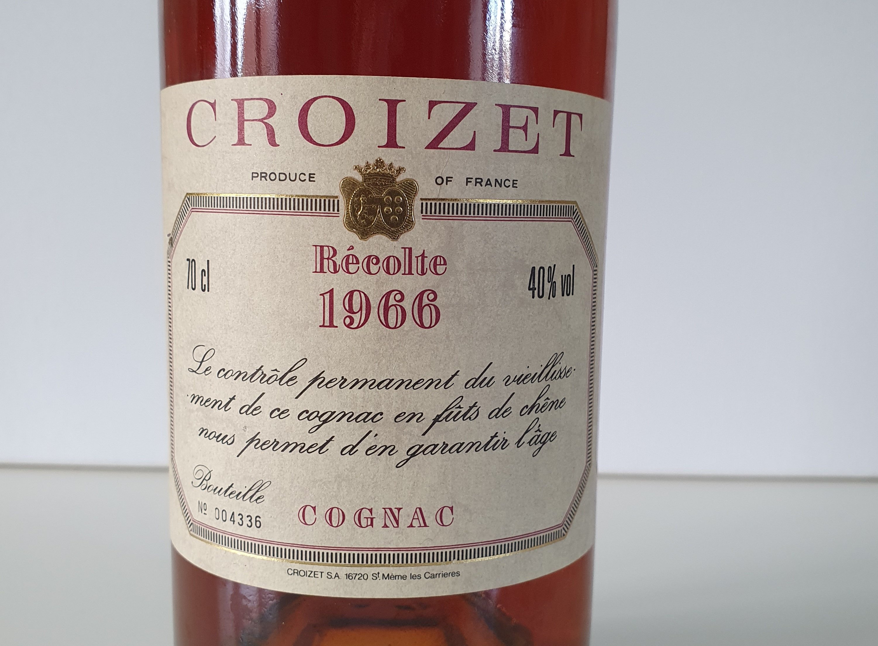 - Croizet Recolte 1966 70cl 40% vol Le controle permanent du vieillissement de ce cognac en futs de chene noes permet d'en garantir l'age Bouteille no 004336 cognac croizet SA 16720 St Meme les Carrieres