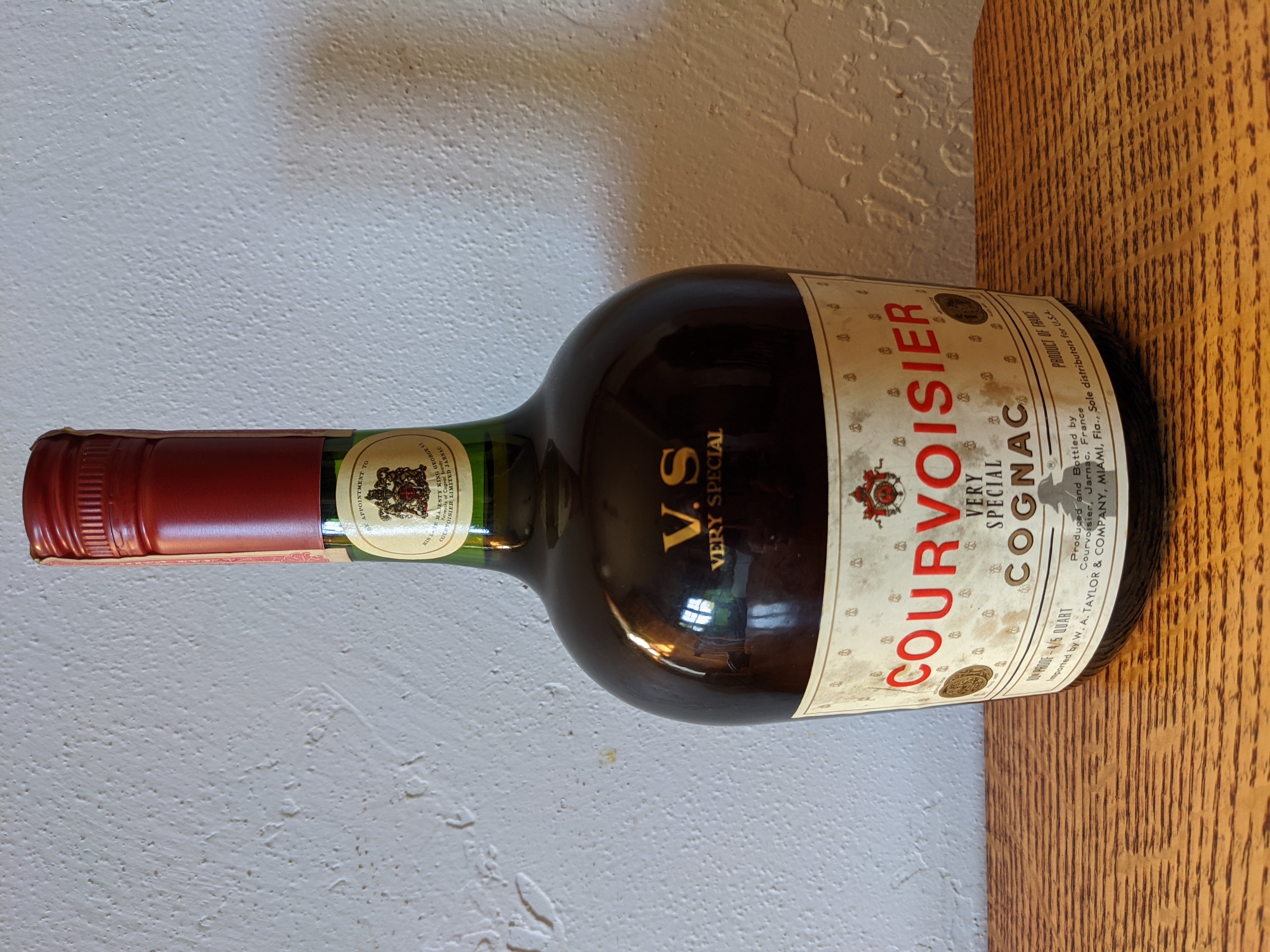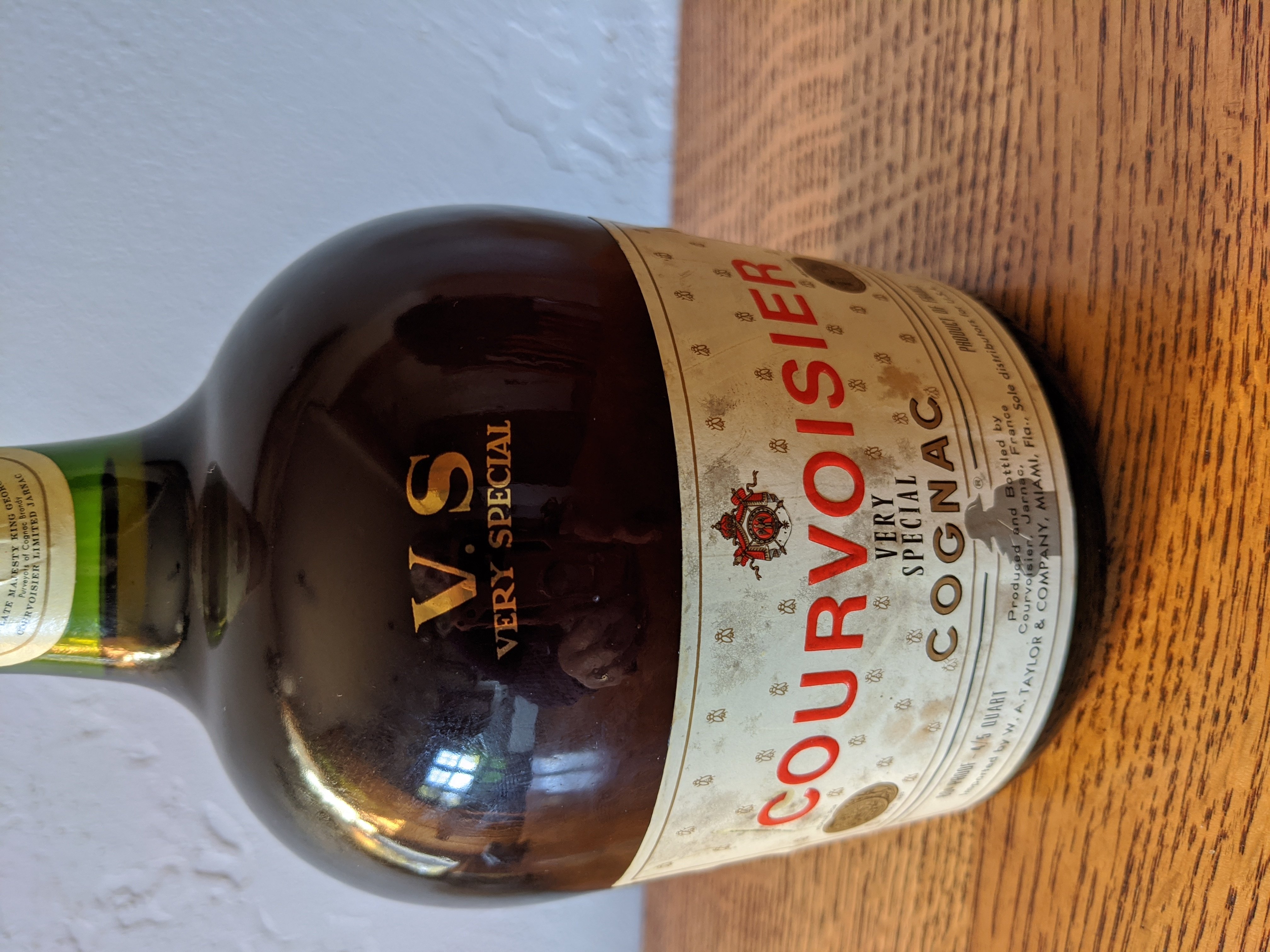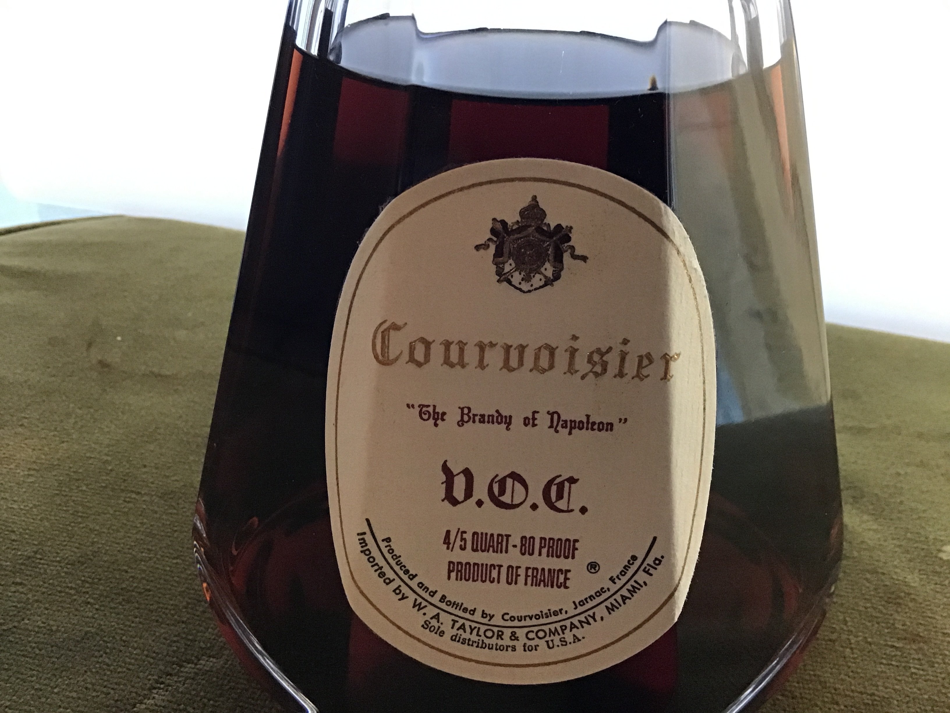- Top Circle Label: By appointment to his late majesty king george VI Purveyors of Cognac Brandy Courvoisier Limited Jarnac Main Front Label Courvoisier Very Special Cognac Left Medallion: Medaille d'or paris 1889 Right Medallion: Medialle d'or Alger1889 Bottom third of main label 80 Proof - 4/5 QUART Produced and Bottled by PRODUCT OF FRANCE Courvoisier, Jarnac, France Imported by W. A. TAYLOR & COMPANY, MIAMI, Fla., Sole distributors for U. S. A. No label on the back, no bar code. Bottle has this molded into the back: LIQUOR BOTTLE COURVOISIER COGNAC FRANCE