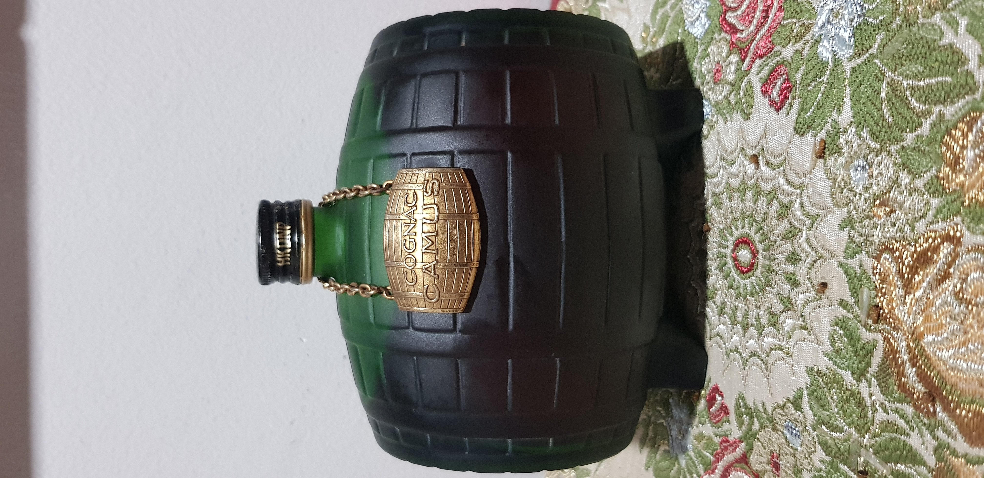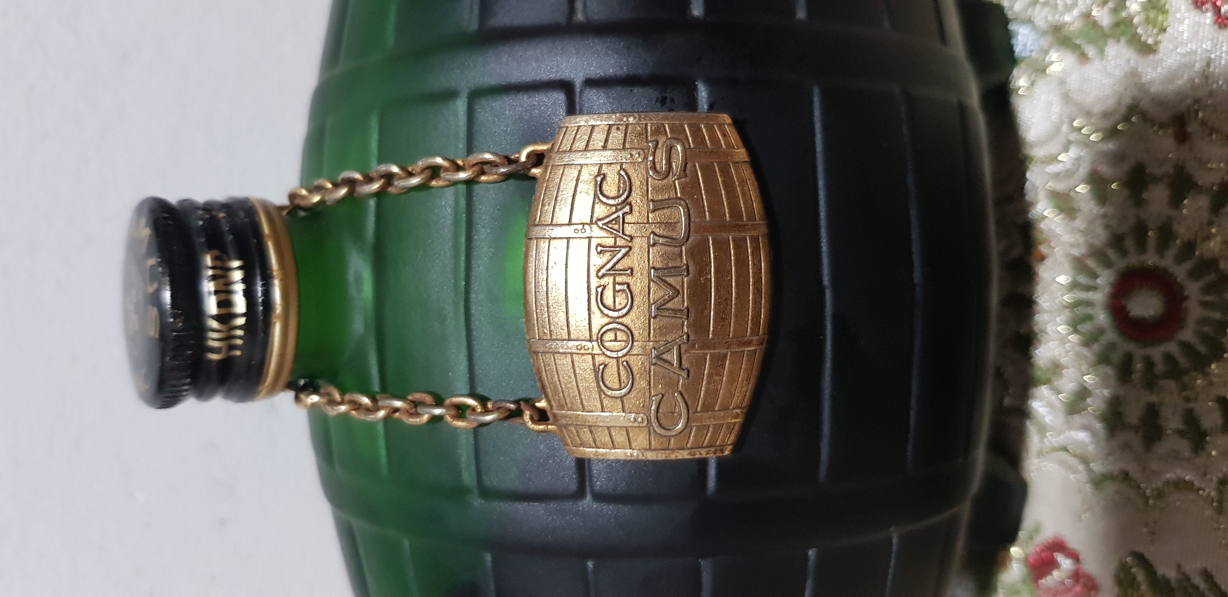 - w/golden chain hanged around cap bearing barrel pendant w "Cognac Camus" print Cap/crown top: Camus Cognac, w/ cross logo & 1863 print Cap side print: HKDNP Right Side: 'Cognac Camus Vieille Reserve' Left Side: Image of multiple barrels, some w/ visible 'Camus' print
