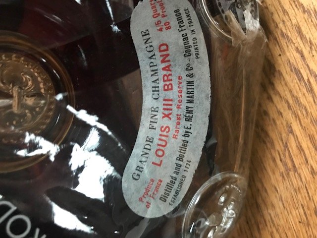 - Grande Fine Champagne - Louis XIII brand- Cognac France - Distilled and Bottled by E. Remy Martin & Co - Established 1724 - 80 proof - 4/5 quart - Rarest Reserve