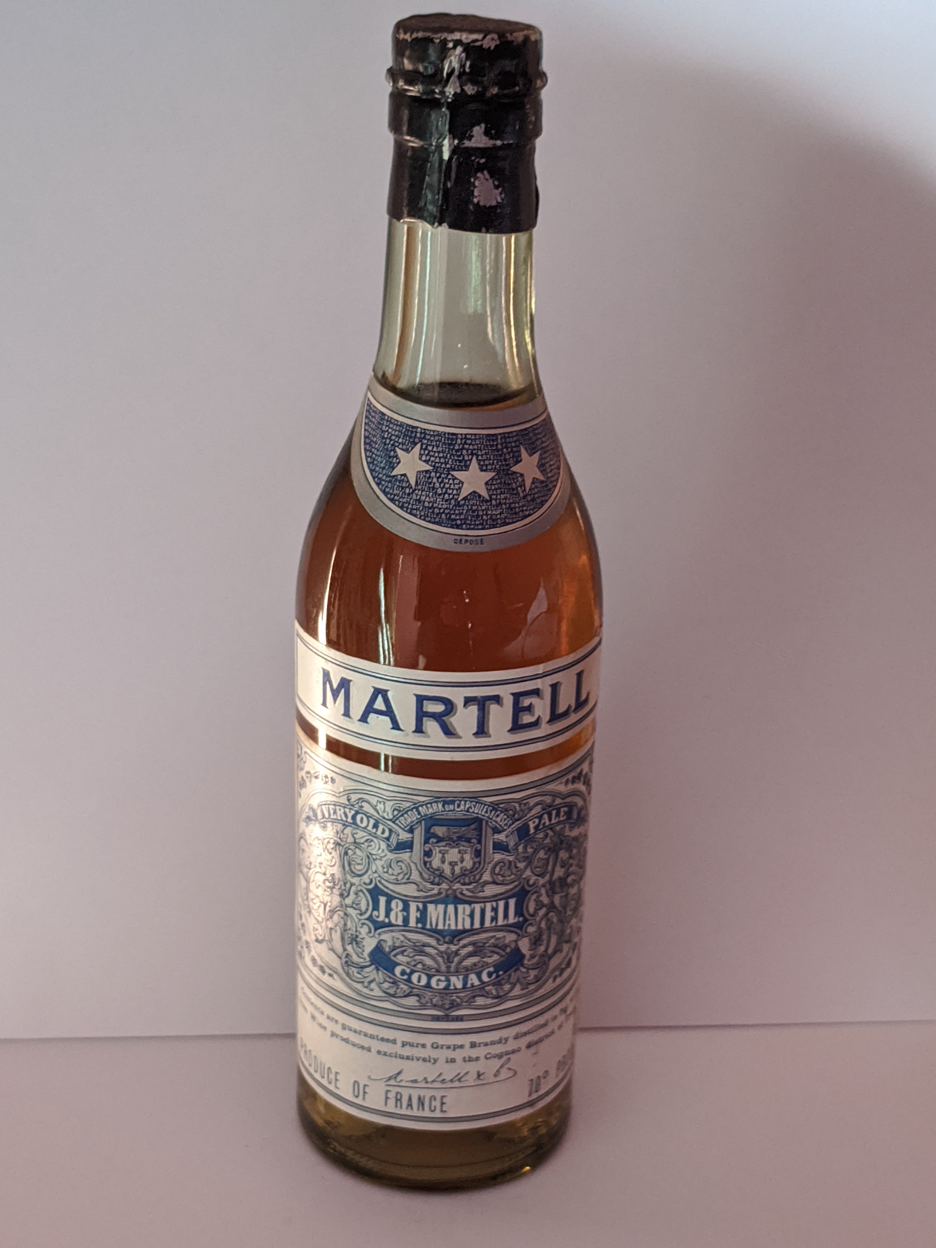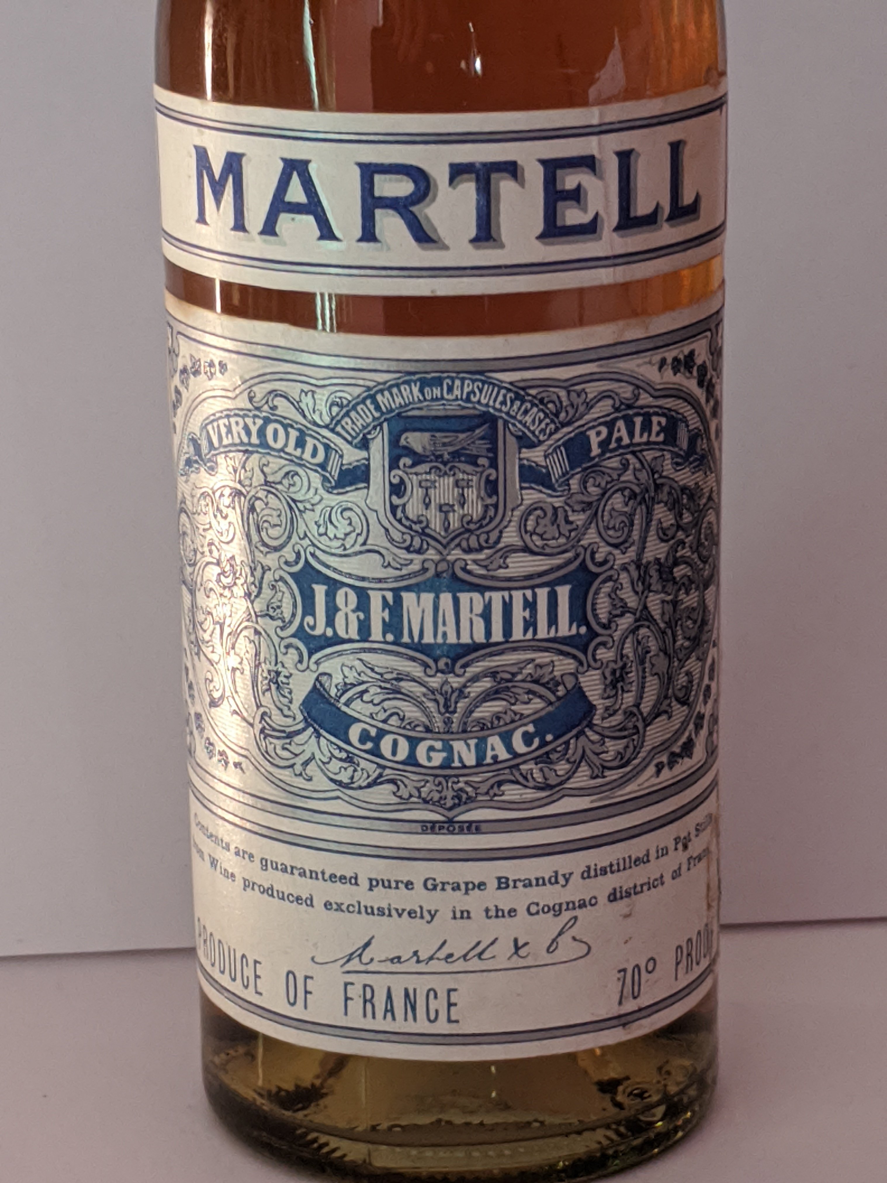 - Trade mark on capsules and cases. Very old Pale. J and F Martell. Cognac. Deposee. Contents are guaranteed pure grape brandy distilled in Pot Stills from wine produced in exclusively in the Cognac district of France. Produce of France. 70° proof.