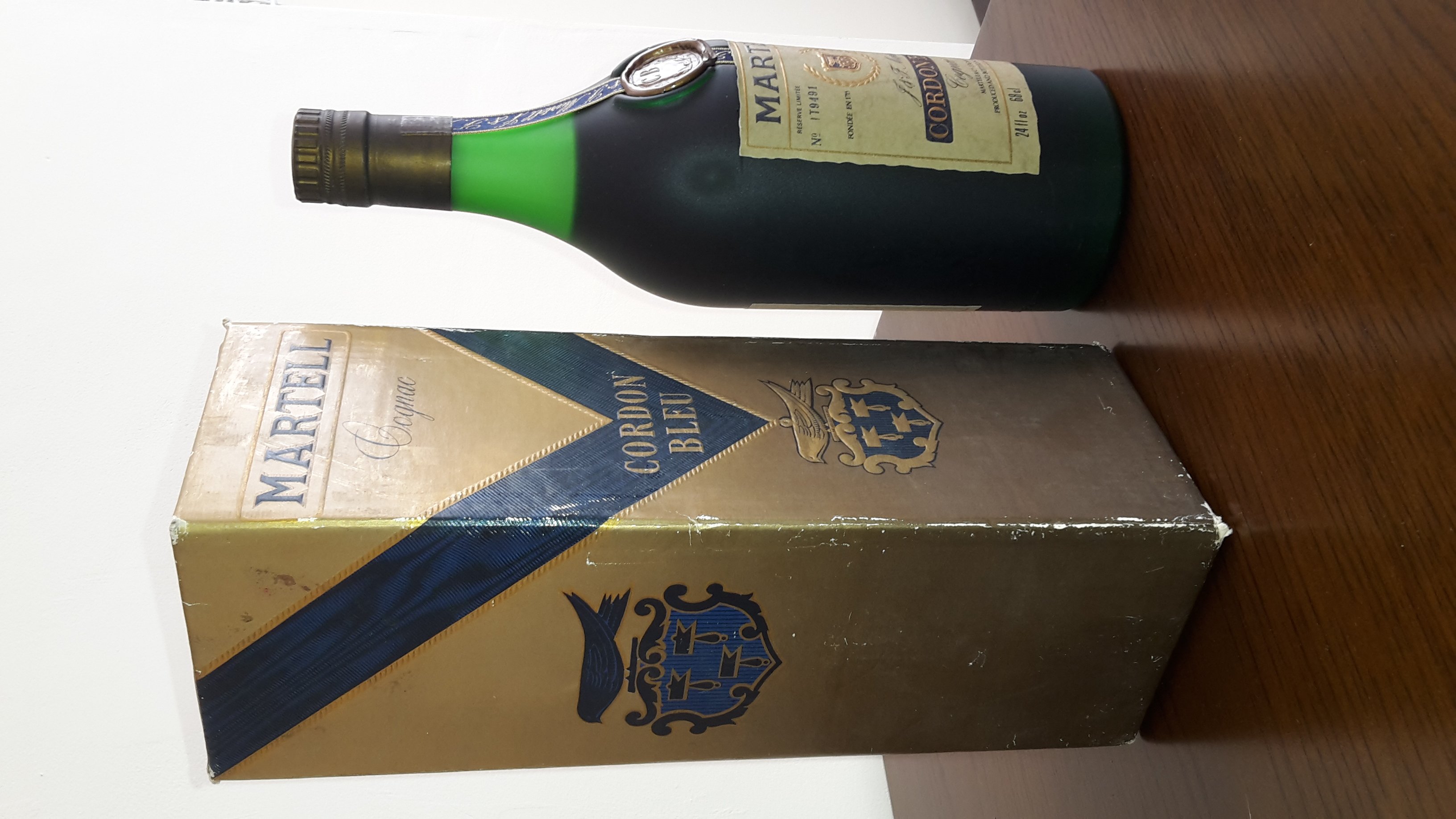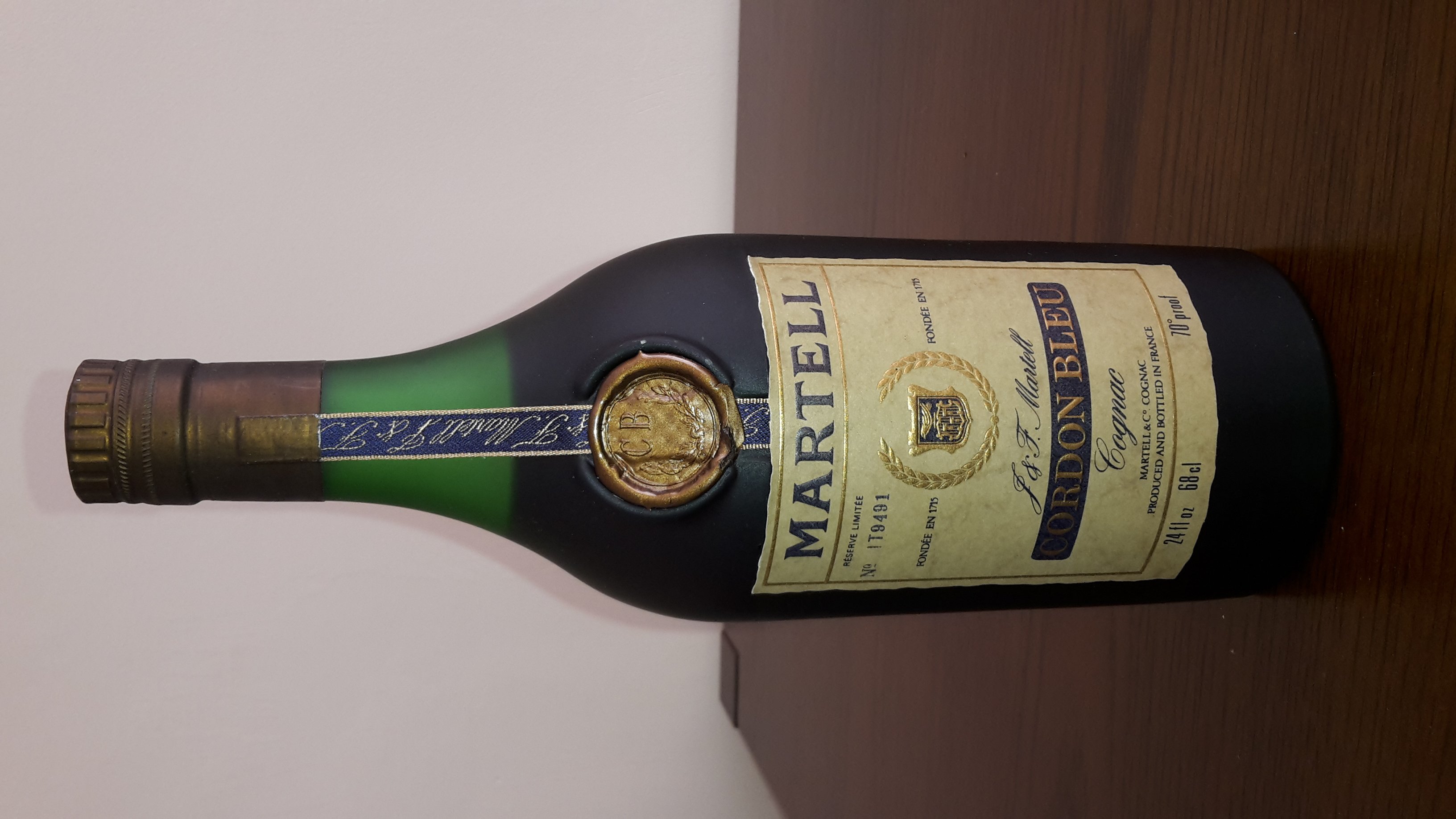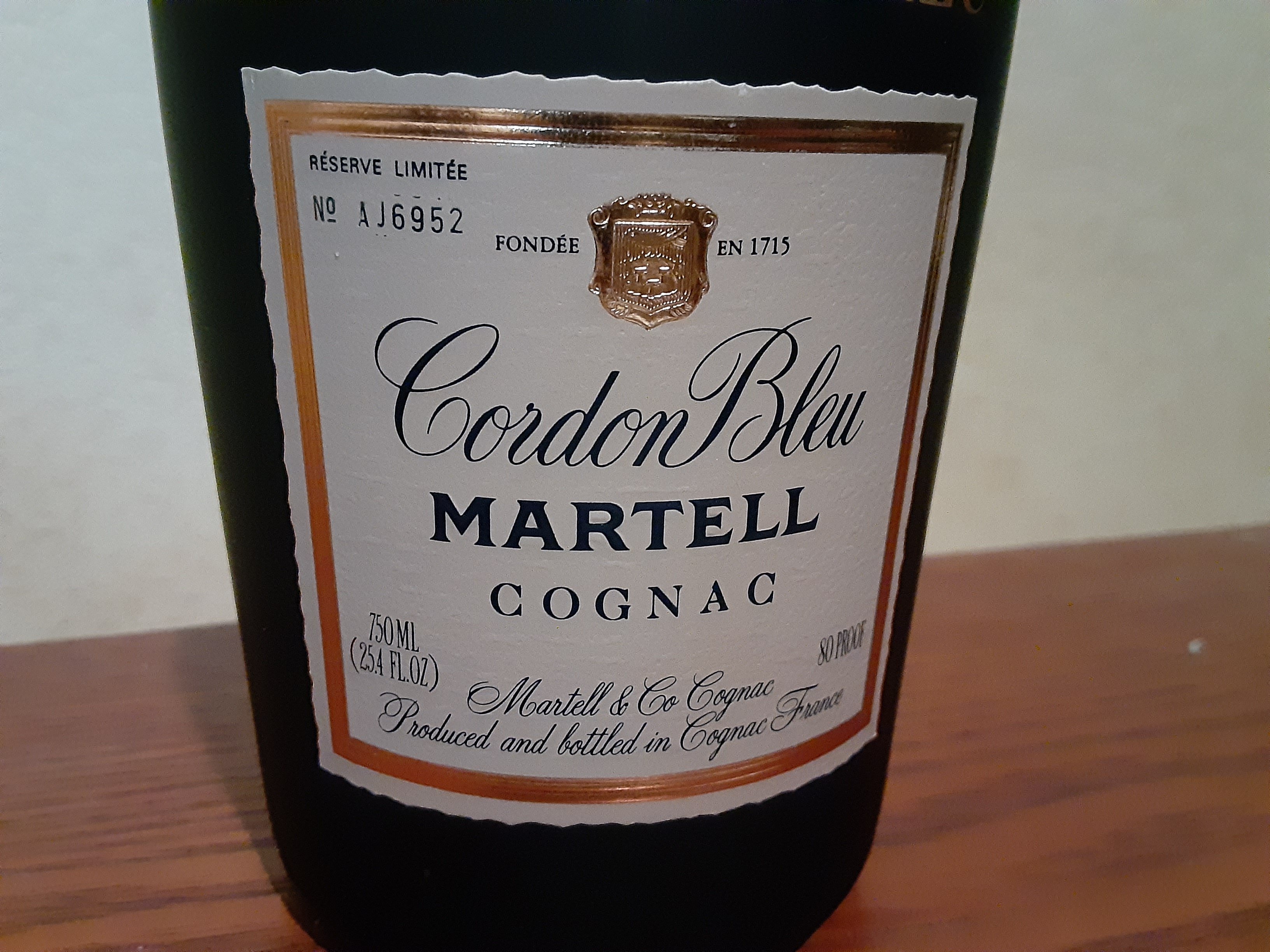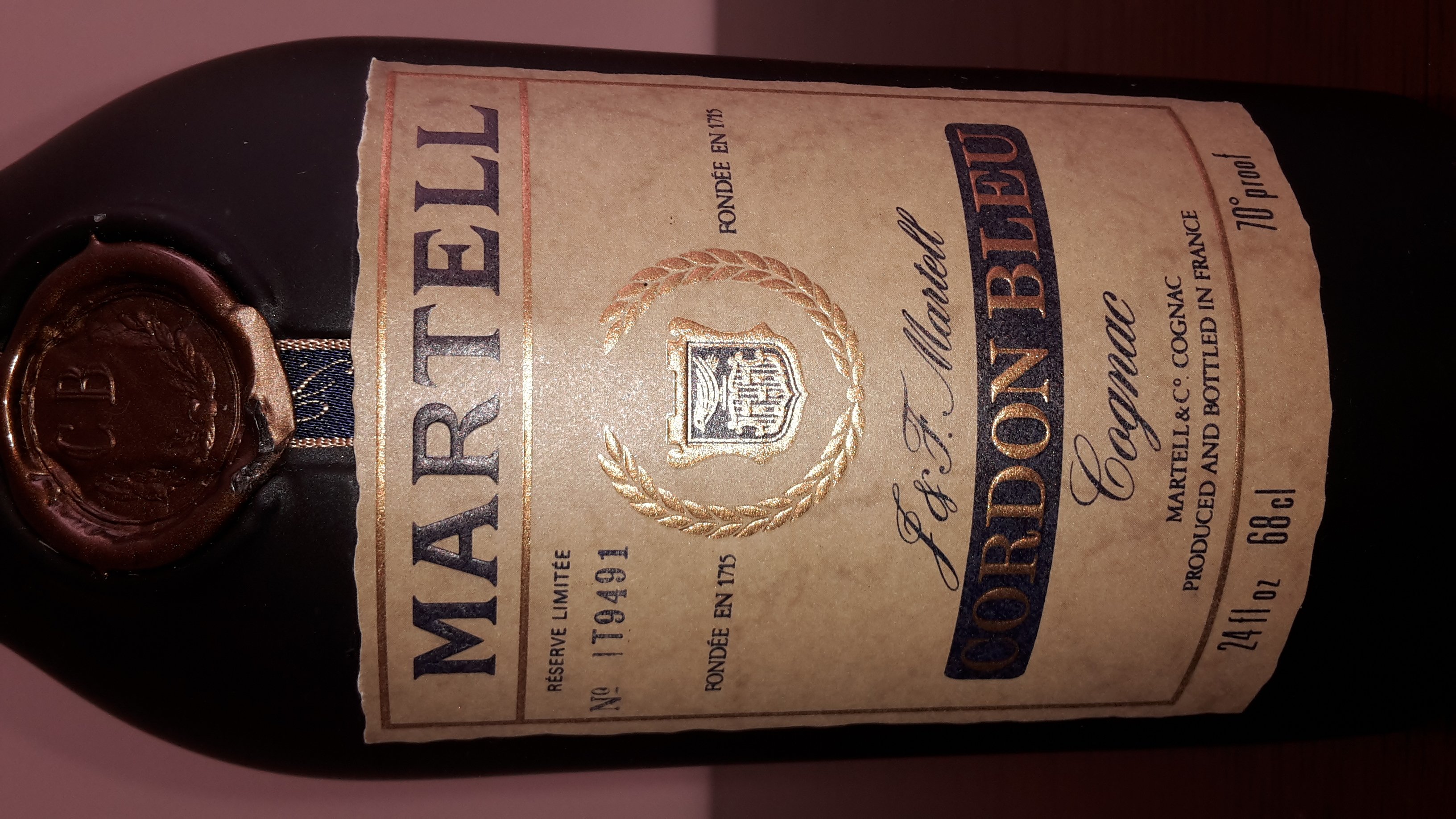 - Martell cordon bleu cognac Martell&Co . Cognac Produced and bottled I'm France Fondee en 1715 F & F.martell Reserve limited no. T9491 24 flight Oz 68cl 70° proof
