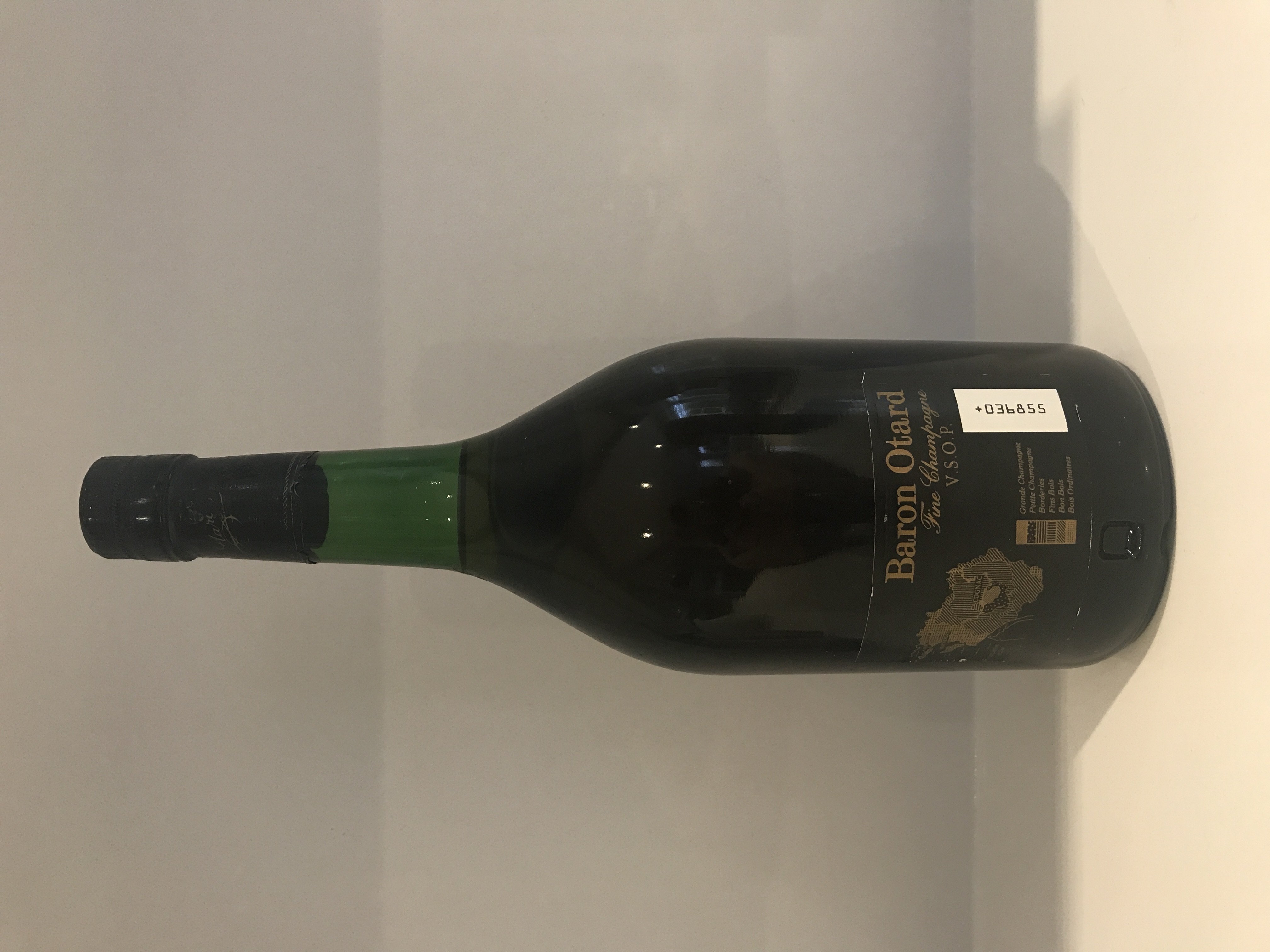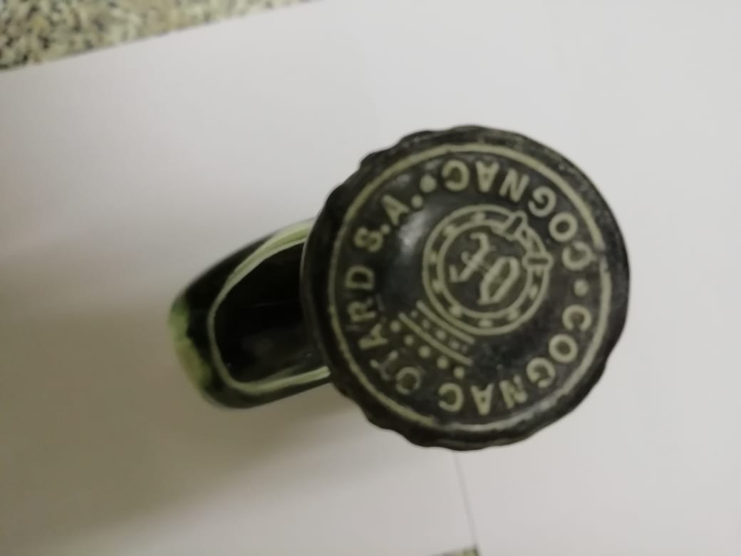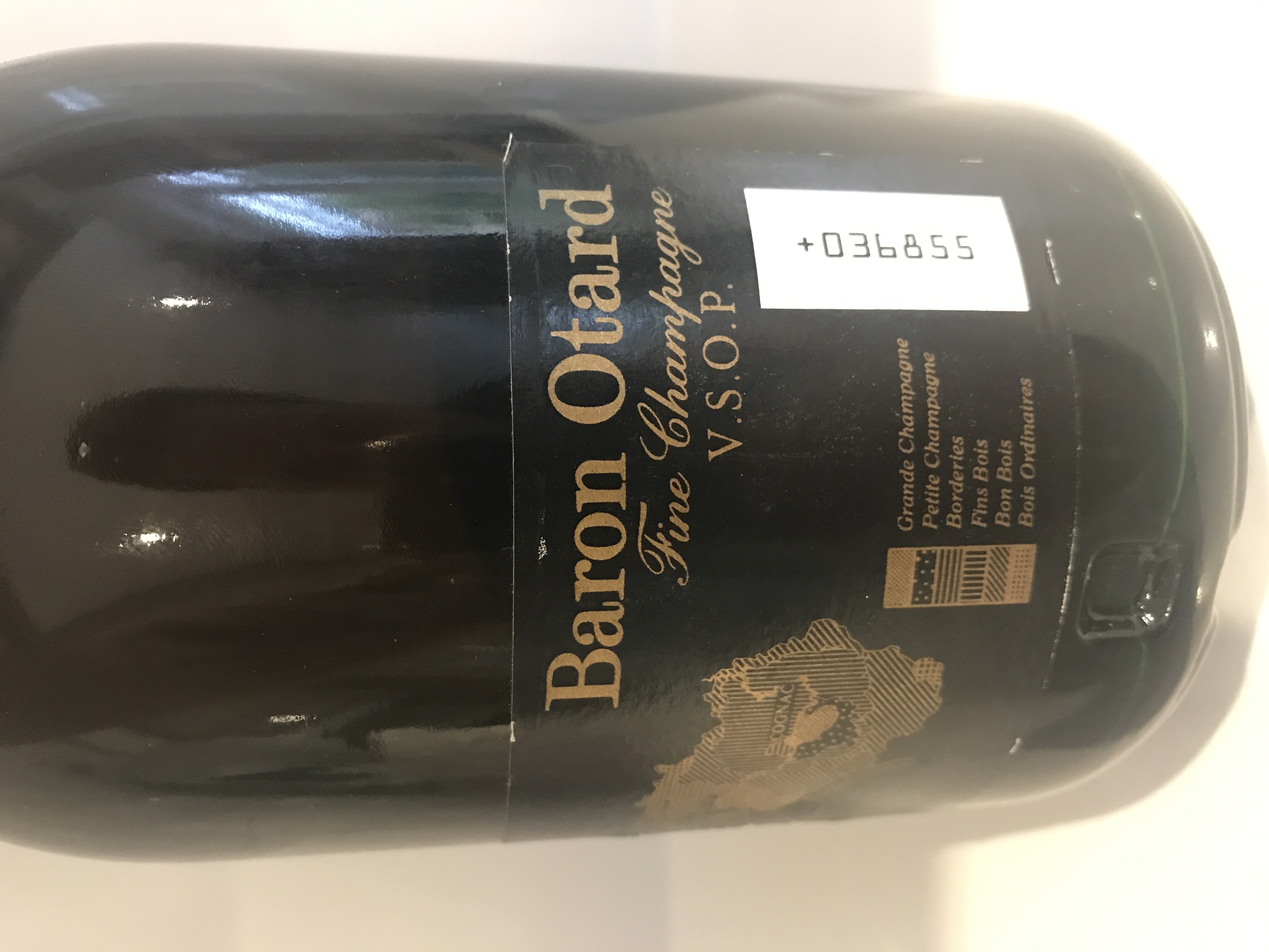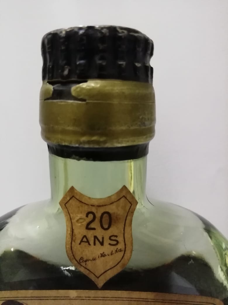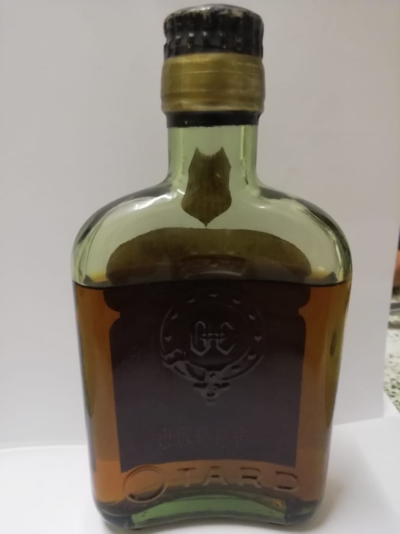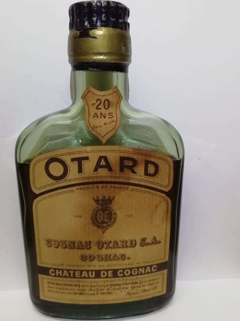 - On the neck label stands 20 ANS The big label is actually a split label OTARD printed on the top part and on the bigger label is a badge that looks like a crown and the letters OC in a circle. Left and right from this badge is the date 1795 and above the bage is written Produce of France.Under this badge is the wording. COGNAC OTARD S.A. COGNAC. Under that large font is a small font writing GARANTI MIS EN BOUTEILLES AU. Under that in large font again is written CHATEAU DE COGNAC Under that is the last piece of the label with 3 full lines writing in French. Some wording is difficult to see because there is small code like holes in the paper. The code spells G2654. I took a photo of this code. It is punched upside down on the label, i took a photo from the back of the btl aswell, although it is now upside down and back to front. I will include a close up photo of this wording. On the back of the bottle the crown badge with the words OC is embossed in the glass aswell as the word OTARD. The O is n big and actually looks more like a number zero in stead of a capital letter O.