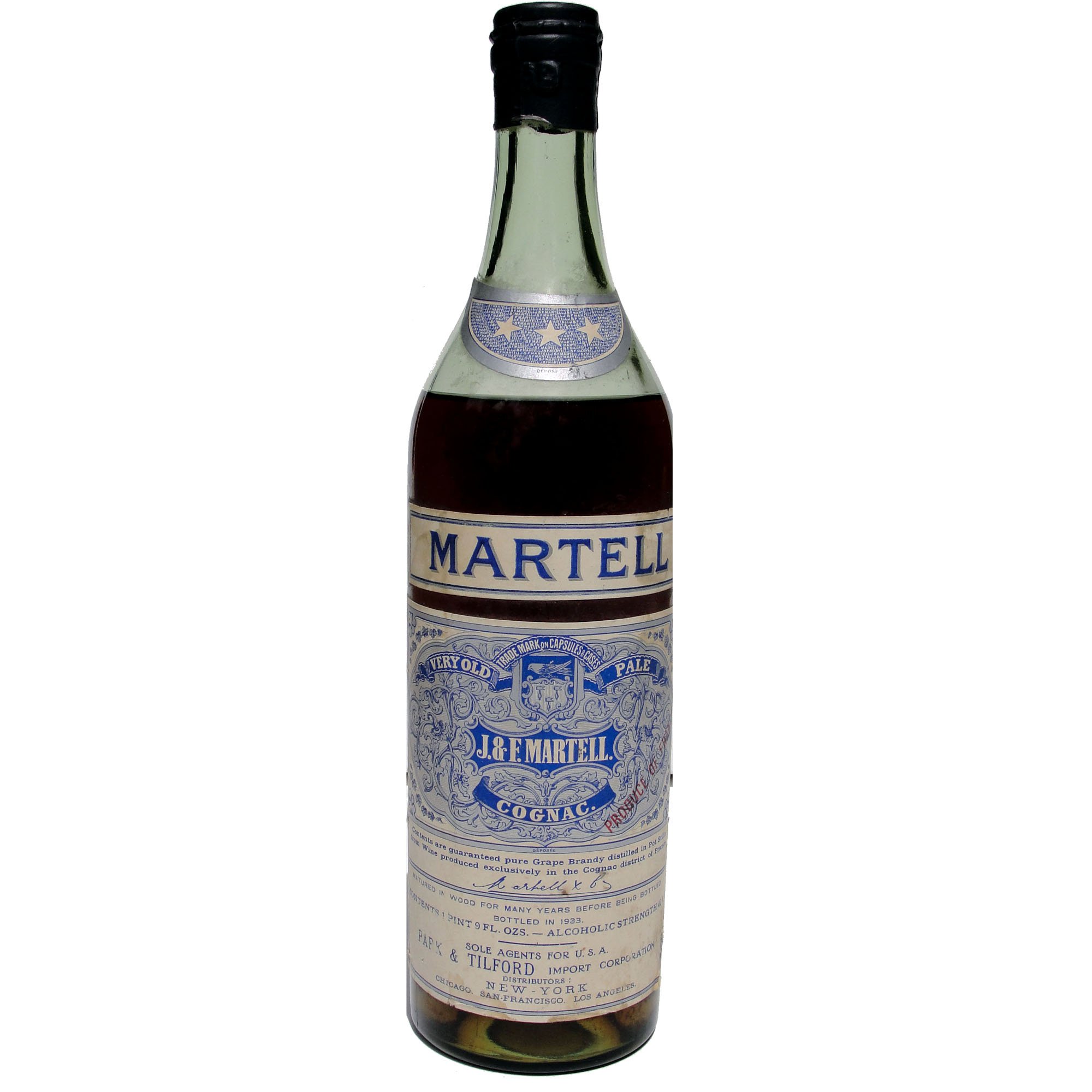- very old, Trademark on capsules and cases, pale J & F martell cognac Contents are guaranteed pure Grape Brandy distilled in Pot Stills from Wine produced exclusively in the Cognac district of France Matured in wood for many years before being bottled in 1933 signed, 1 Pint 9 fl ozs 42% Sole agents for USA Park & Tilford import New York