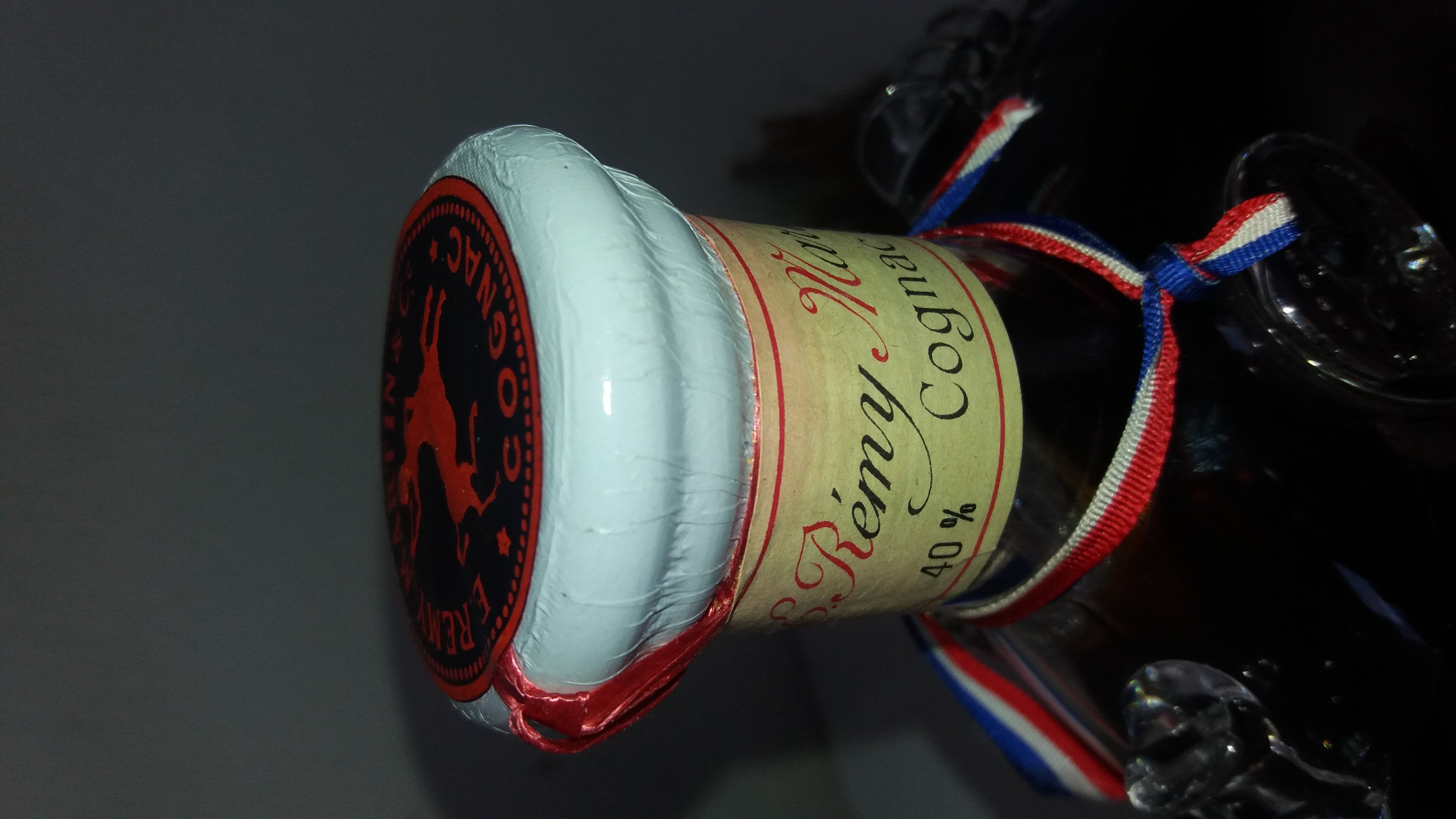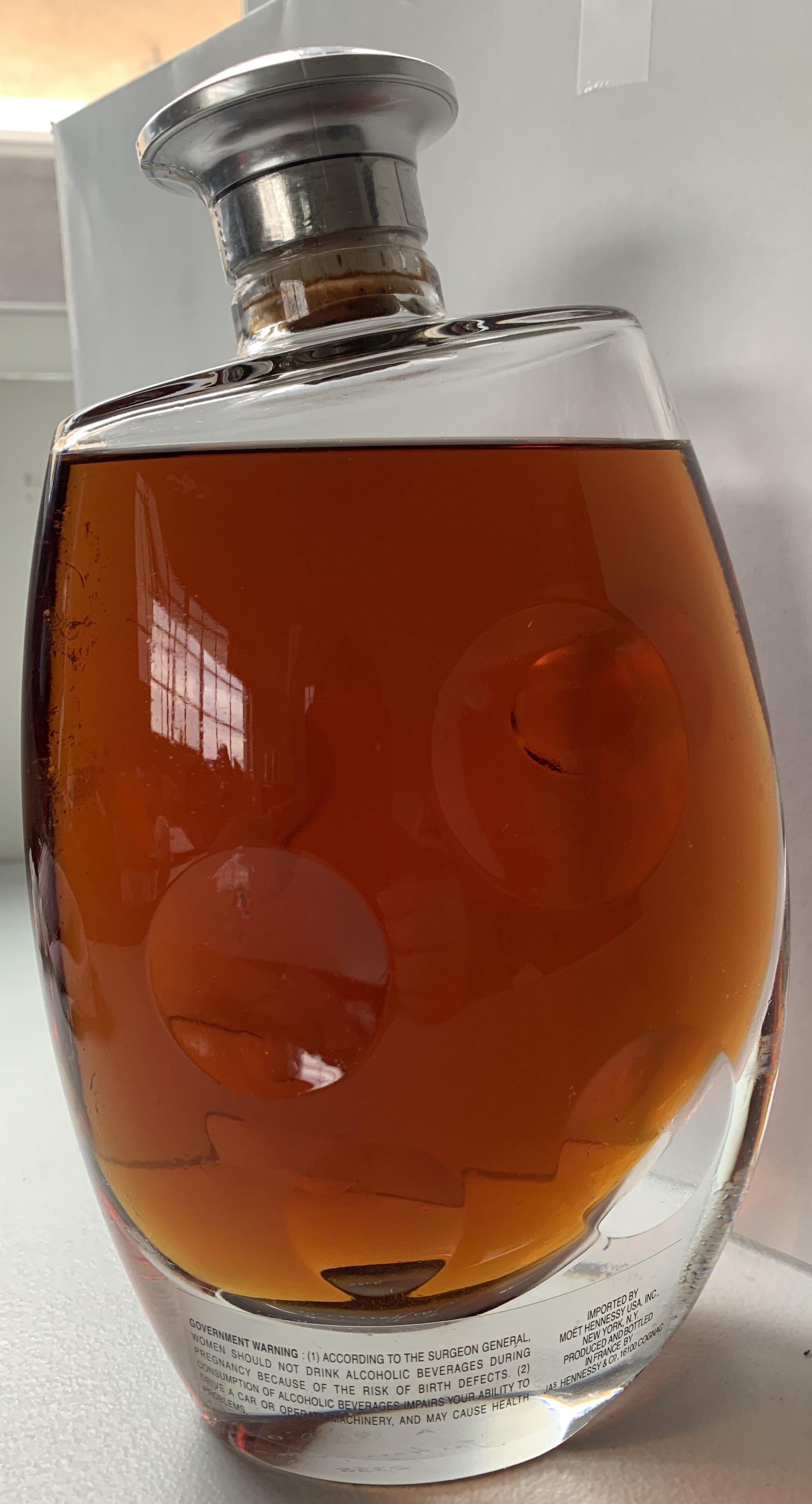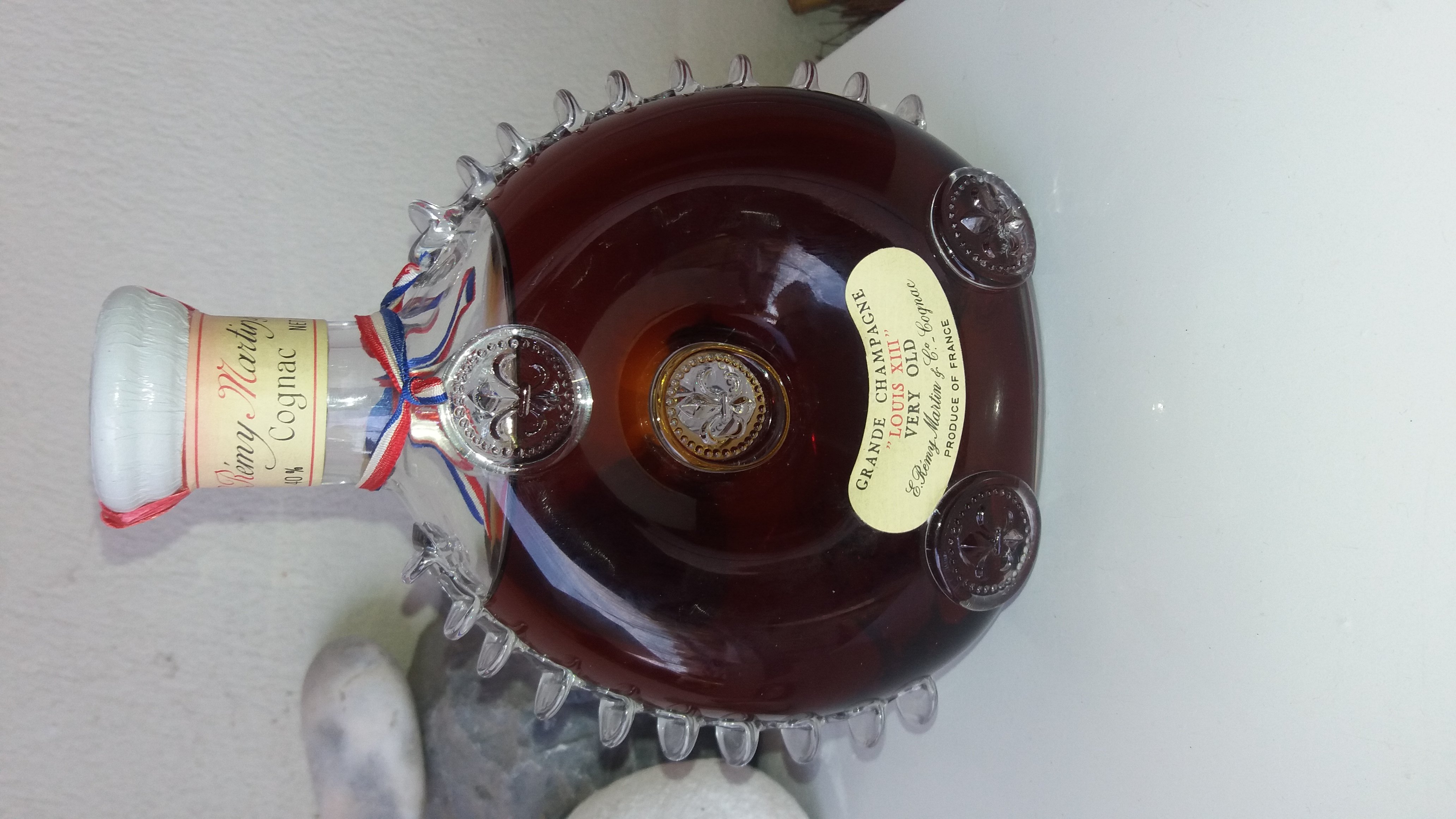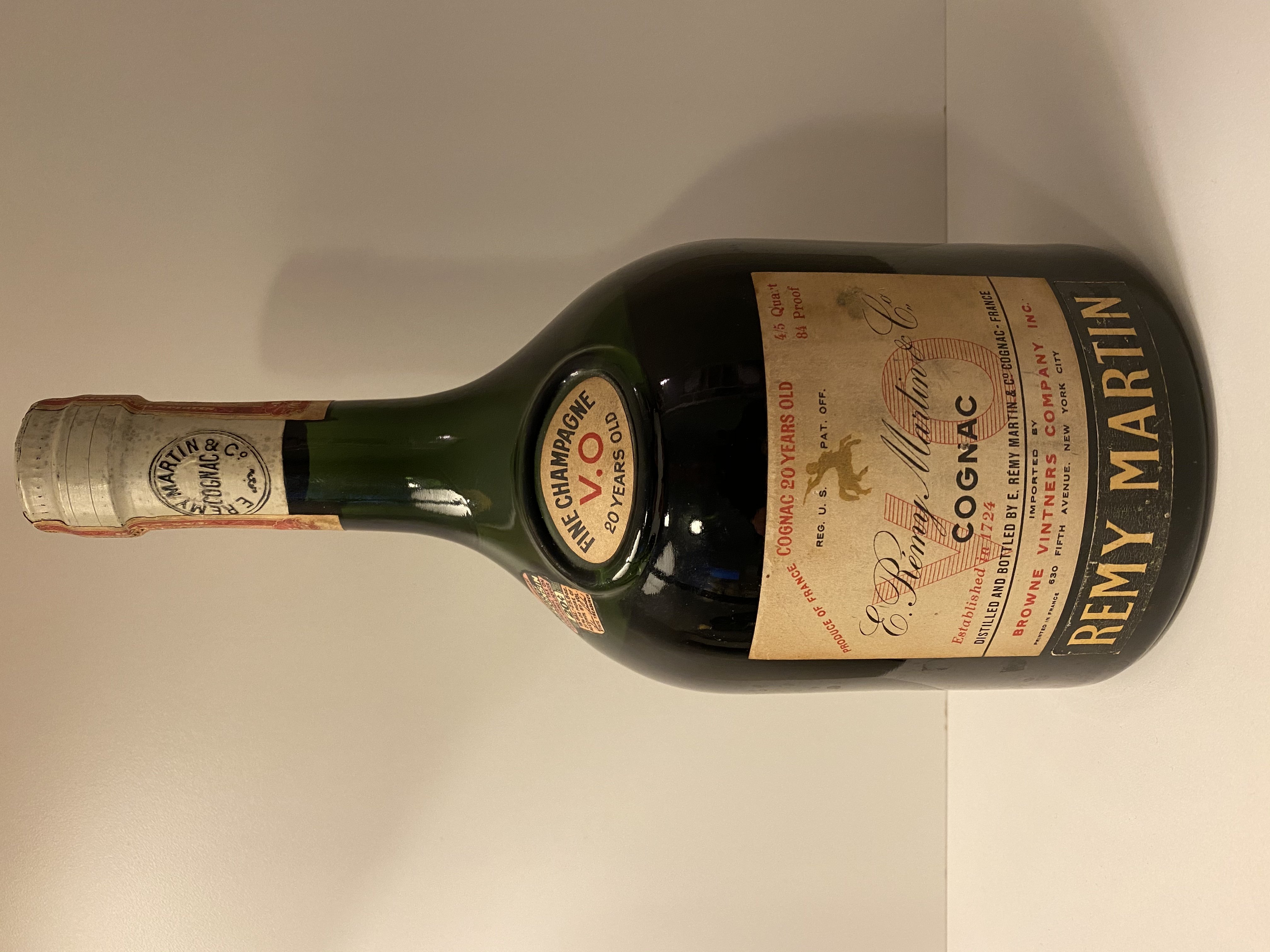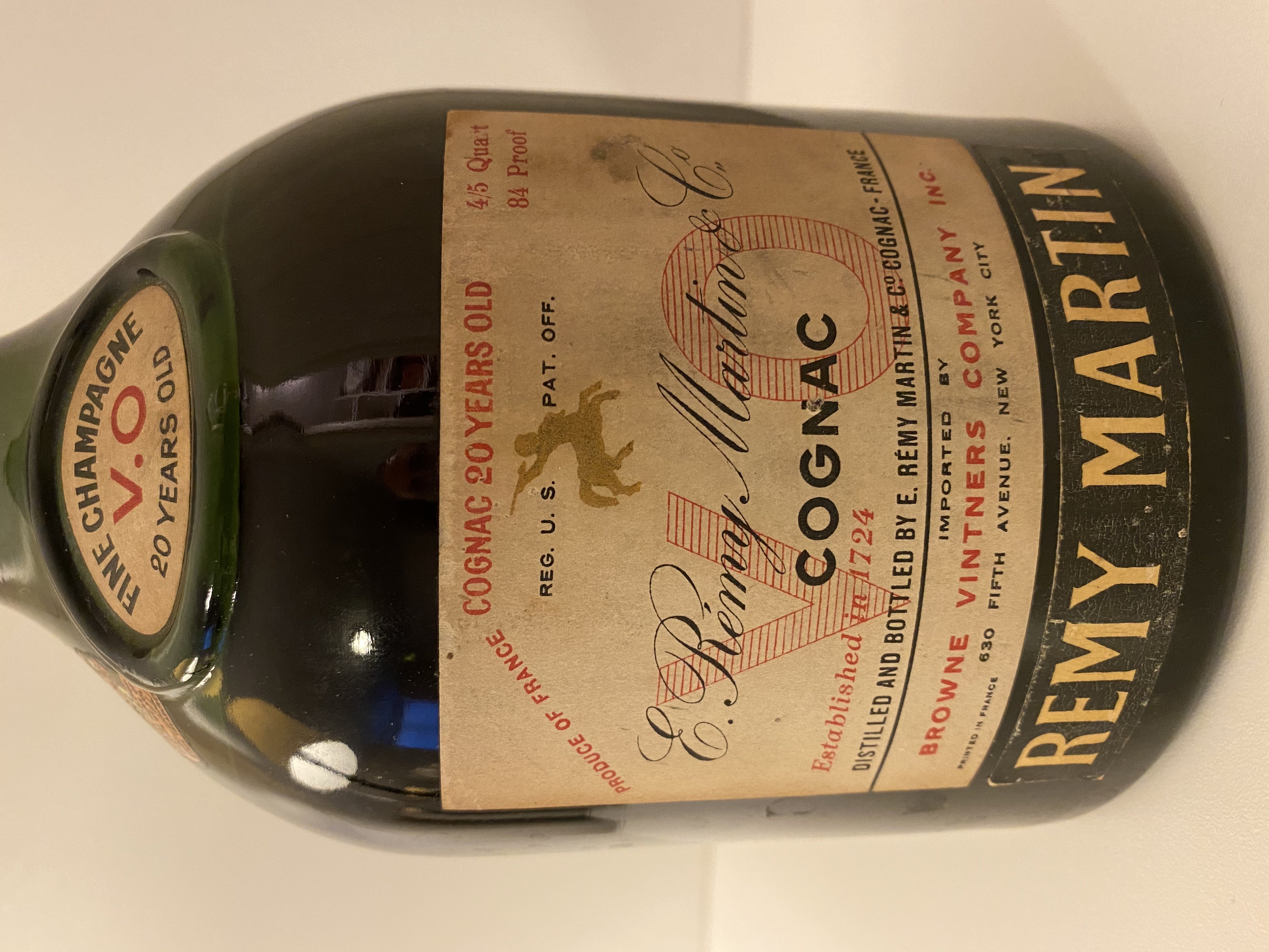 - Front small oval label at neck reads: FINE CHAMPAGNE V.O. 20 YEARS OLD Front large square label at base reads: COGNAC 20 YEARS OLD | PRODUCT OF FRANCE | 4/5 Quart | 84 Proof | REG. U.S. PAT. OFF. | E. Remy Martin & Co. | COGNAC | Established in 1724 | DISTILLED AND BOTTLED BY E. REMY MARTIN & CO. COGNAC - FRANCE | IMPORTED BY BROWNE VINTNERS COMPANY INC. | 630 FIFTH AVENUE, NEW YORK CITY | PRINTED IN FRANCE Front ribbon label at bottom of base reads: REMY MARTIN Back round label reads: This product accompanied at time of importation by an "Acquit Regional Jaune d'Or" issued by the French Government indicating that this grape brandy was distilled in the Cognac Region of France." followed by an E. Remy Martin signature. Additionally, the back of the bottle carries an embossed message in the glass which reads: "Federal Law Forbids Sale or Reuse of this Bottle".