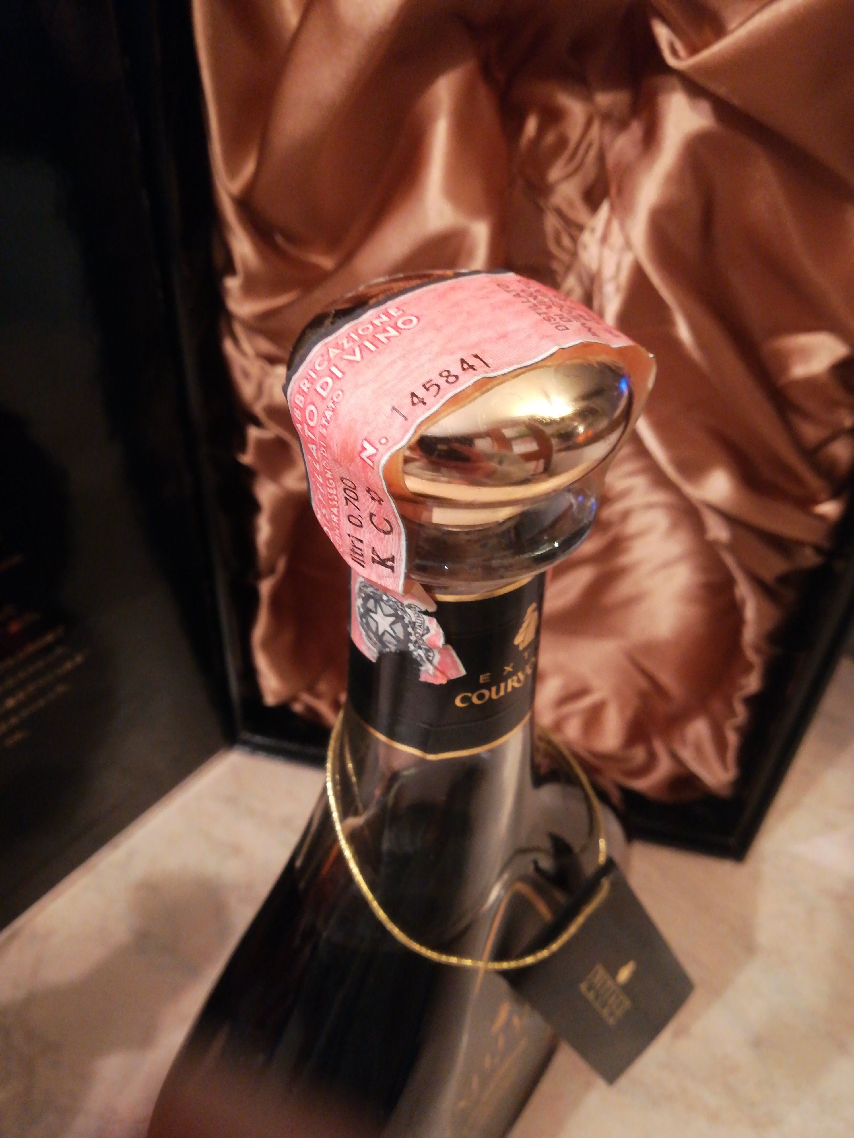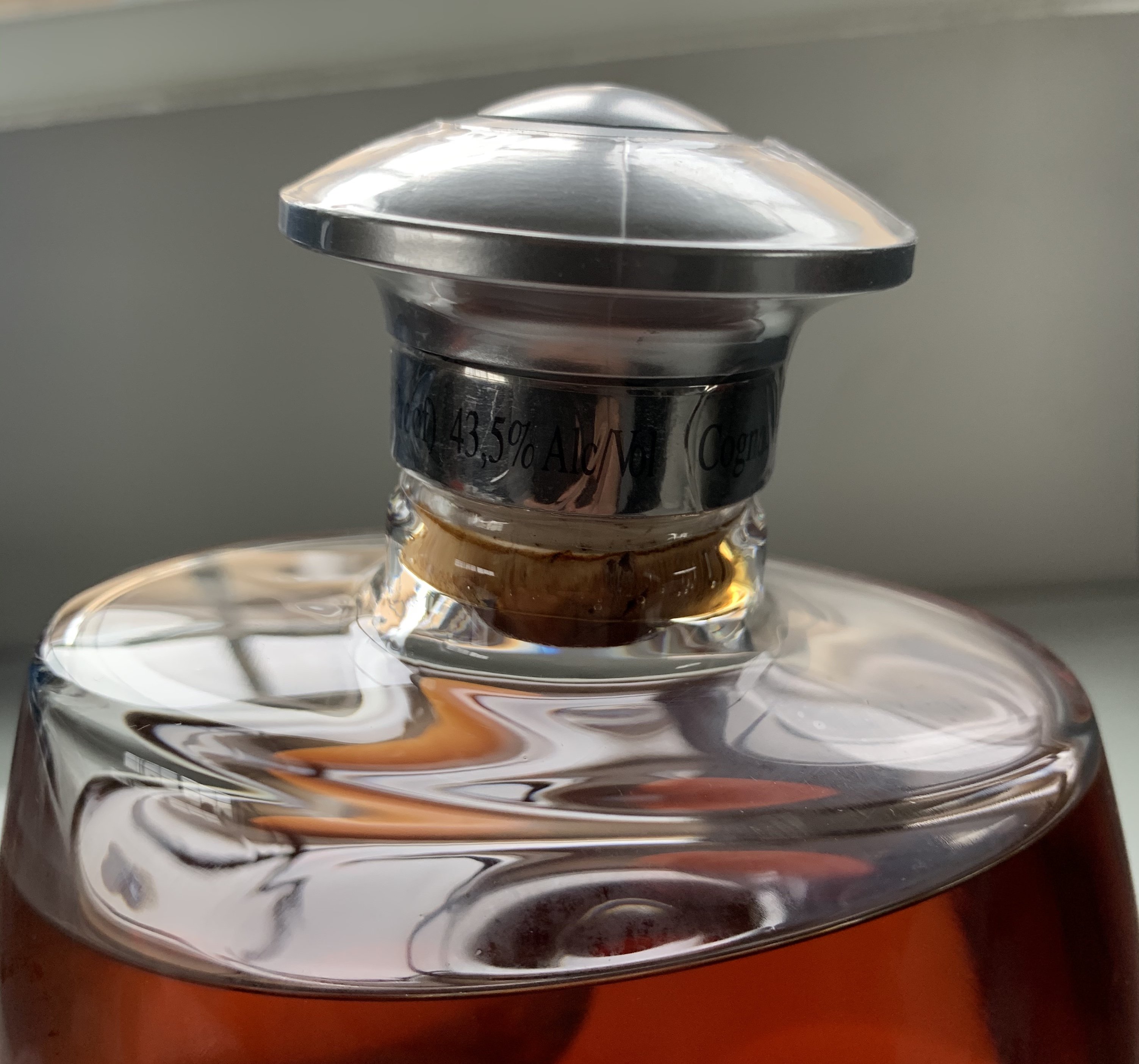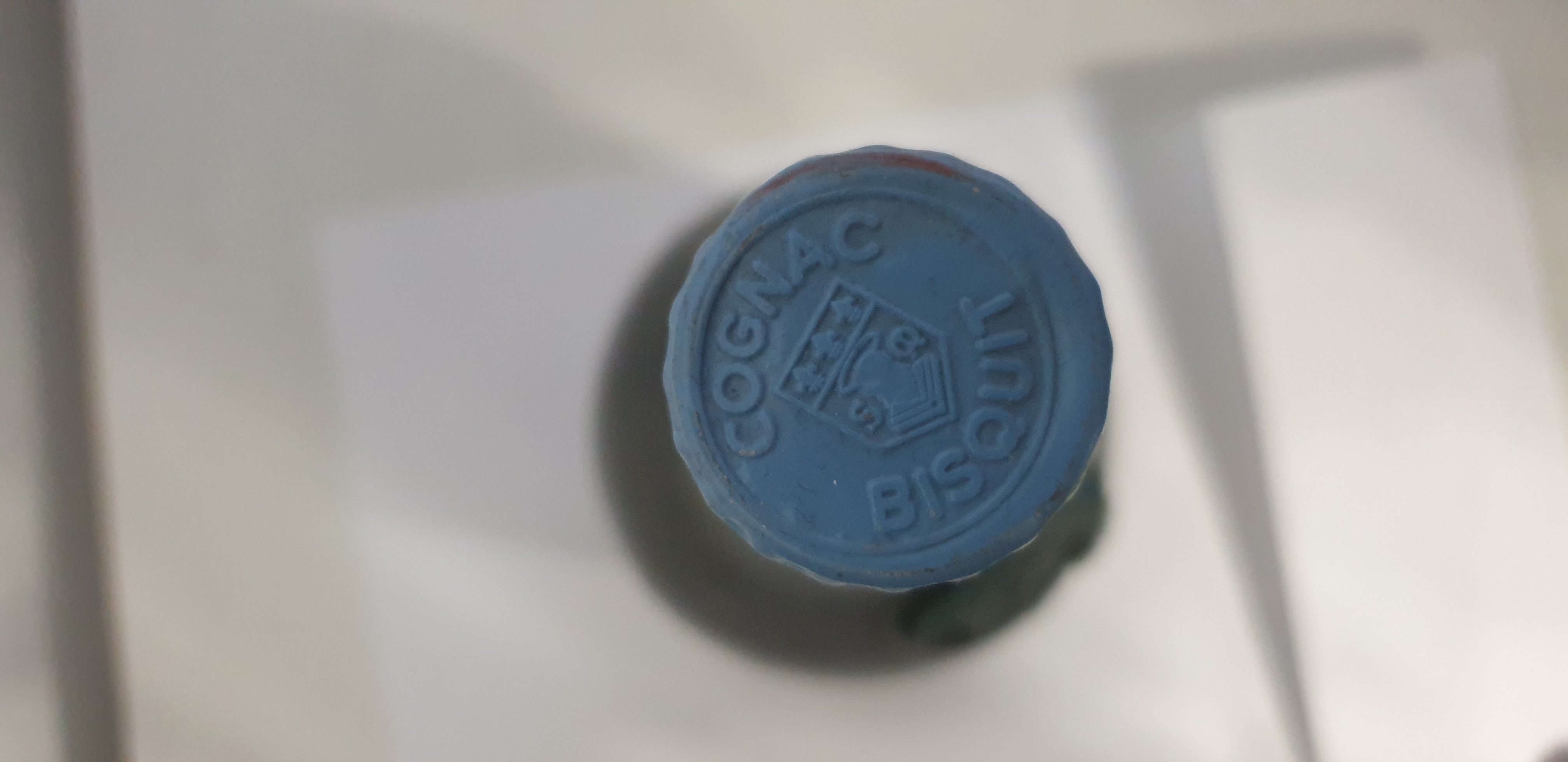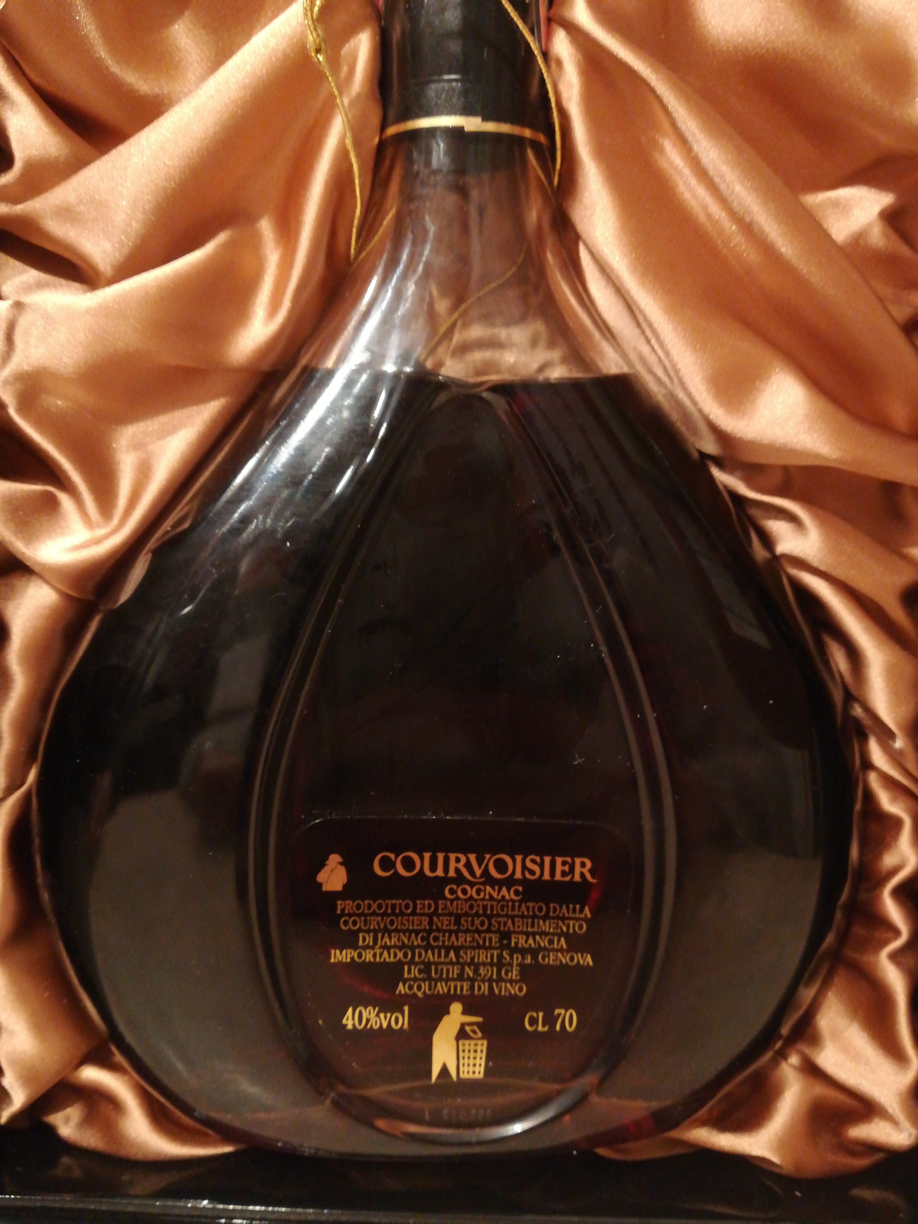 - Green bottle, back: Courvoiser Cognac France, bottom: 70& 8 36 PE Imperial emblem on the neck, Produit de France, Produce of France; *** LUXE on the transparent label Main label: Courvoisier *** Luxe Cognac 40% Le contenu de cette bouteille composé de cognacs (acquit ou cogné jaune d'or) choisis par nosxsoins a assuré a la marque Courvoisier sa réputation mondiale Courvoisier S.A. 18200 Jarnac France 0,79 l Napoleon silhouette in the middle