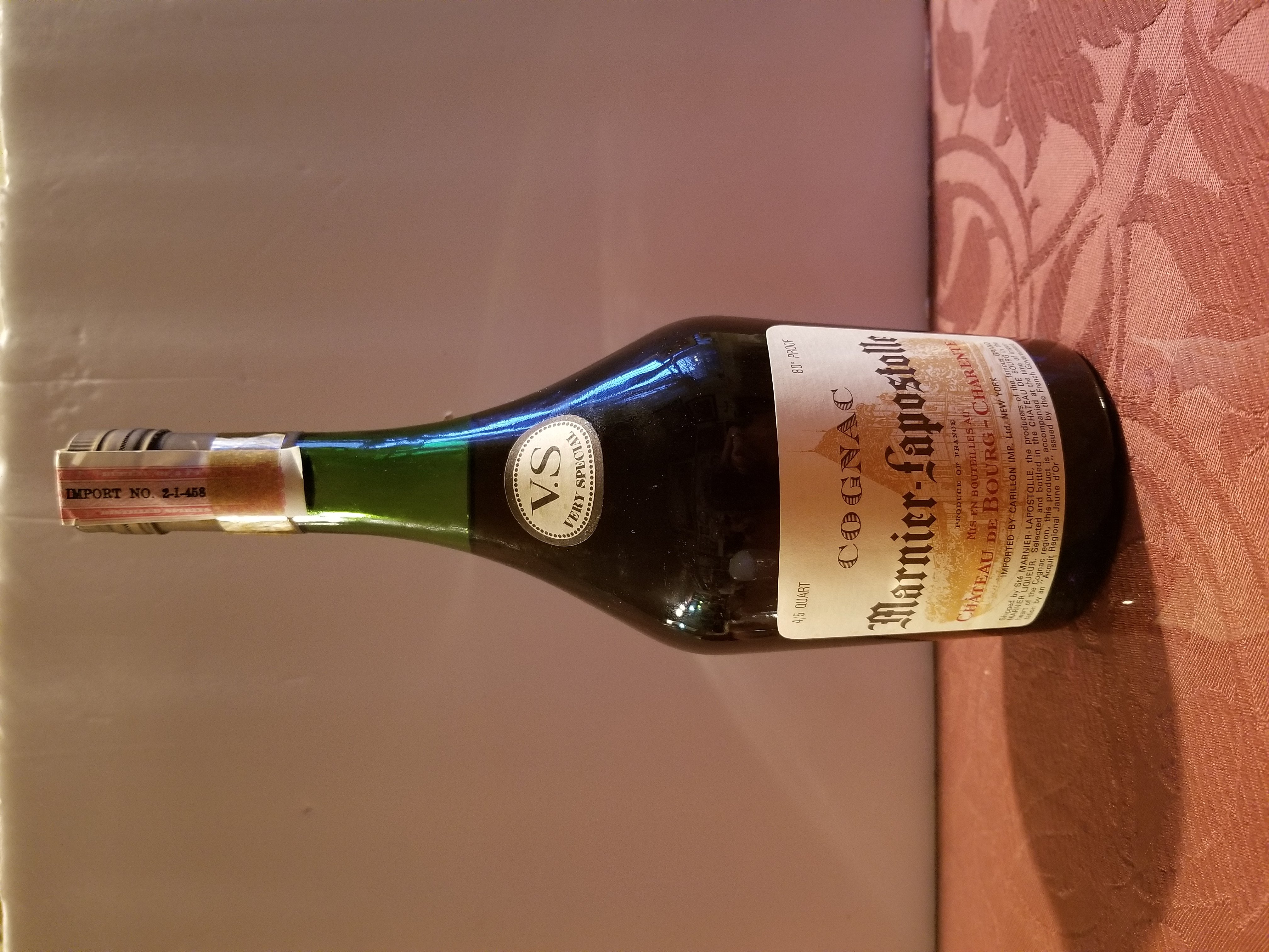 - 4/5 Quart 80° Proof Cognac Marnier-Lapostolle Product of France Mis en Bouteilless au Chateau de Bourg - Charente. Imported by Carillon Imp. Ltd. New York Shipped by Ste MARNIER-LAPOSTOLLE, the producers of the famous GRAND MANIER LIQUEUR. Selected and bottled in the CHATEAU DE BOURG in the heart of the Cognac region, this product is accompanied at the time of importation by an "Acquit Regional Jaune d'Or" issued by the French Government.