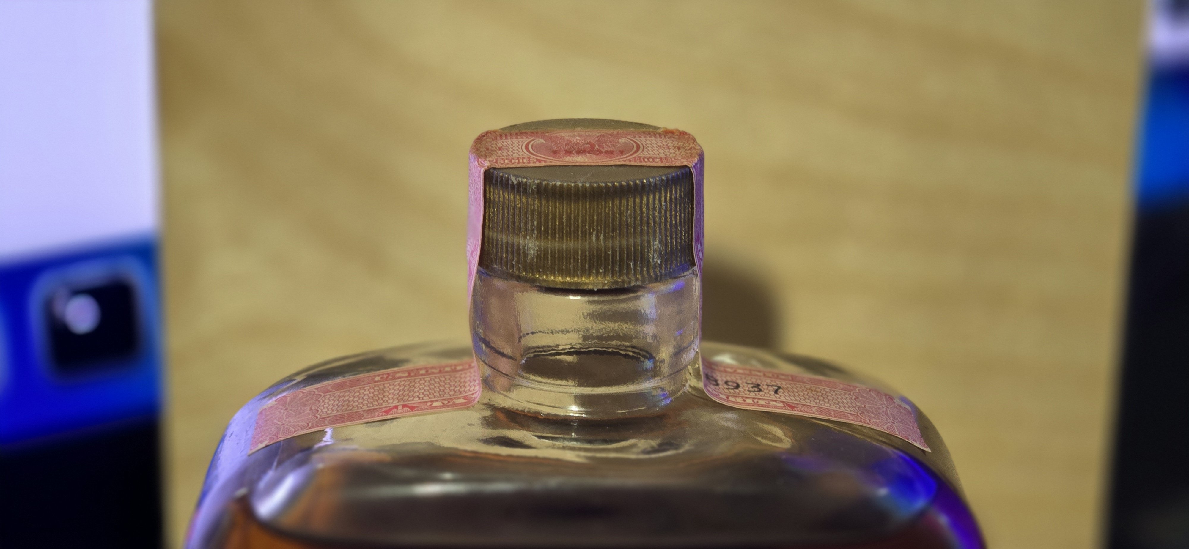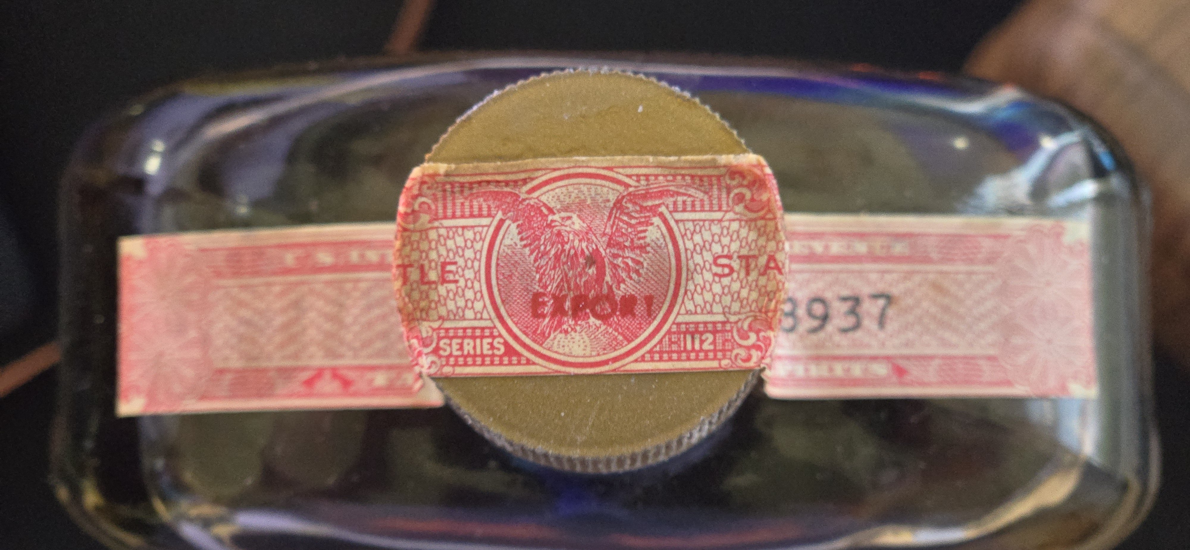 - Front Label: Seagram’s Crown Royal, Fine De Luxe, Blended Canadian Whisky, A PRODUCT OF, Joseph & Seagram & Sons, Limited, WATERLOO · ONTARIO · CANADA, 25 FL. OZ. LIQ., 710 ml, 40% ALC./VOL. Neck Label/Paper Seal: Tax information including the year 1968 and serial number B3533631. Cap: Embossed with Crown Royal logo.