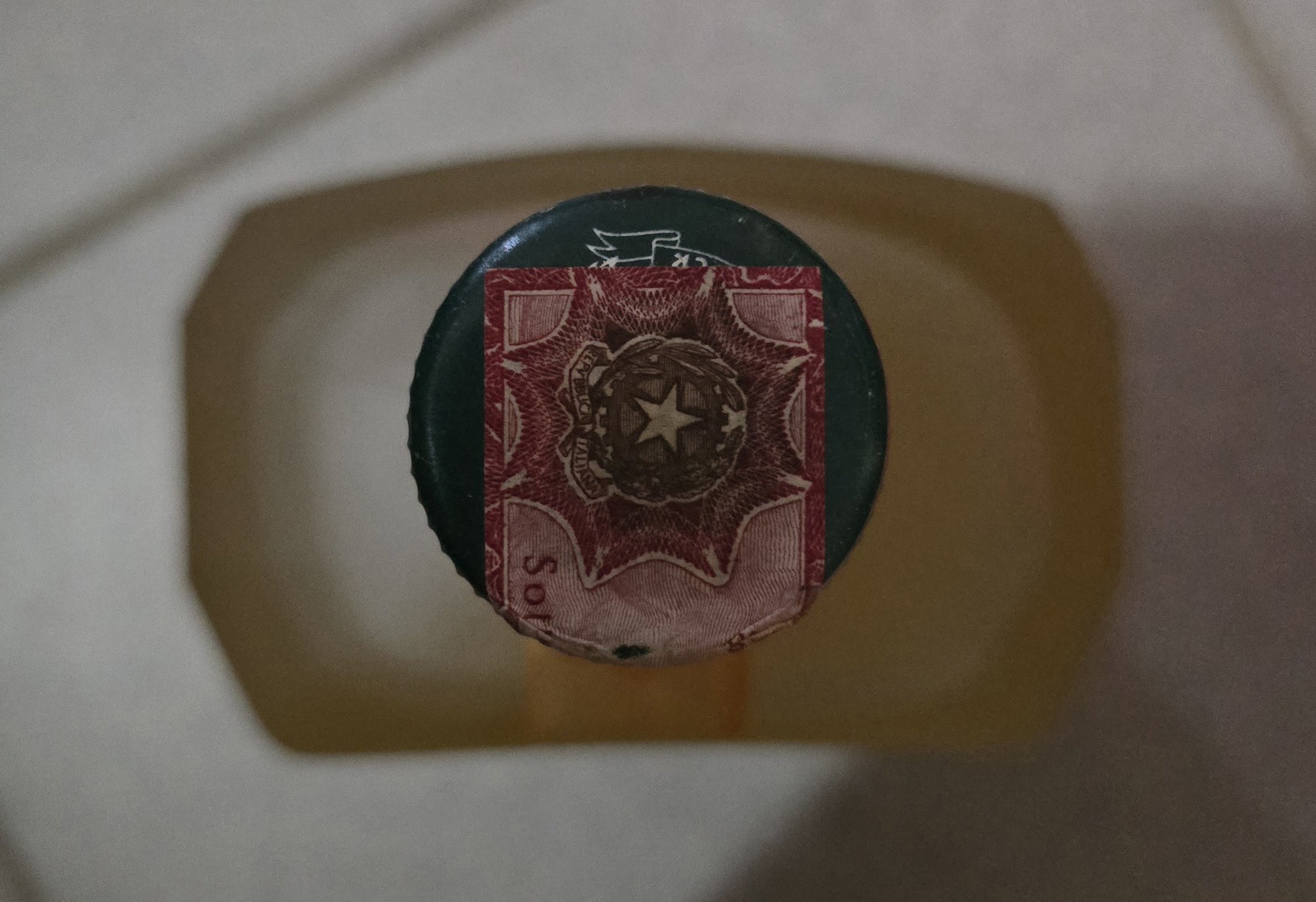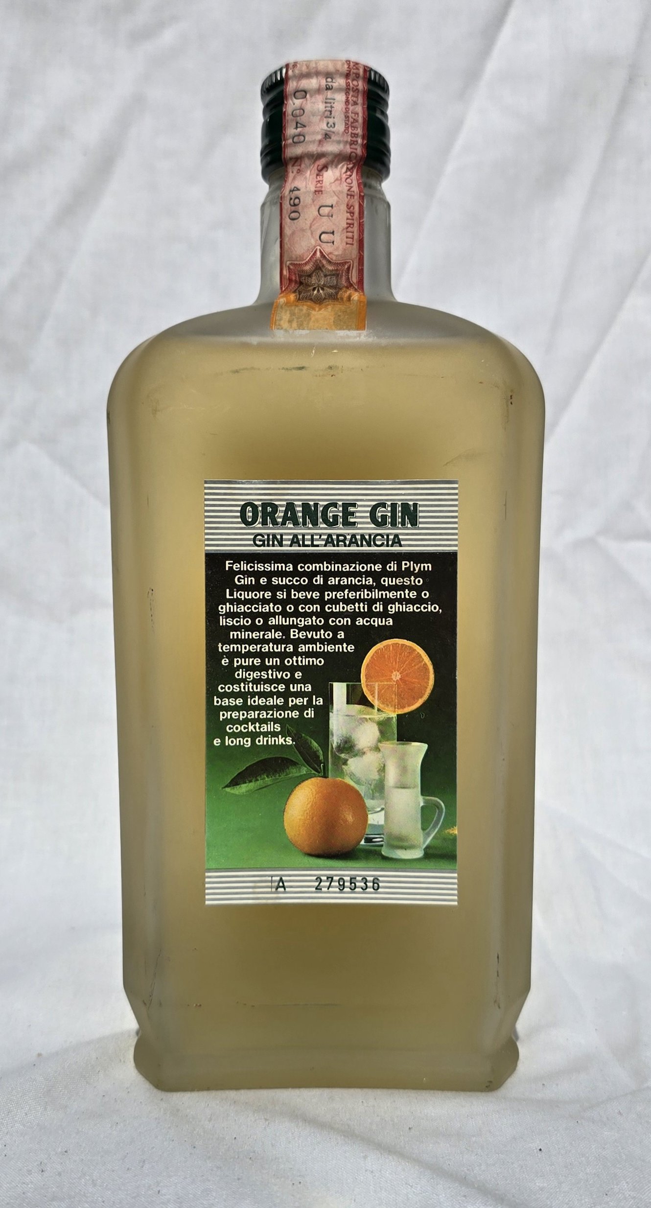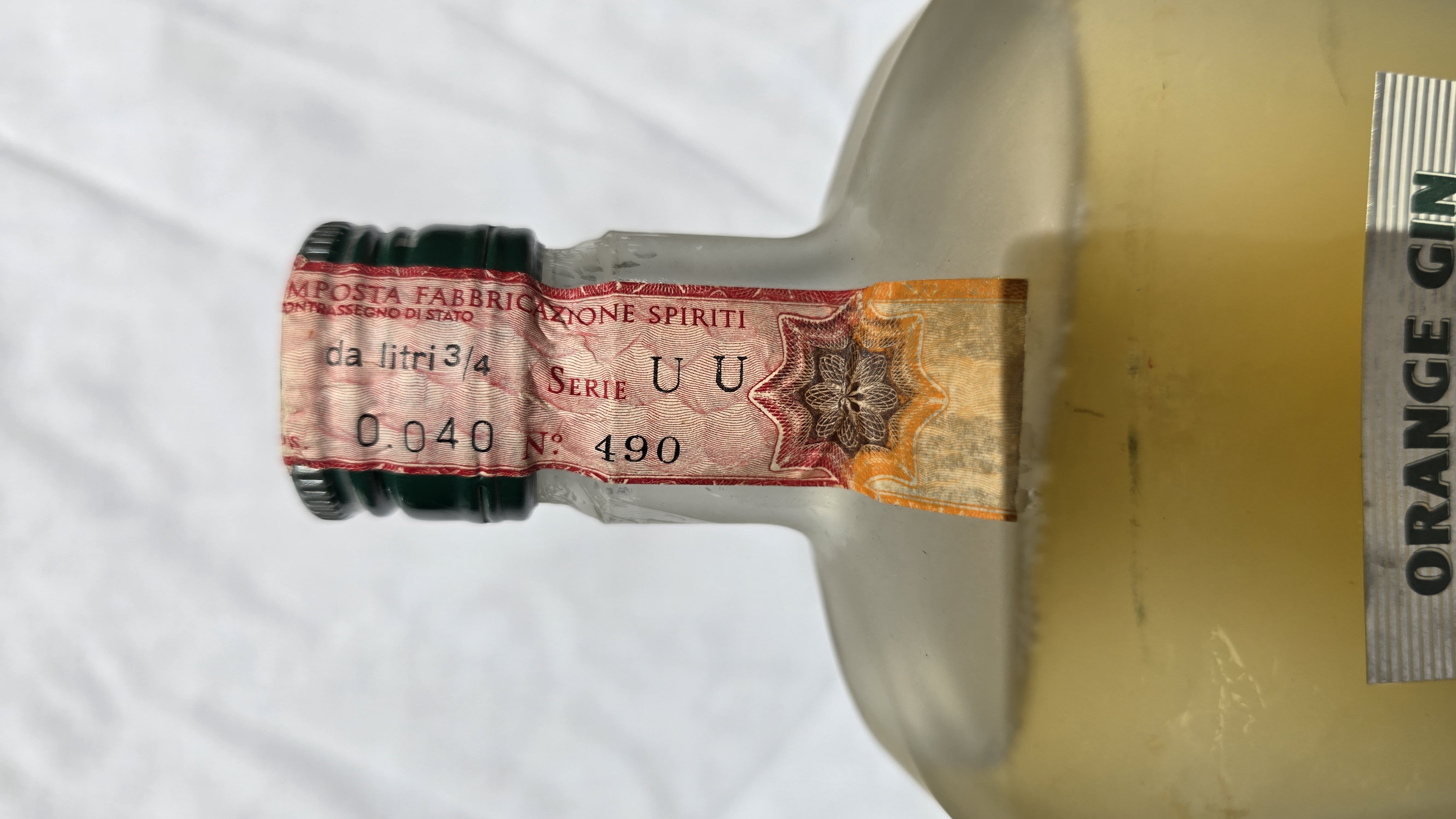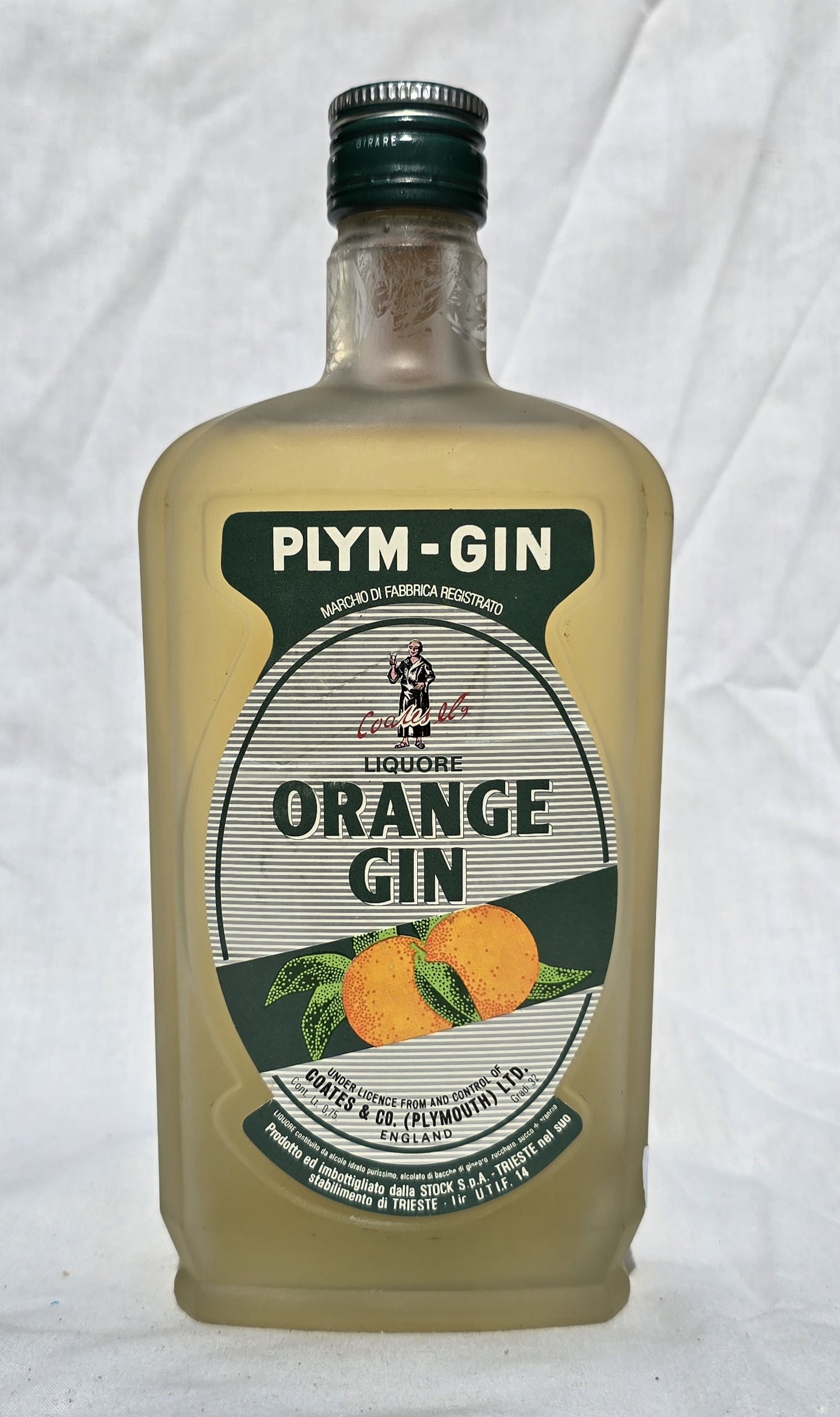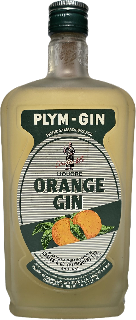 - 1) Text on label: Front Label: PLYM-GIN MARCHIO DI FABBRICA REGISTRATO Coates & Co. LIQUORE ORANGE GIN UNDER LICENCE FROM AND CONTROL OF COATES & CO. (PLYMOUTH) LTD. ENGLAND Cod. 02-19-75 Cod. 82 Prodotto ed imbottigliato dalla STOCK S.P.A. - TRIESTE nei suoi Stabilimenti di TRIESTE - N° U.T.I.F. 44 Back Label: ORANGE GIN GIN ALL'ARANCIA Felicissima combinazione di Plym Gin dal gusto al naturale. Liquore si beve preferibilmente o ghiacciato o in cubetti di ghiaccio, liscio o allungato con acqua minerale. Bevuto a temperatura ambiente è pure un ottimo digestivo e costituisce una base ideale per la preparazione di cocktails e long drinks. A 279536 Neck/Cap: GIRARE (on top of the cap) IMPOSTA FABBRICAZIONE SPIRITI (on neck band, partially visible) 0.040 l/tm3 (on neck band) SERIE UU (on neck band) 490 (on neck band) 2) Visual elements: Cap: Dark green ribbed screw cap. Neck/Capsule: A red and orange tax band wraps around the neck and over the top of the cap. It features an ornate central star emblem with a five-pointed star surrounded by intricate patterns. Front Label: Trapezoidal label with a dark green top banner ("PLYM-GIN") and bottom banner (licensing/bottling info). The central oval section has horizontal grey and white stripes. It features a stylized illustration of a man (possibly a sailor) standing on a barrel, holding a glass, above a cursive "Coates & Co." logo. Below this, two realistic oranges with leaves are depicted against a dark green background. Back Label: Rectangular label with an illustration of a glass of gin with ice and an orange slice, a pitcher of liquid, and a whole orange, set against a green background with a light blue top border. Font styles: The main product name "PLYM-GIN" and "ORANGE GIN" use bold sans-serif block letters. "MARCHIO DI FABBRICA REGISTRATO" and other small texts are sans-serif. The "Coates & Co." logo is in a cursive/script style. "LIQUORE" is in a serif font. The descriptive text on the back label primarily uses a serif font. 3) Fill level estimate: well above shoulder into neck: great
