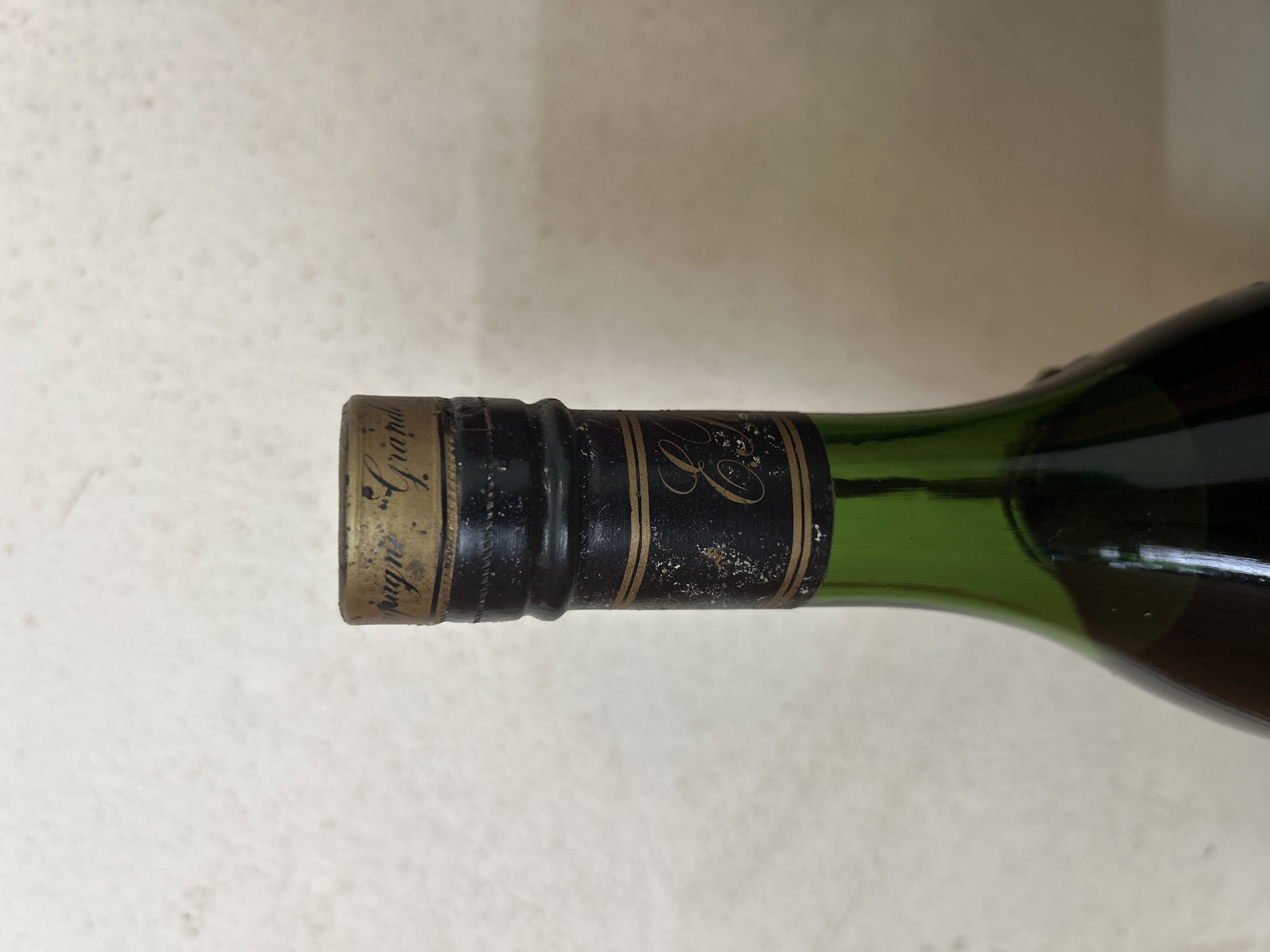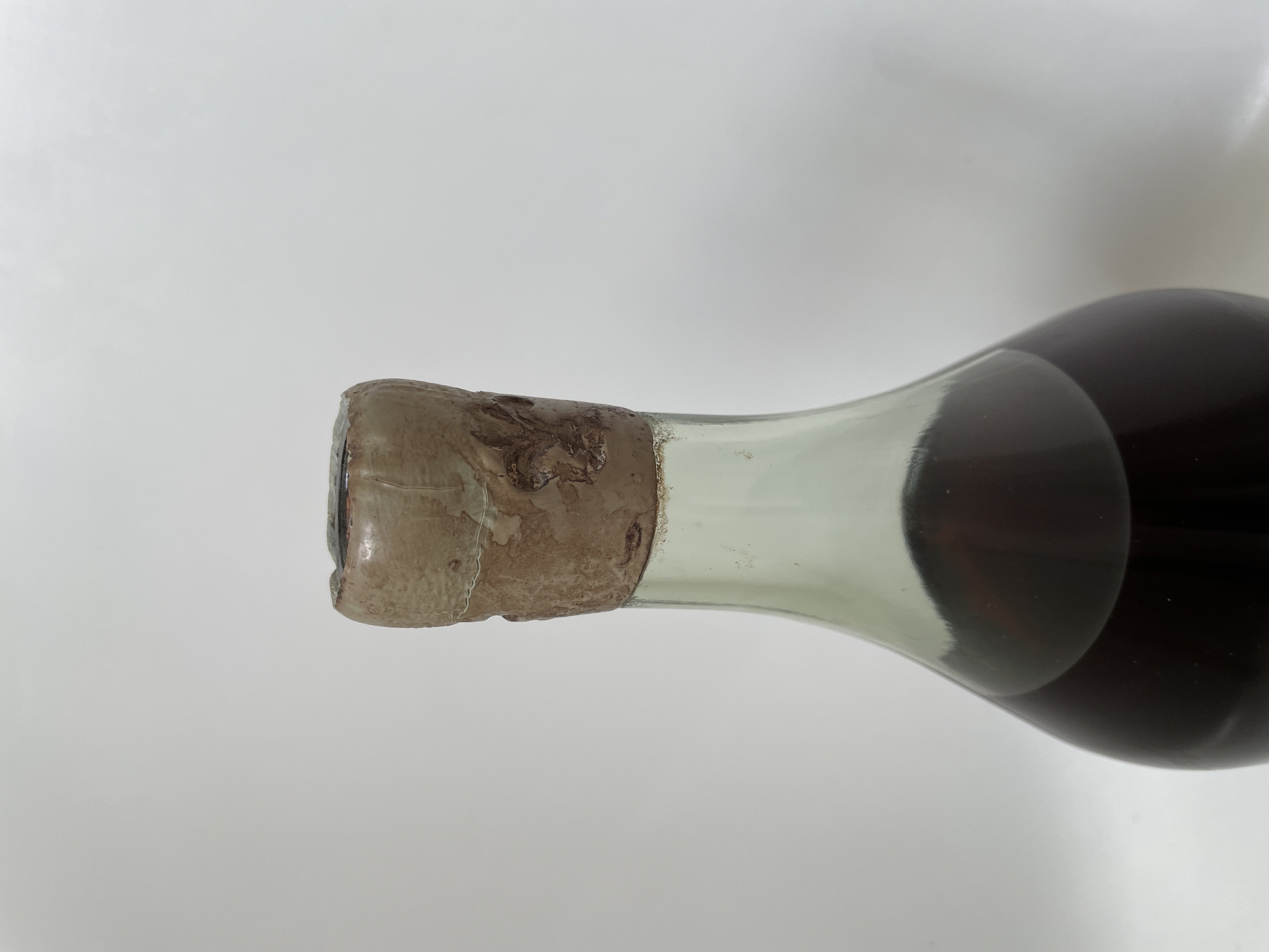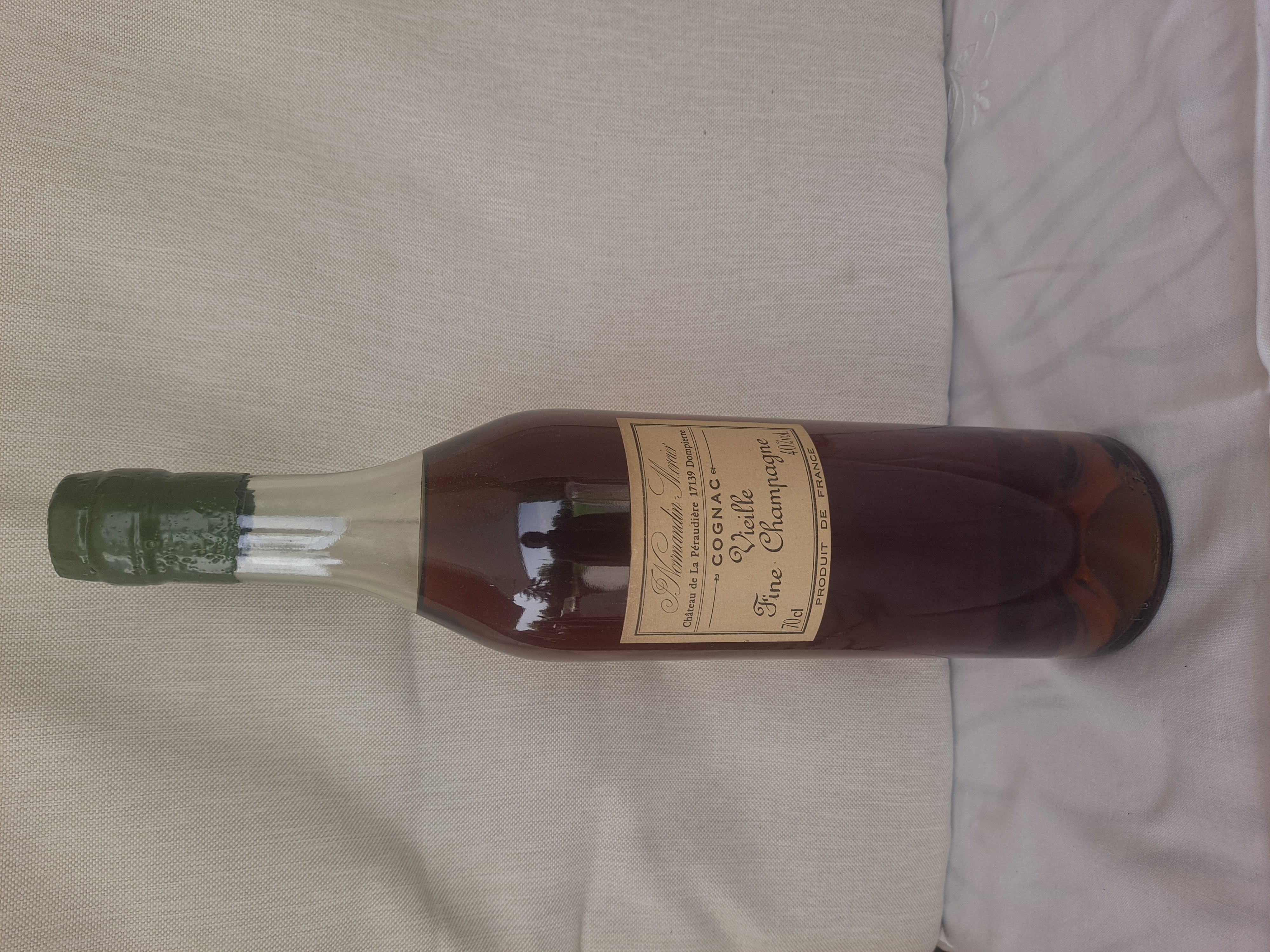 - 1) Text on label: Grande Champagne APPELLATION CONTROLEE — Héritiers Marquis du Lys R. BONNET & C° BOUGIVAL FRANCE 2) Visual elements: Emblem: A circular, grey-blue wax medallion with a raised fleur-de-lis design appears on the upper label. Capsule/Closure: The cork and upper neck are covered by a light brown, textured wax seal, which includes a faint, raised design on top. Label: The main label has a rustic, rough-hewn texture, resembling aged wood or bark, with irregular edges. Font styles: "Grande Champagne" uses a decorative cursive script. "APPELLATION CONTROLEE" and "R. BONNET & C° BOUGIVAL FRANCE" use a block/sans-serif font. "Héritiers Marquis du Lys" uses a serif font. 3) Fill level estimate: below shoulder: not that good