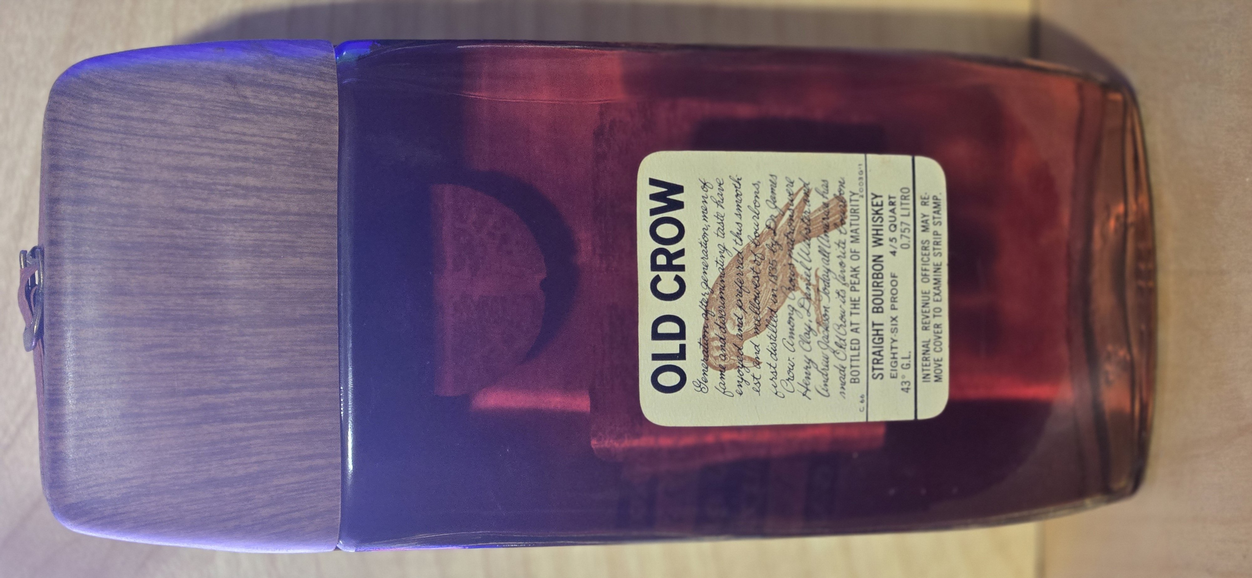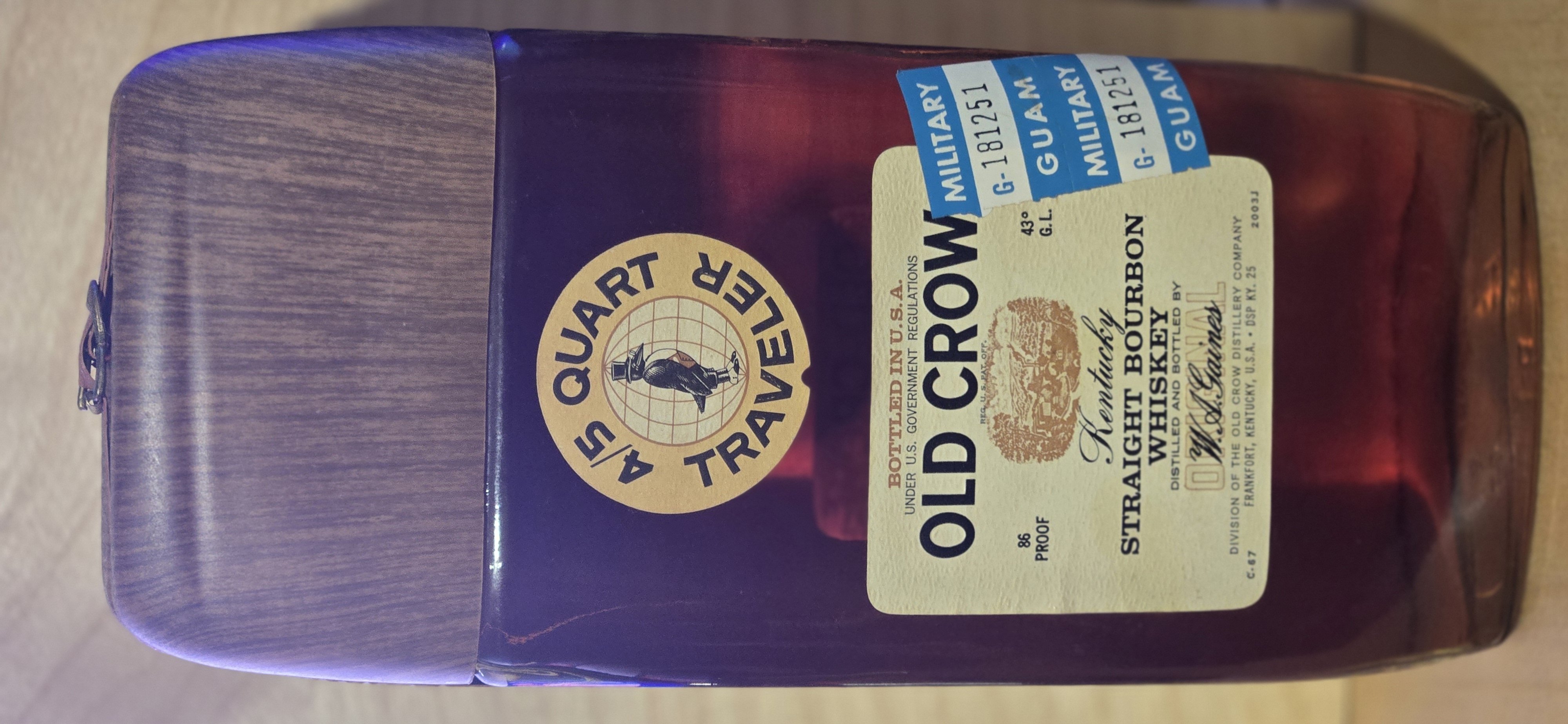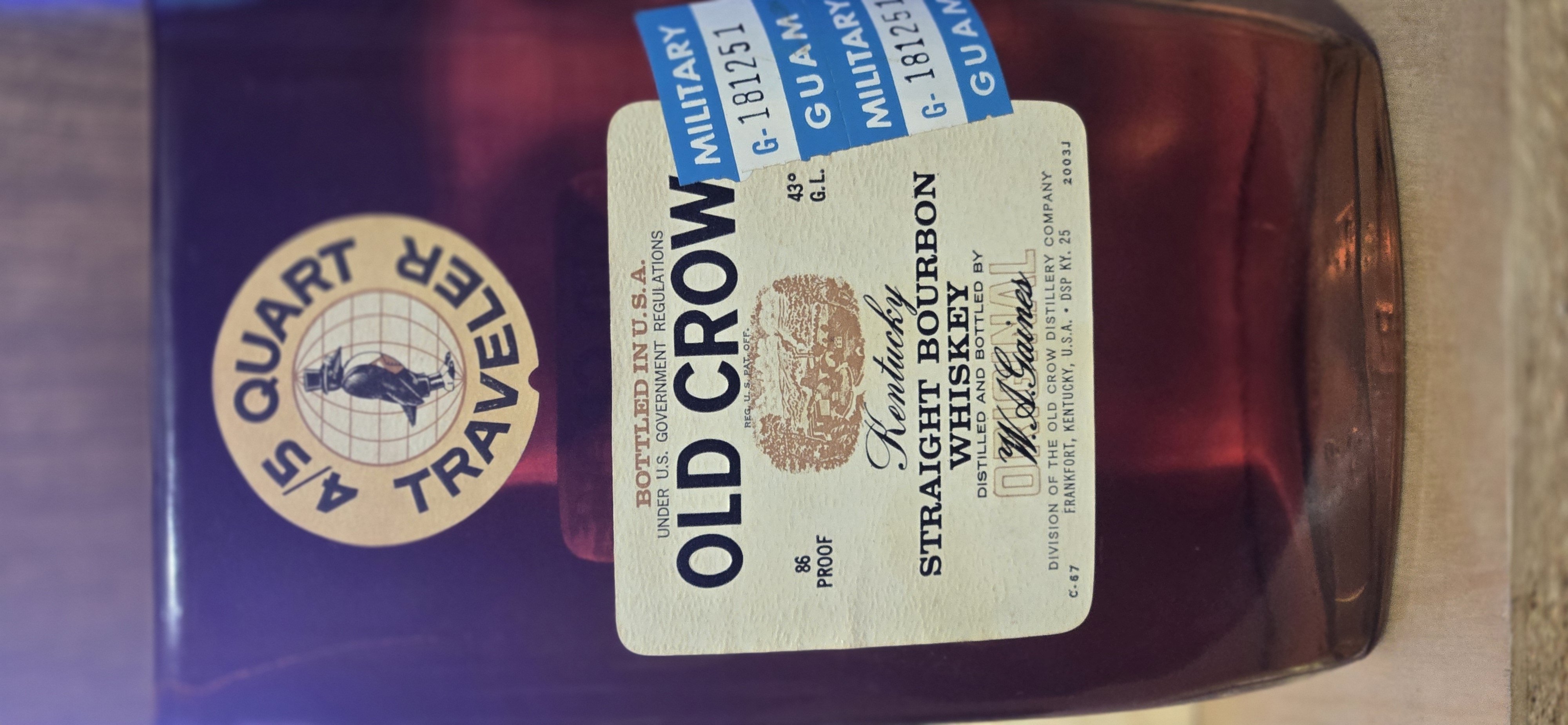 - 1st label is circular, 4/5 Quart Traveler, picture of crow in middle 2nd label, Bottled in U.S.A. under U.S. Government Regulations, OLD CROW, 86 PROOF, 43 G.L., Kentucky Straight Bourbon Whiskey distilled and bottled by W.A. Gaines, Division of the Old Crow distillery Company, Frankfort, Kentucky, U.S.A. DSP KY. 25 C-67. 2003J