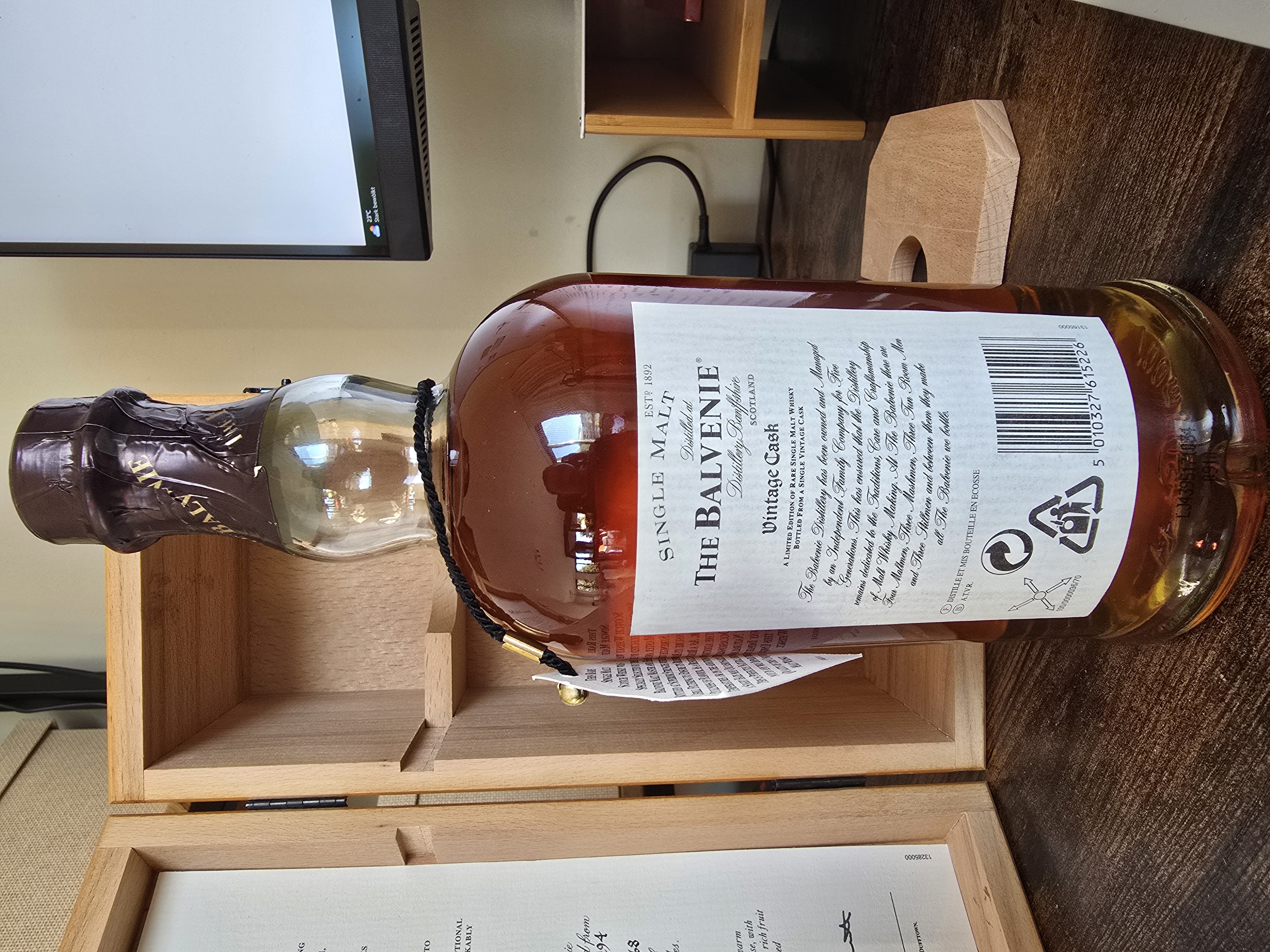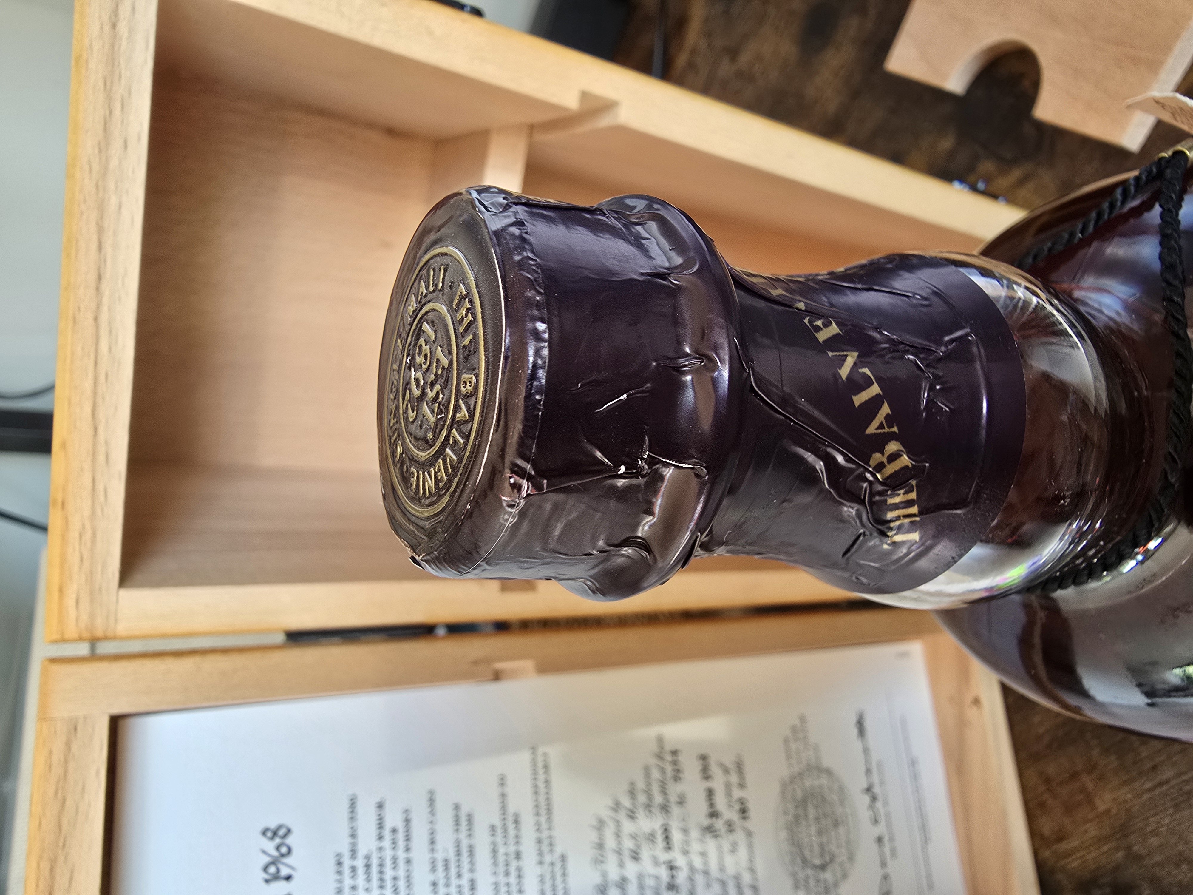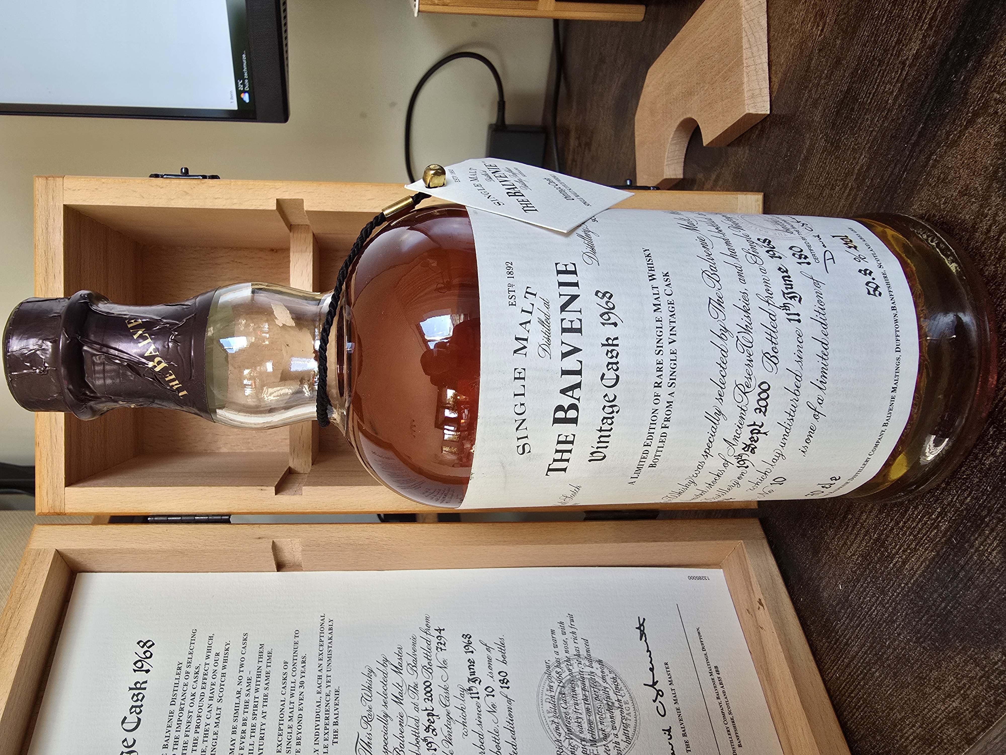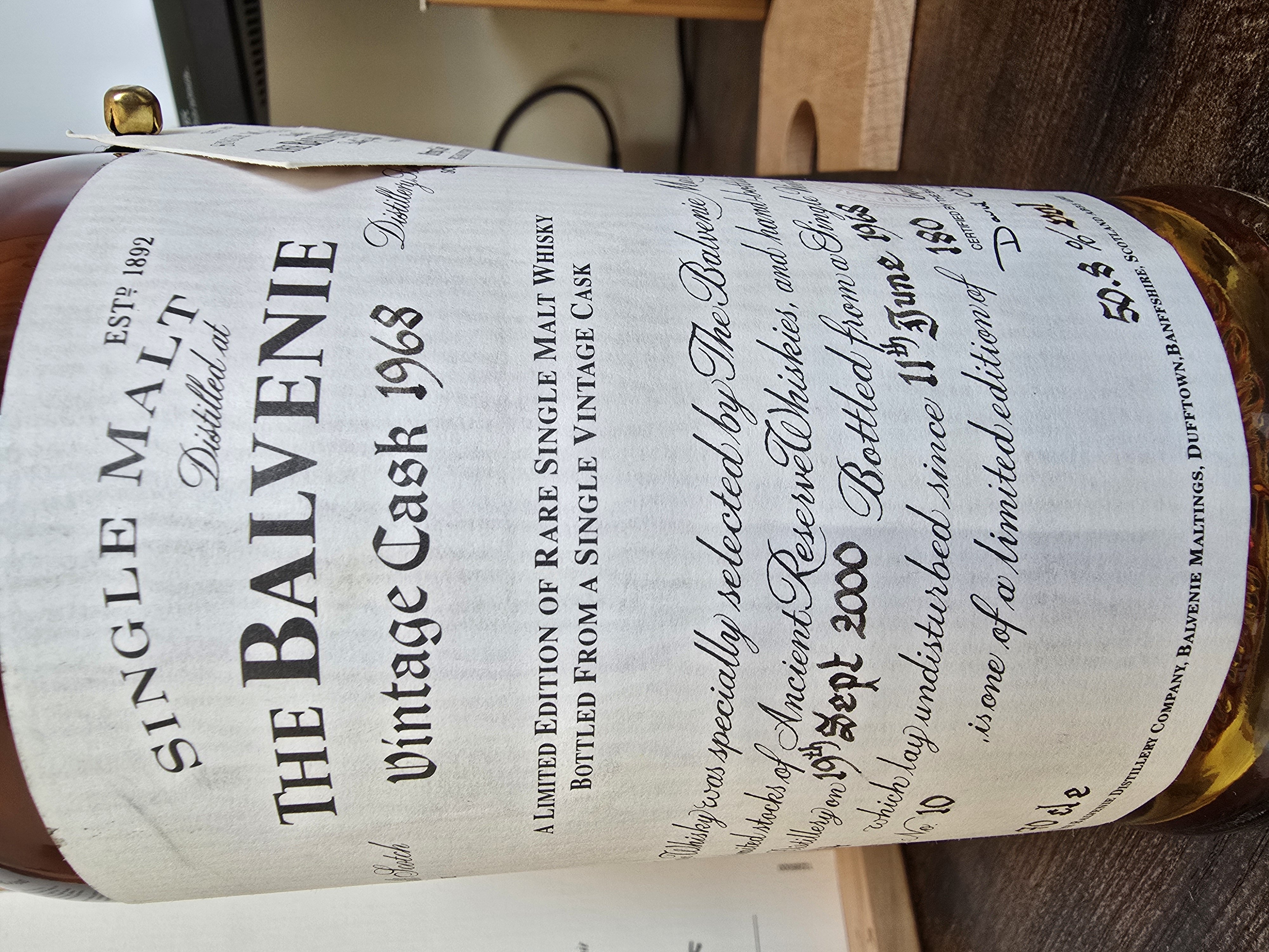 - This rare whisky was specially selected by the Balvenie Malt Master, from our limited stocks of ancient reserve whiskies and hand bottled at the Balvenie distillery, on the 19th September 2000. Bottled from a single vintage cask, number 7294. Which lay undisturbed since 11th June 1968. This bottle number 10, is one of a limited edition of 180 bottles.
