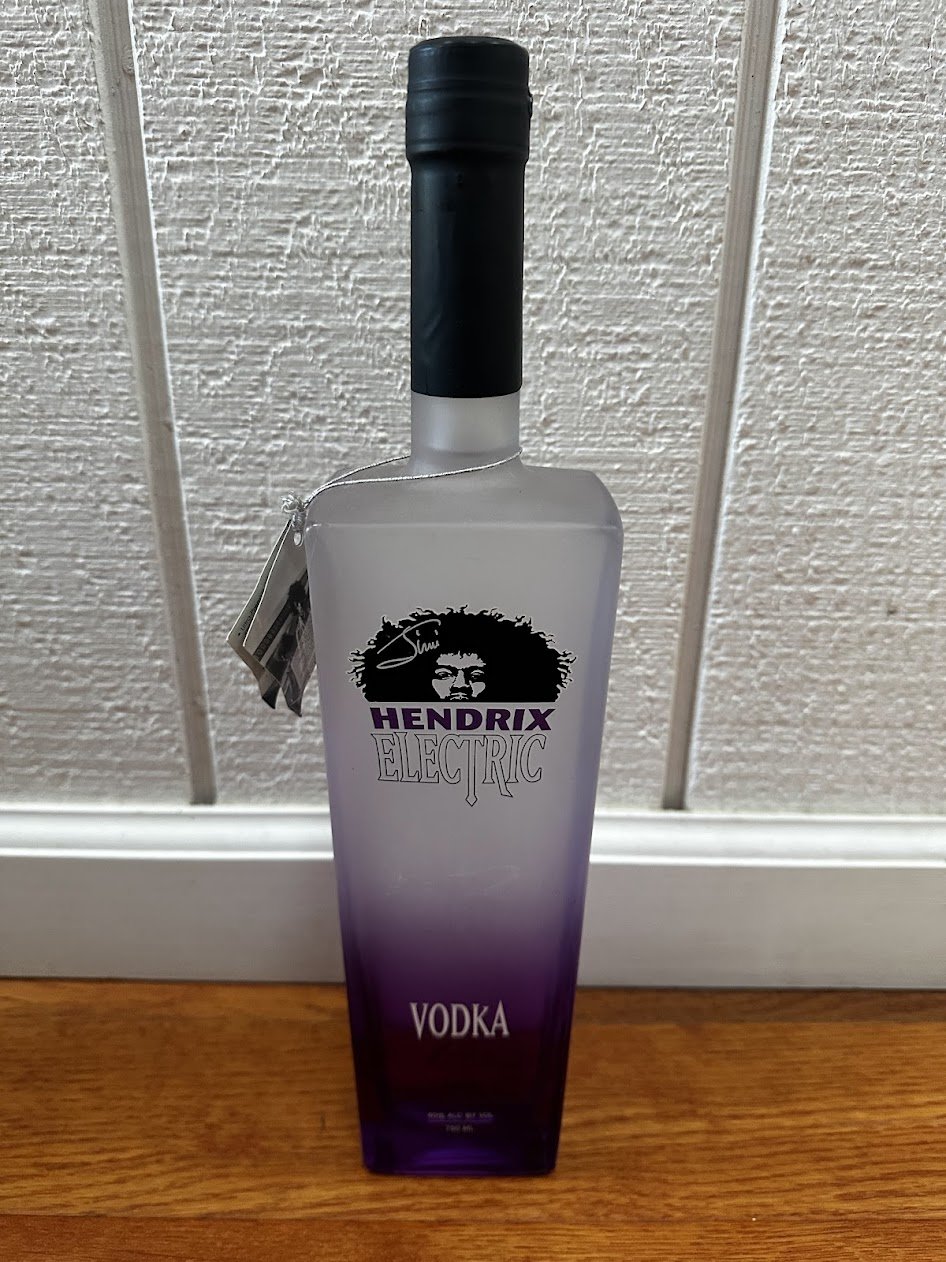 - "Jimi" "Hendrix Electric" "Vodka" "Bottled By Distilled Resources Inc" "houseofhendrix.com"